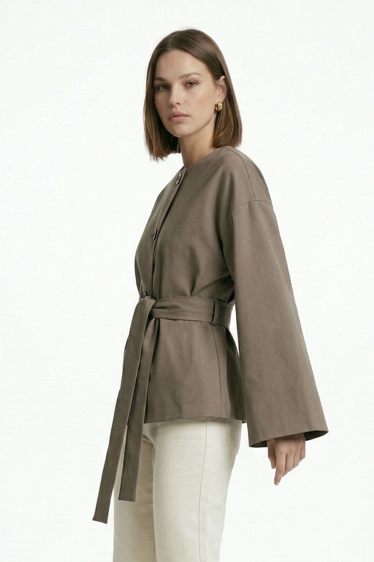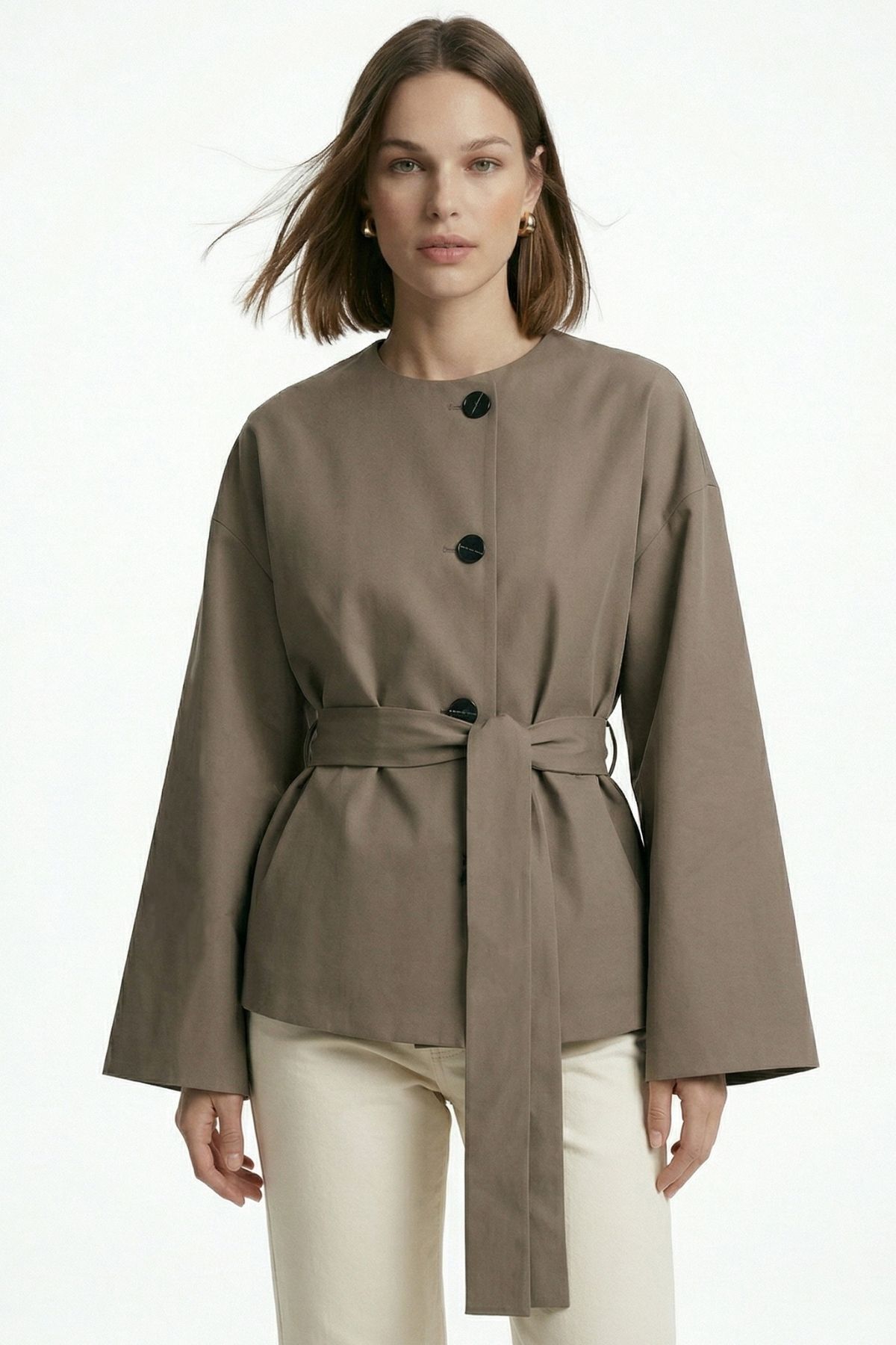 Haki Regular Fit Bisiklet Yaka Kuşaklı Ceket 7672