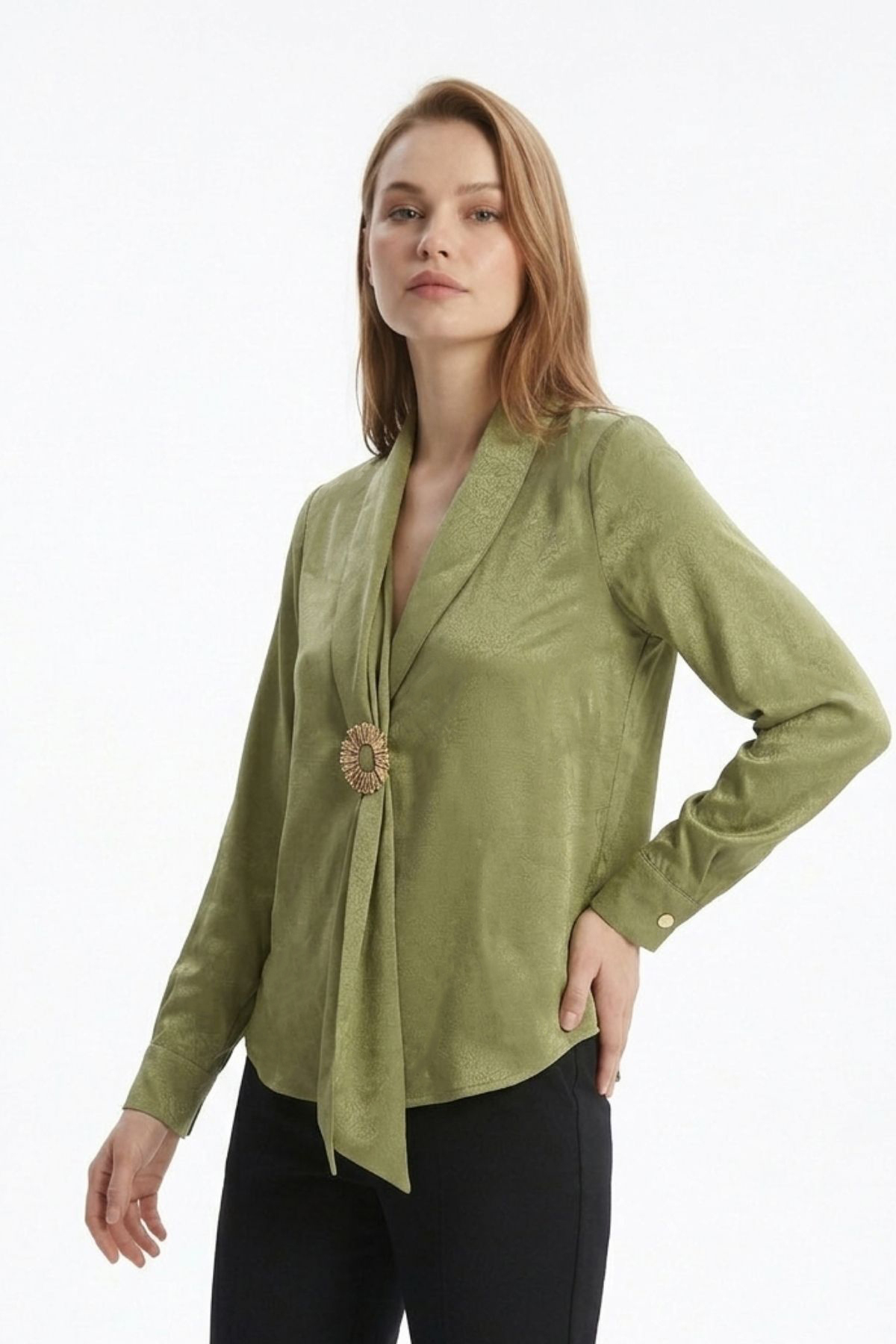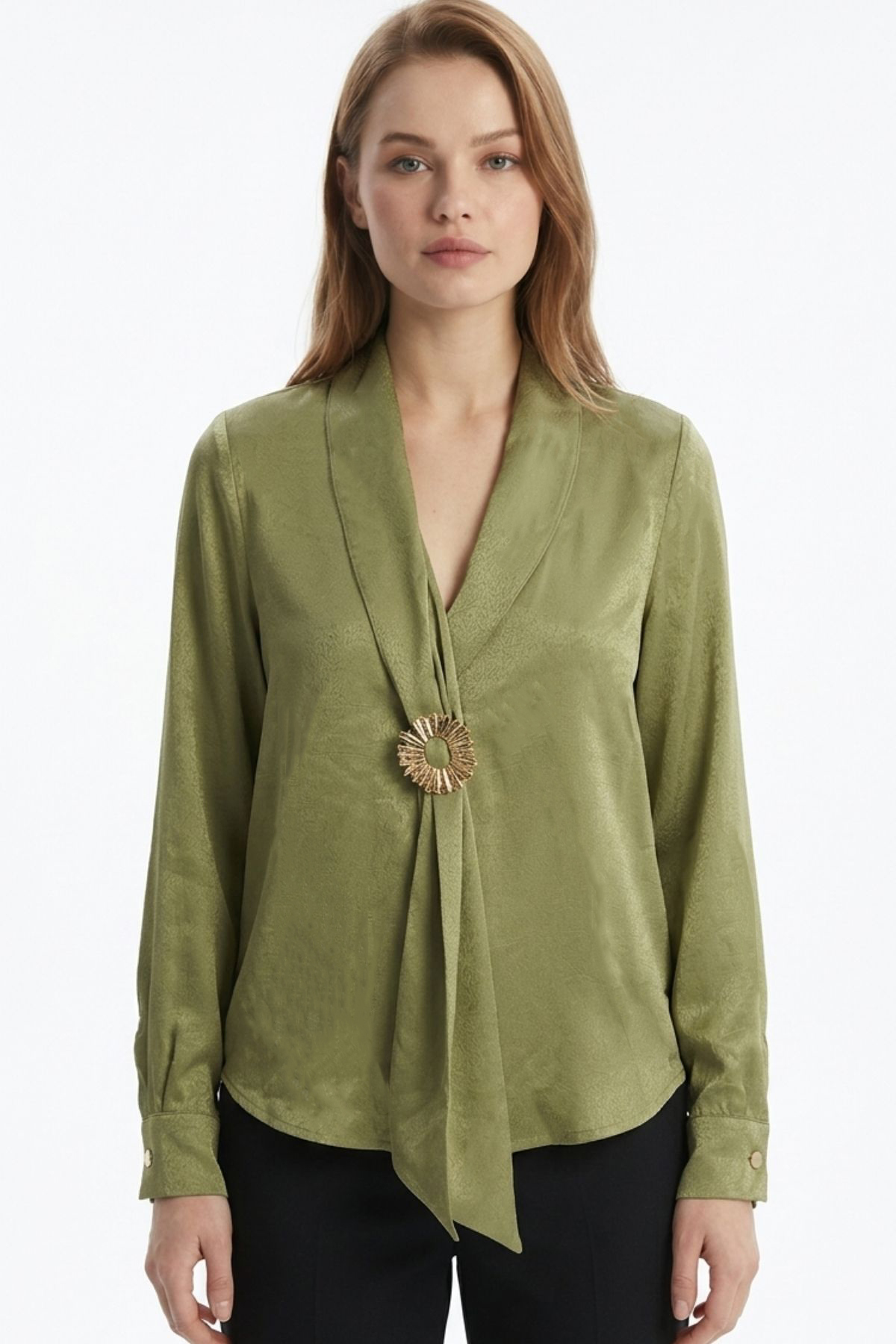 Haki V Yaka Aksesuarlı Bluz 252234
