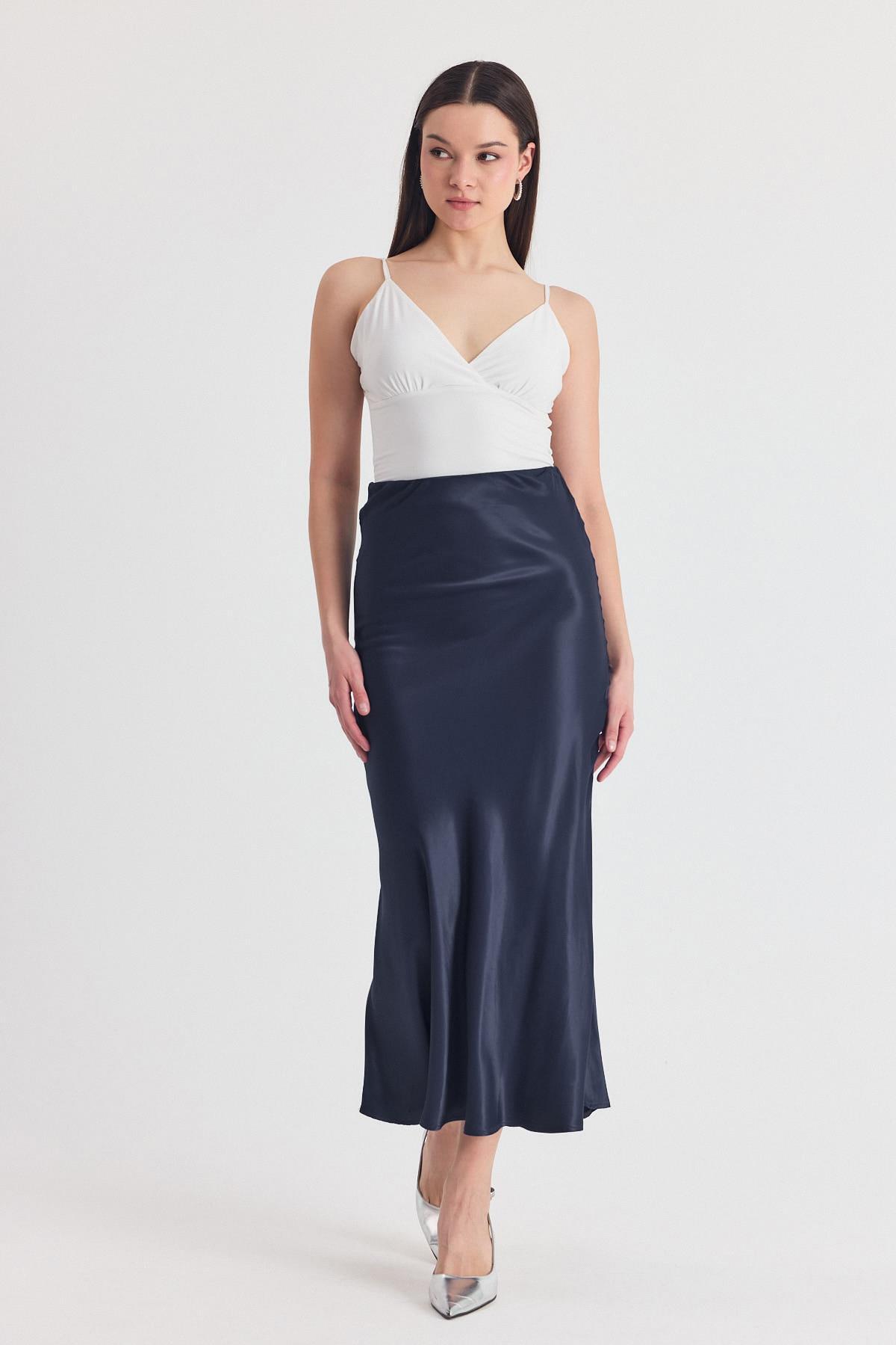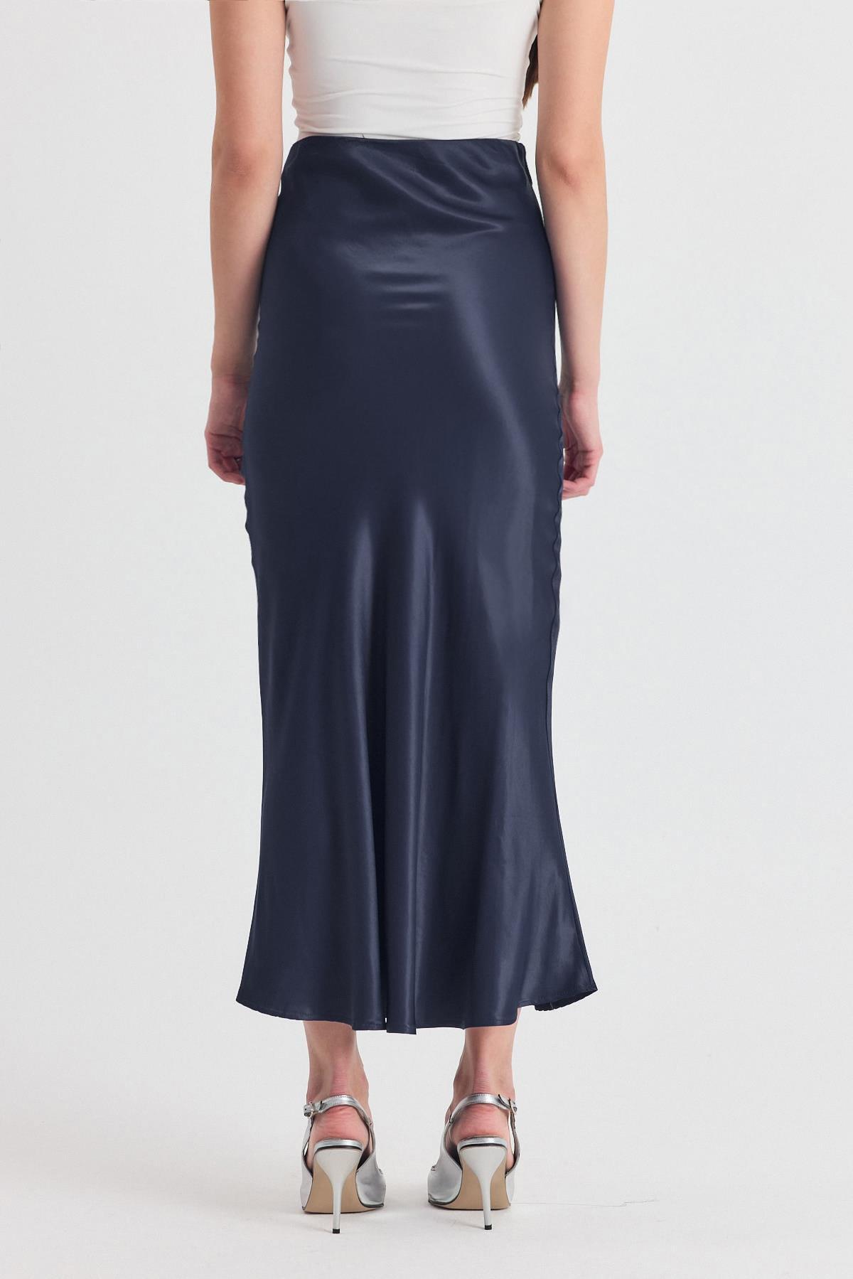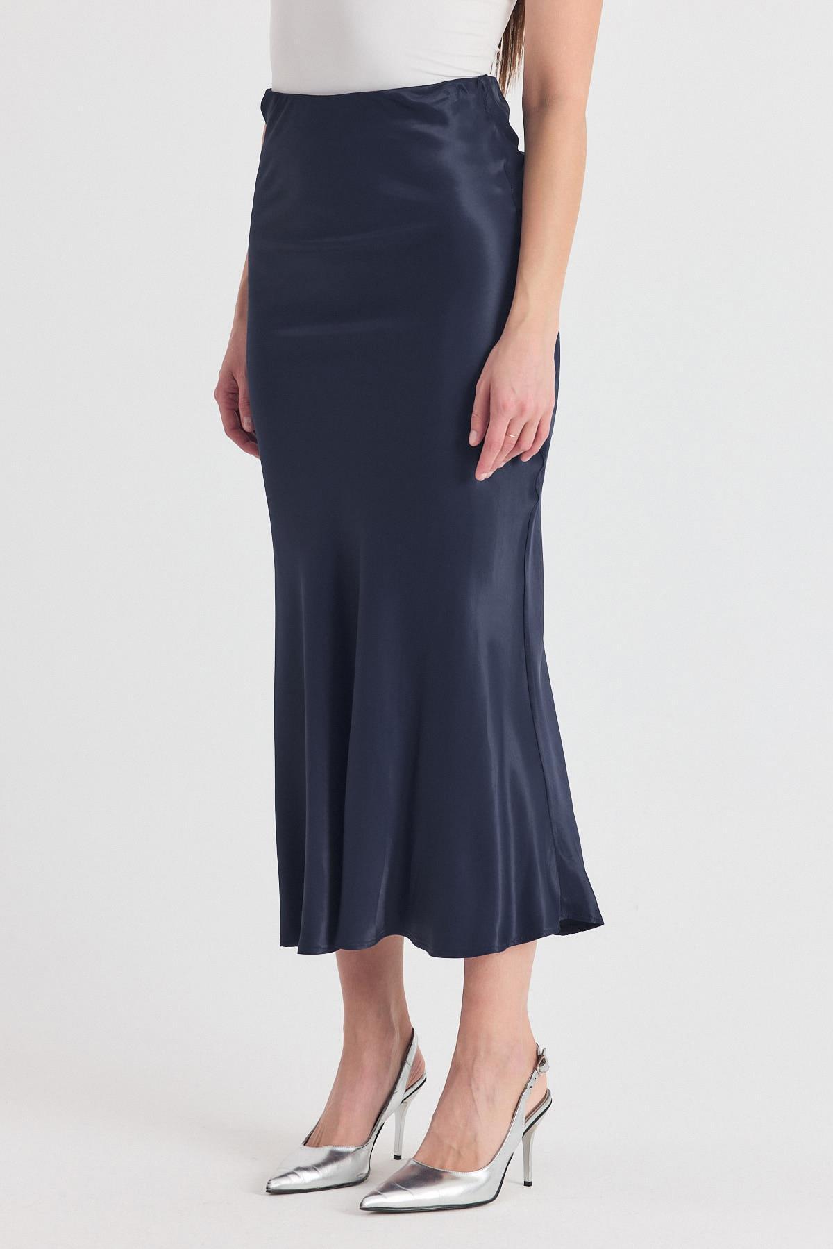 İndigo Beli Lastikli Saten Midi Etek 9427