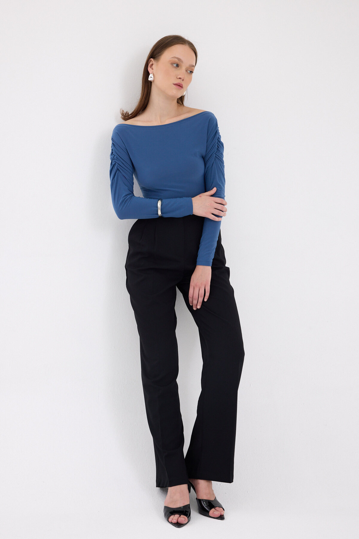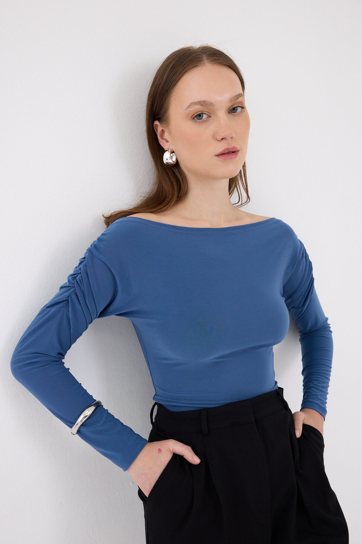İndigo Kayık Yaka Kol Büzgülü Bluz 2433