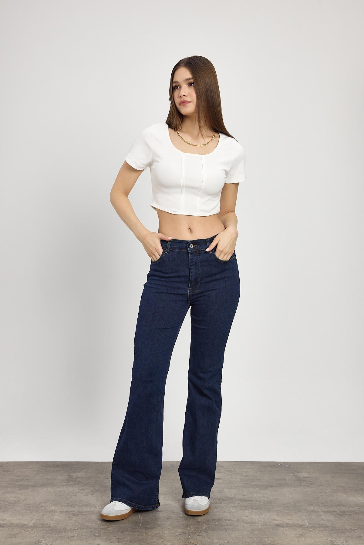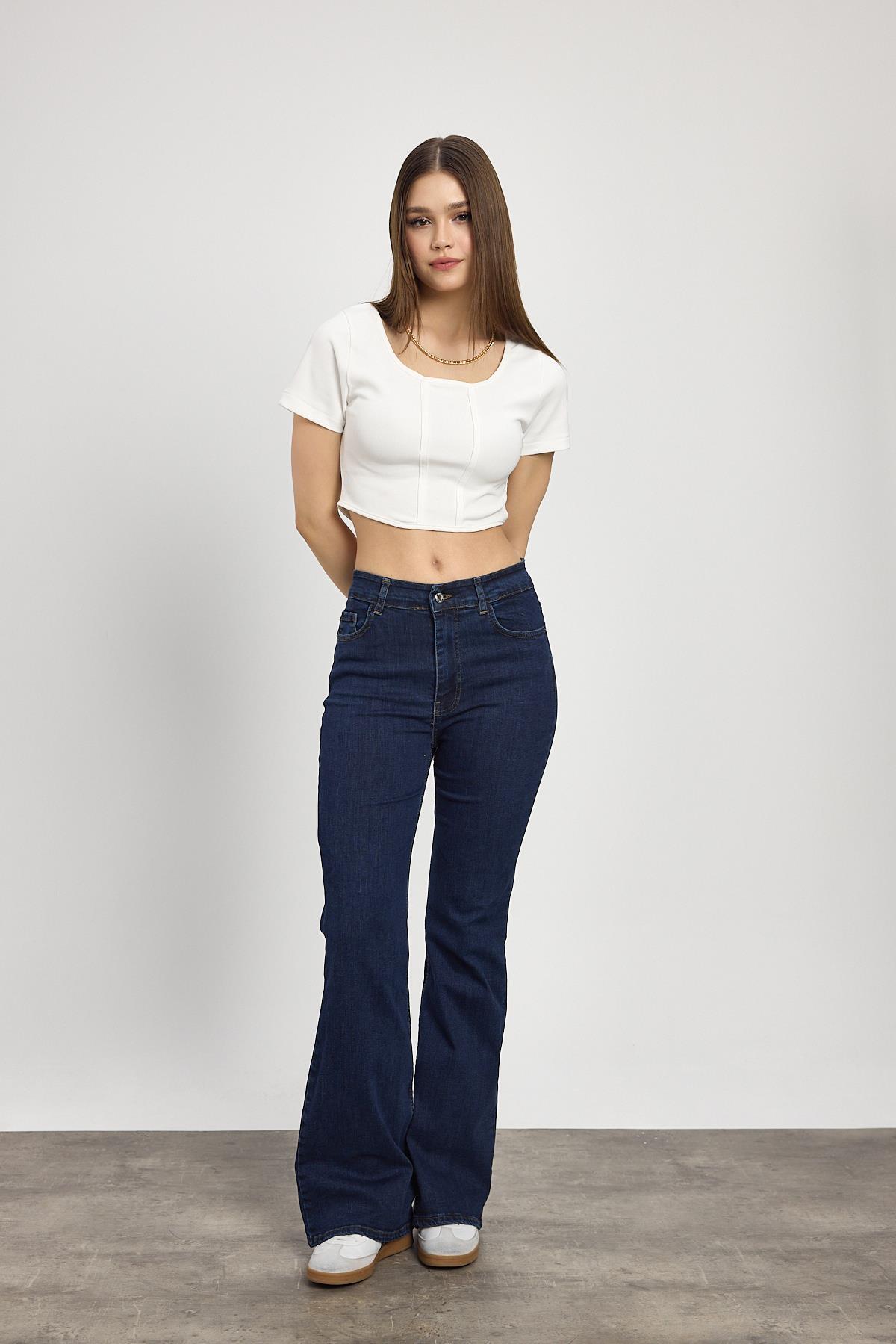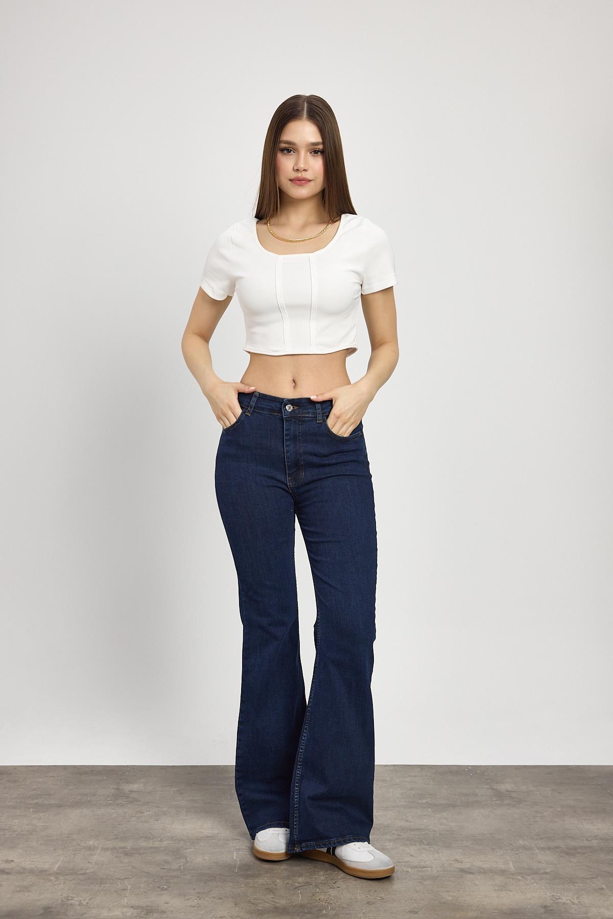 Koyu Mavi Yüksek Bel Flare Kesim Kadın Jean Pantolon 12036