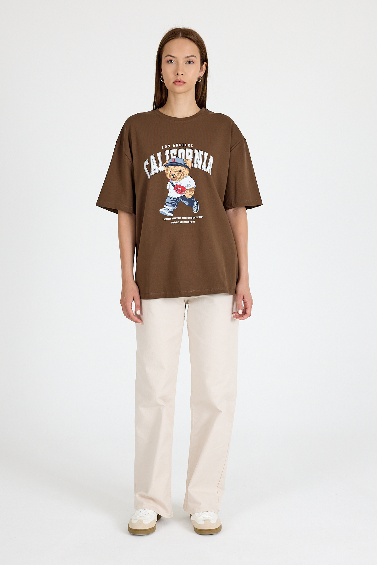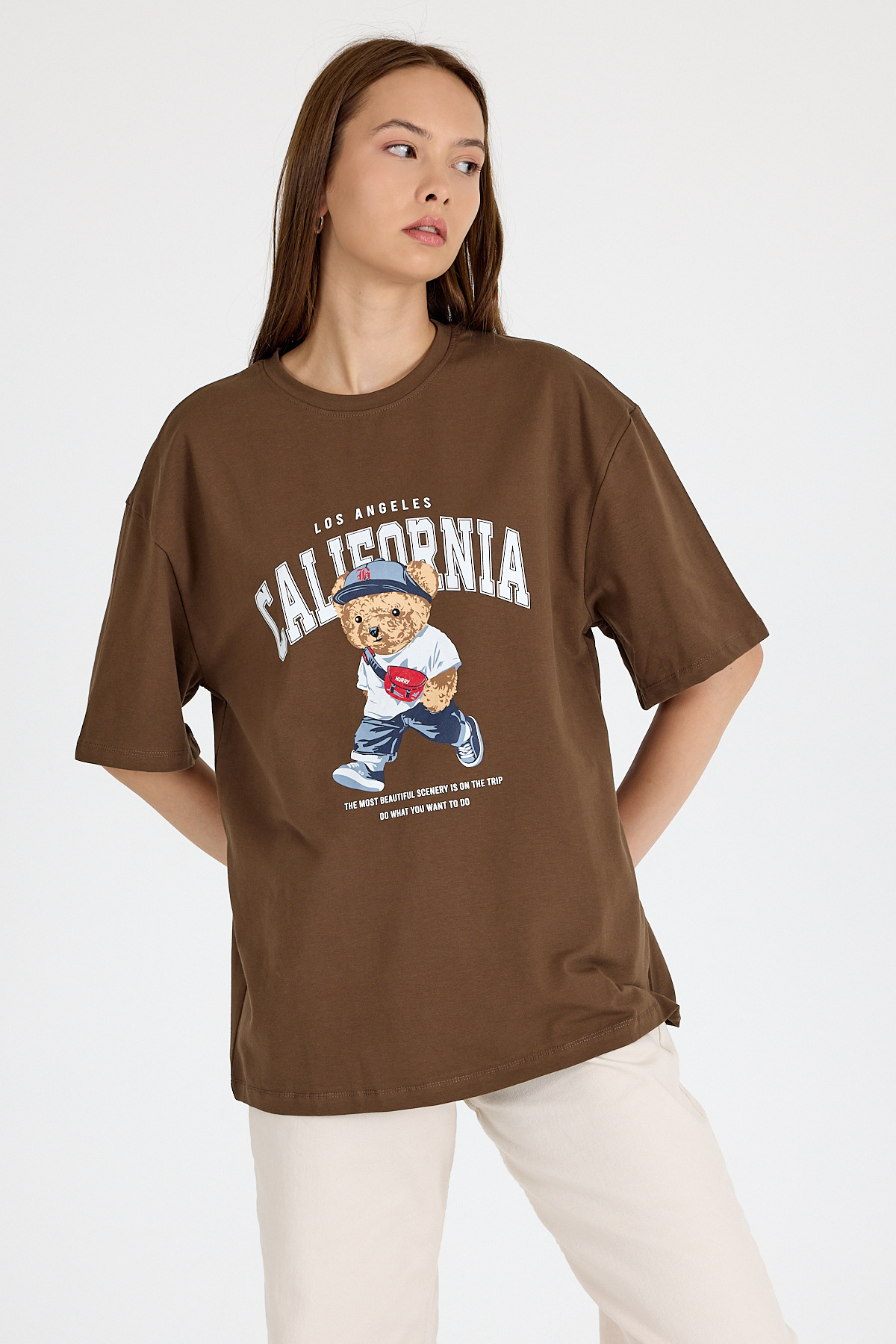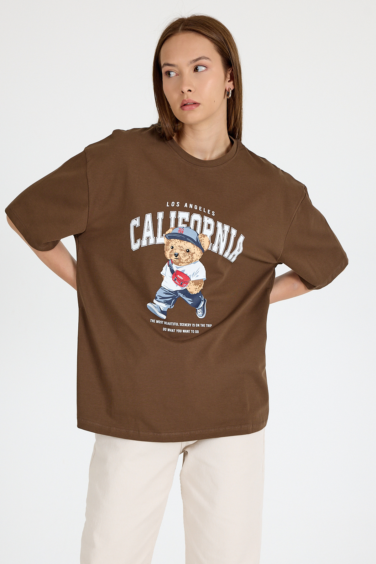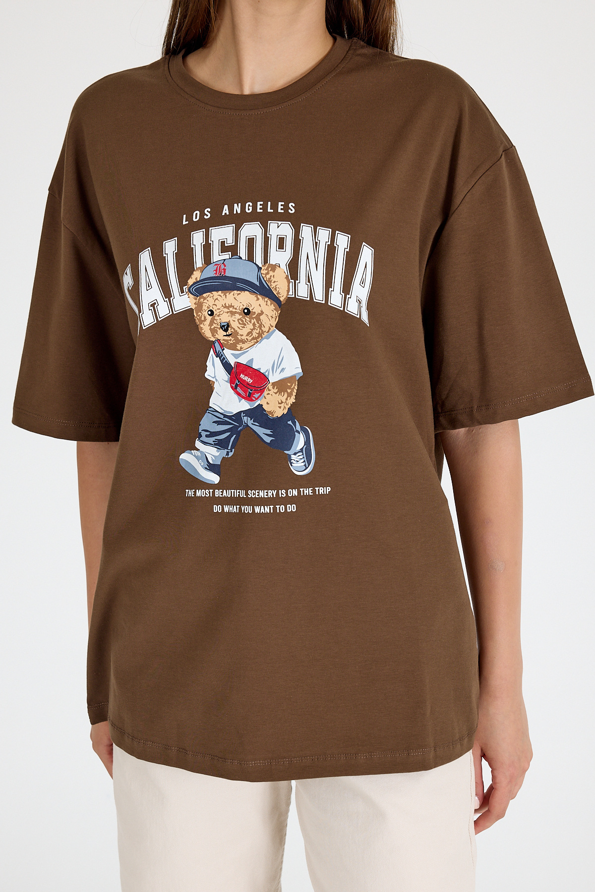 Kahve Ayı Baskılı Oversize Tişört 6559