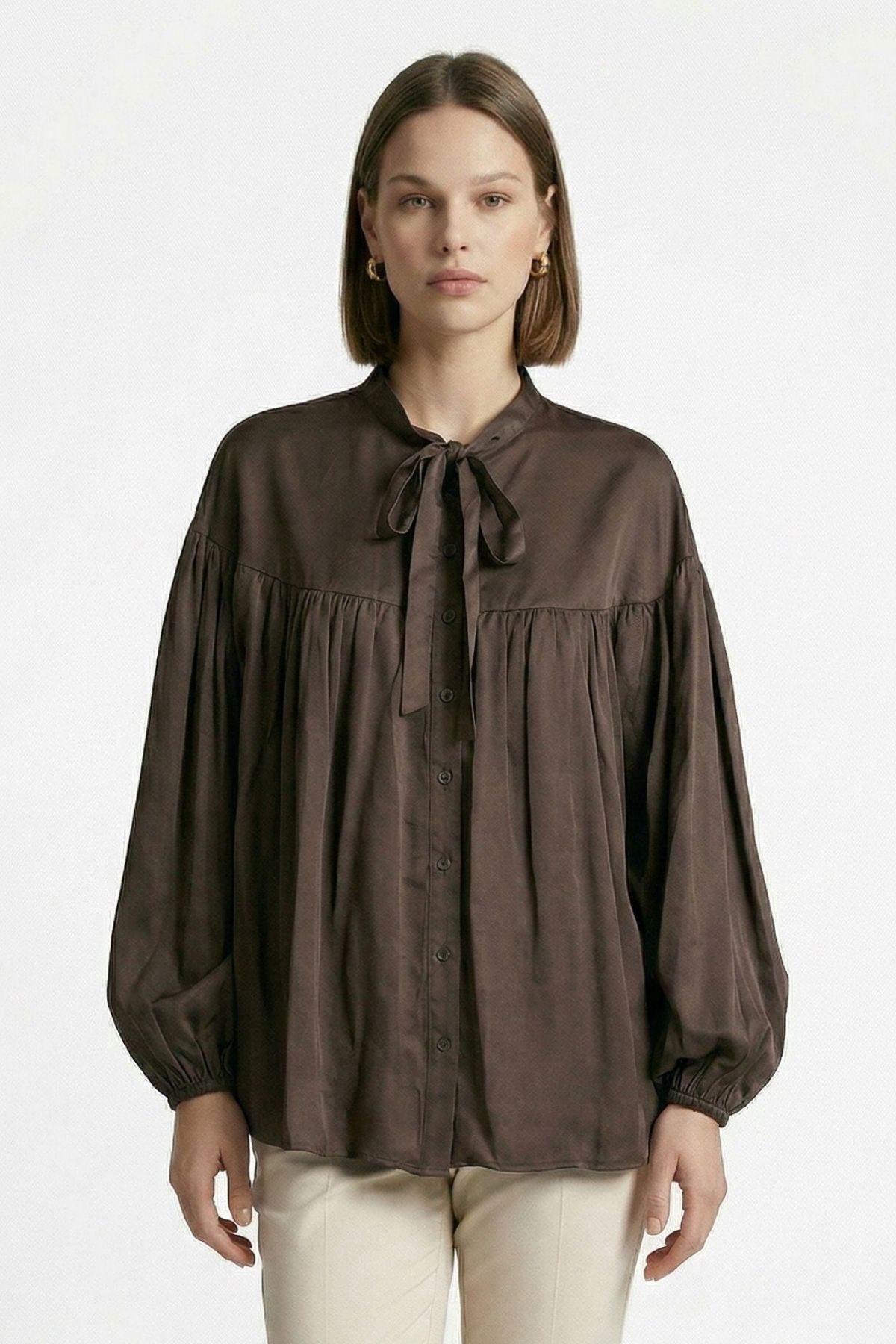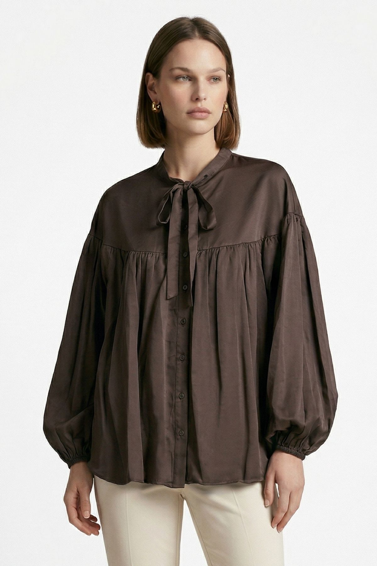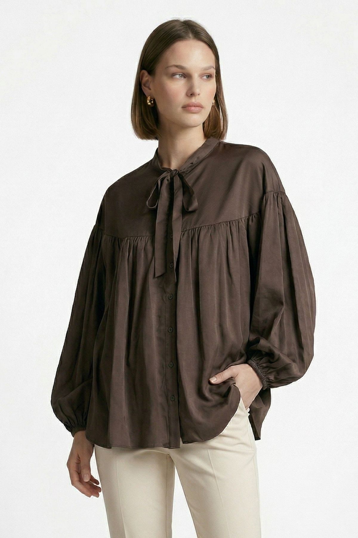 Kahve Balon Kollu Pileli Bağlamalı Bluz 0088