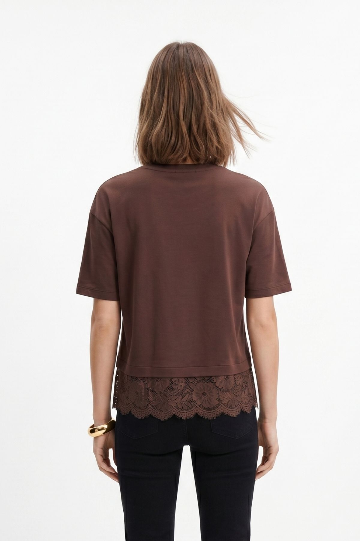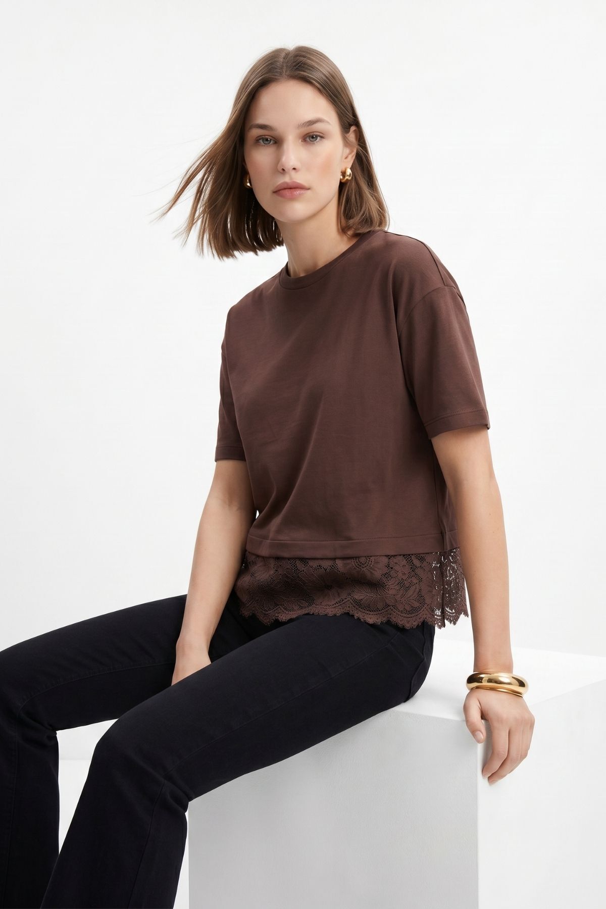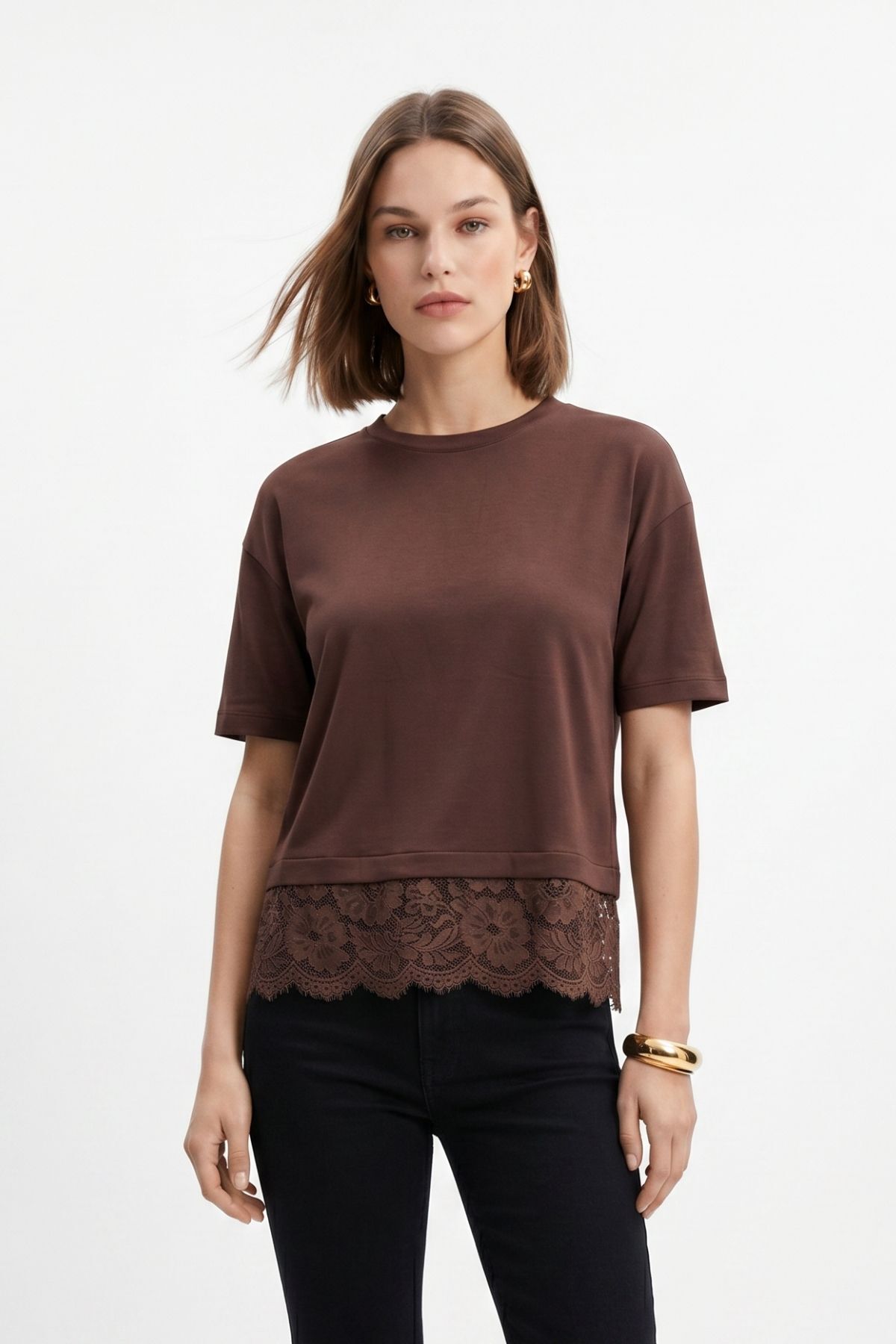 Kahve Bisiklet Yaka Dantel Detaylı Tişört 0463