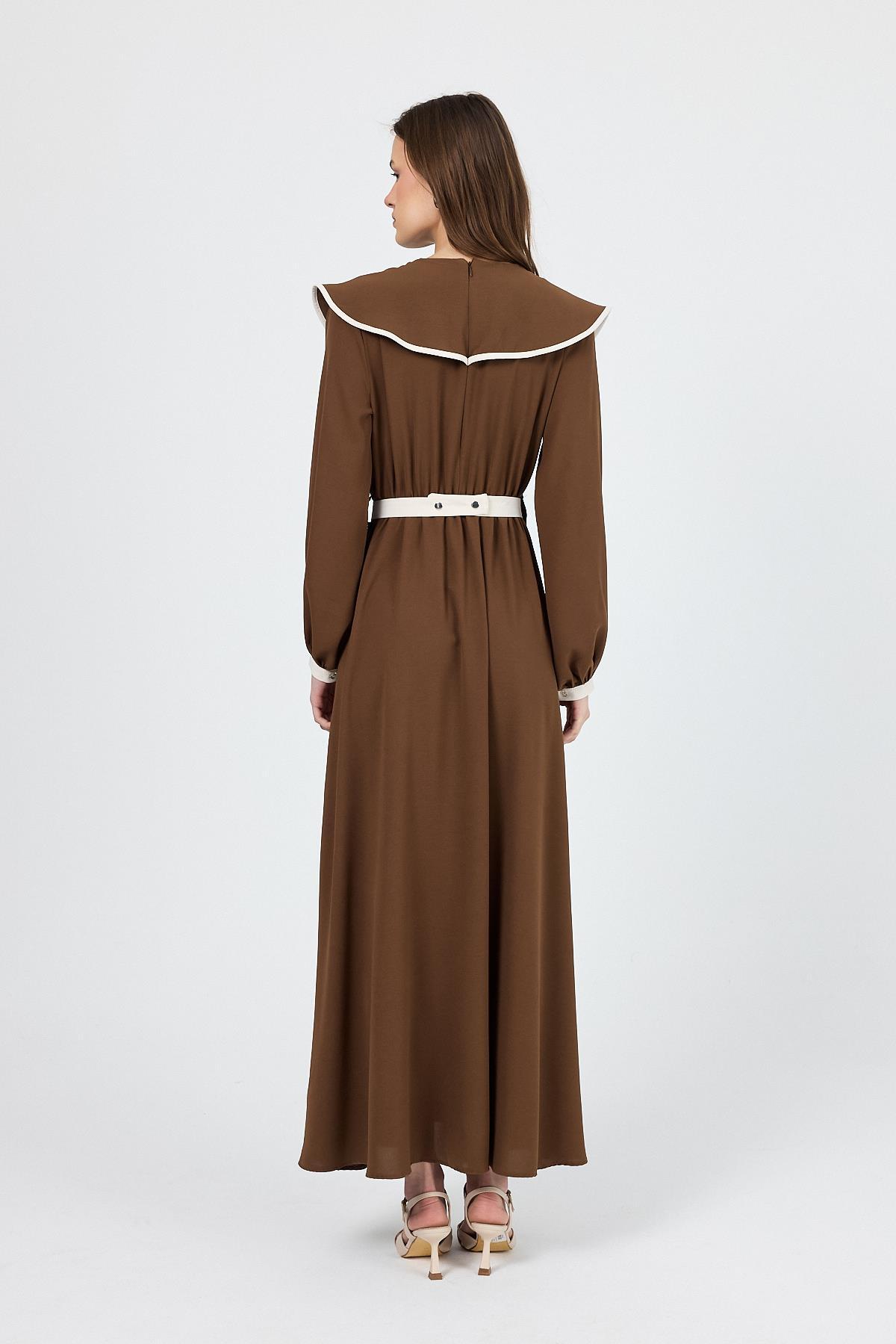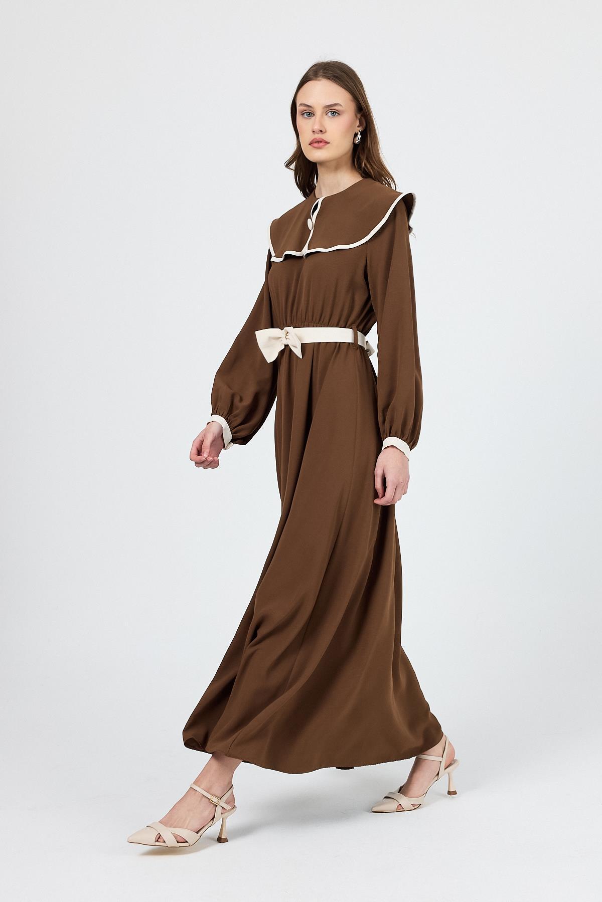 Kahve Biye Detaylı Bebe Yaka Elbise 4413A