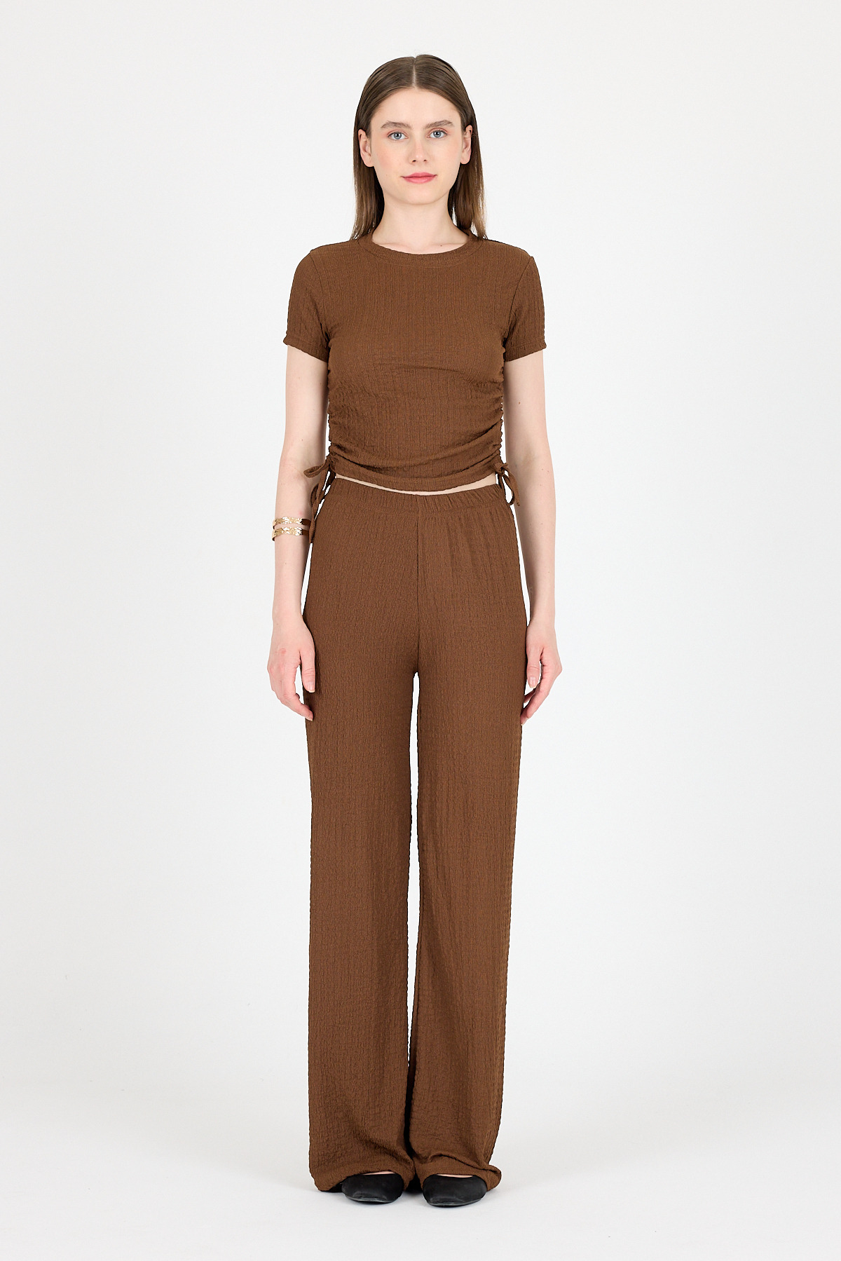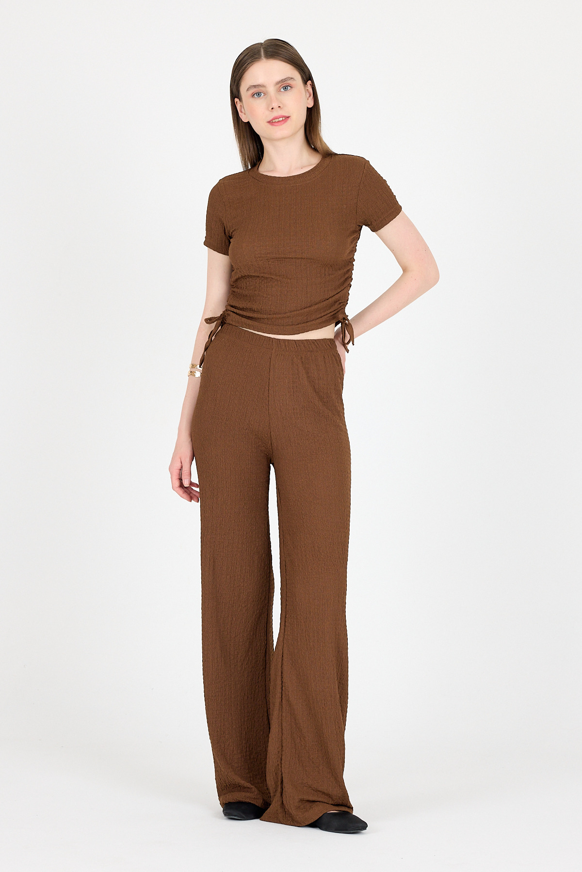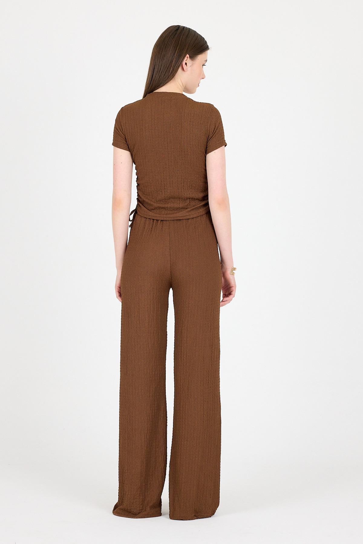 Kahve Bürümcük Dokulu Büzgülü Crop ve Geniş Paça Pantolon Takımı 3001
