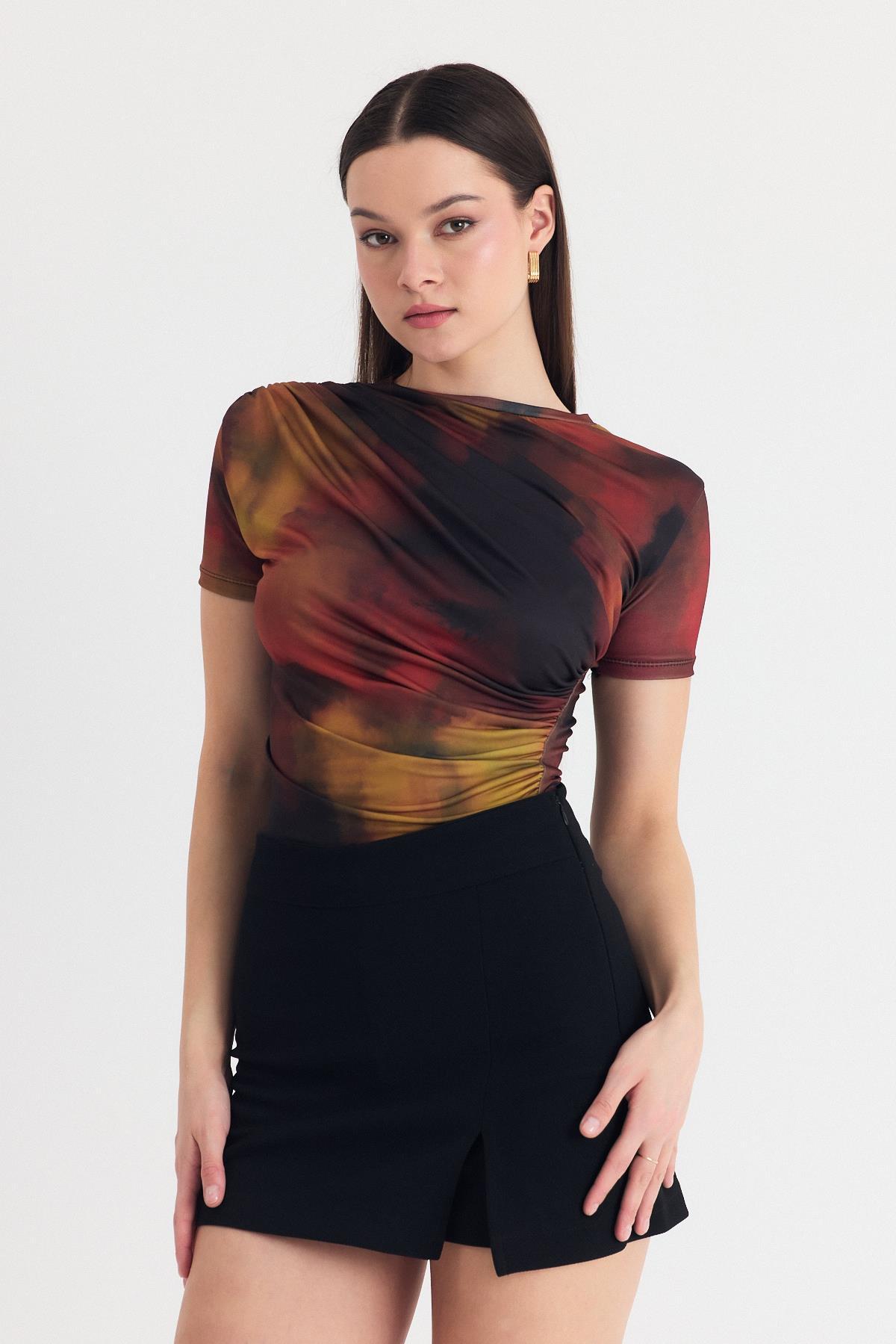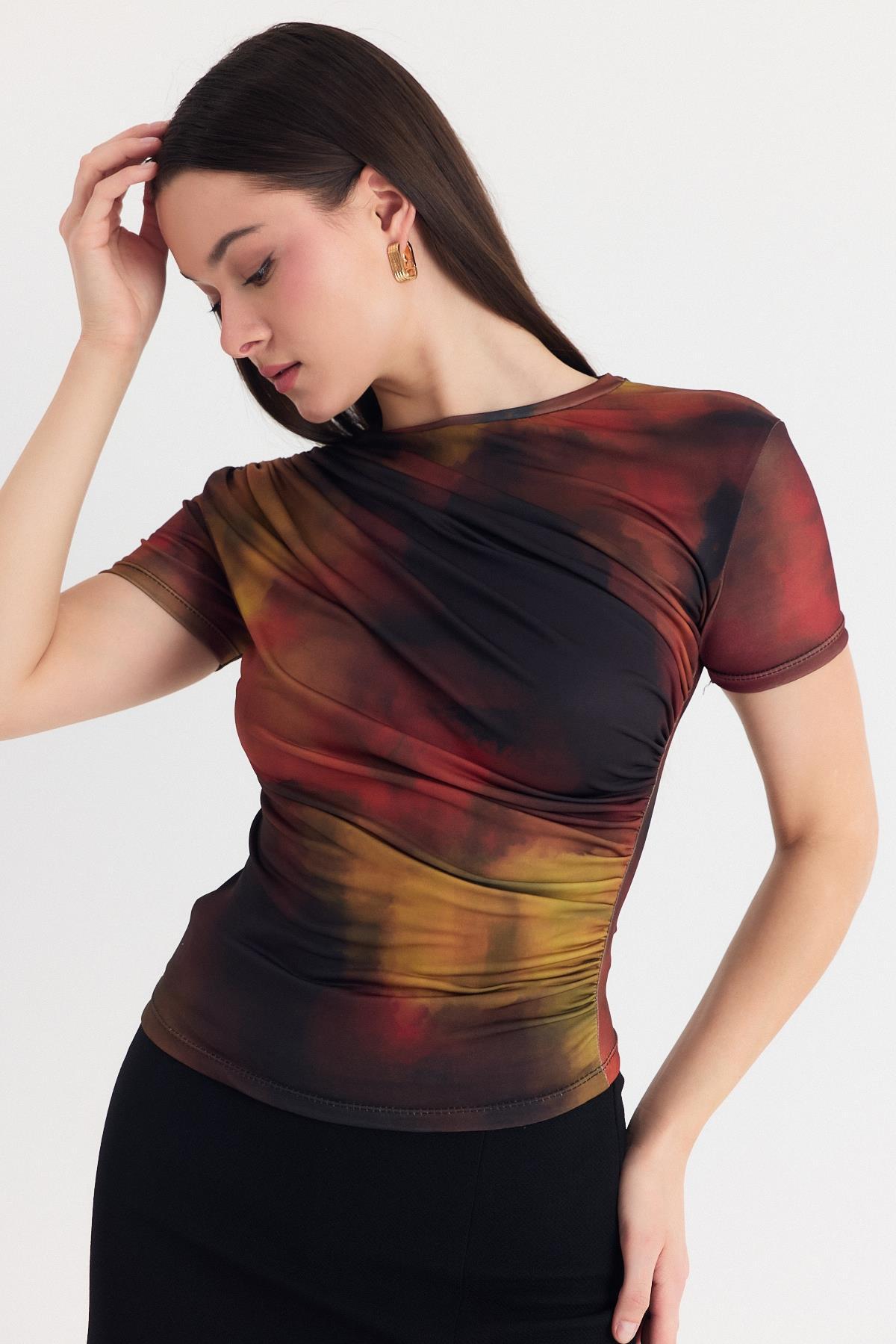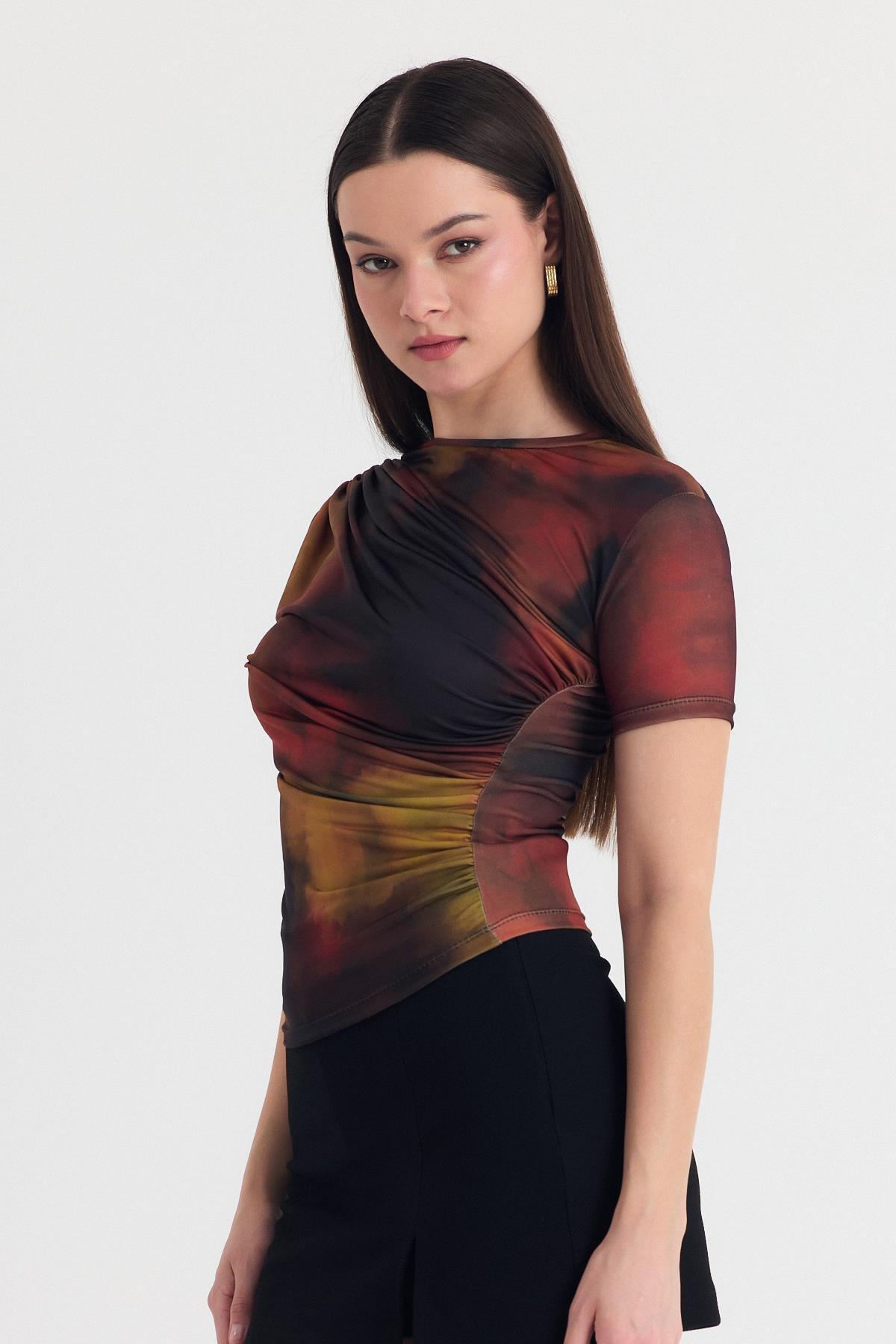 Kahve Desenli Büzgülü Sandy Bluz 12303