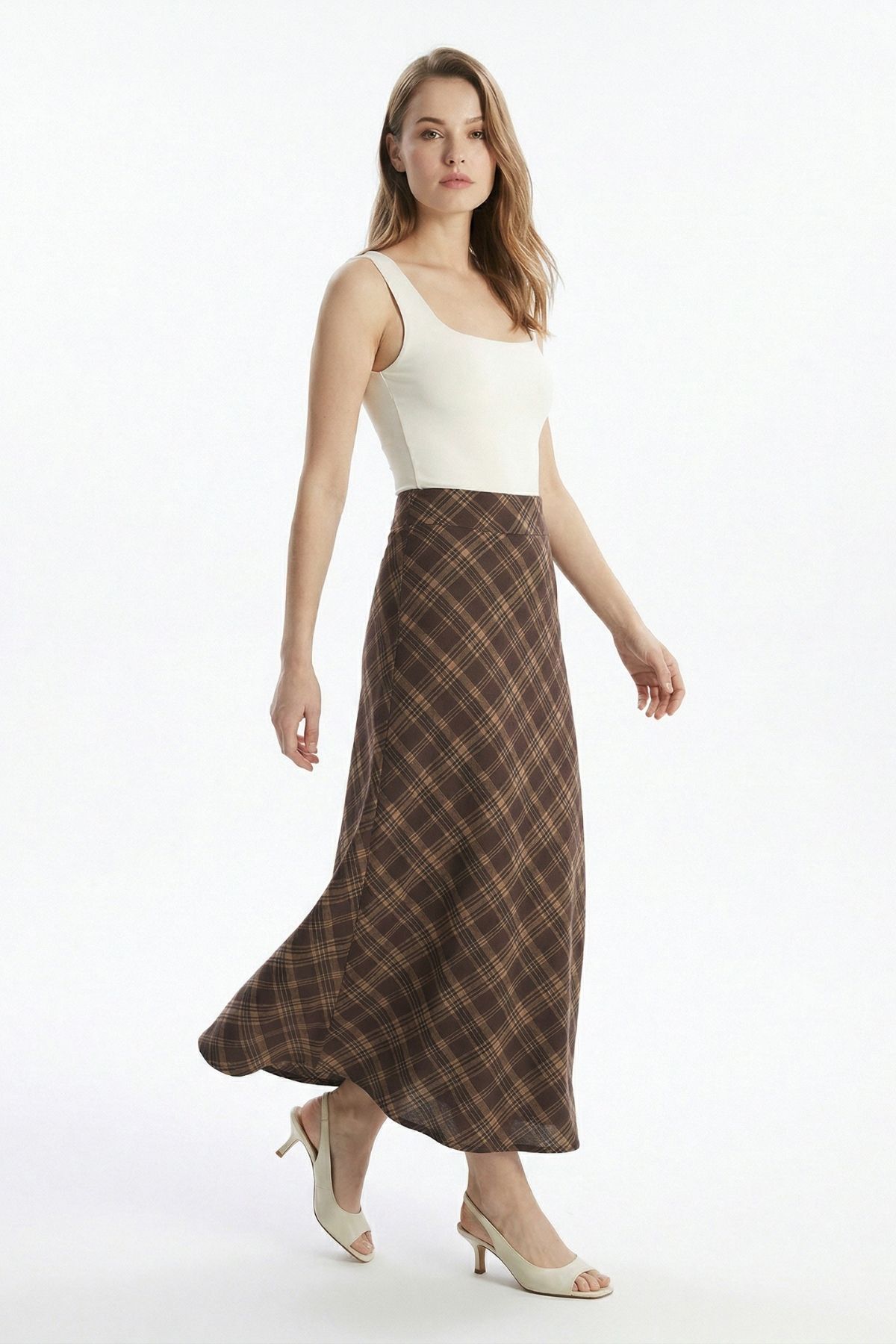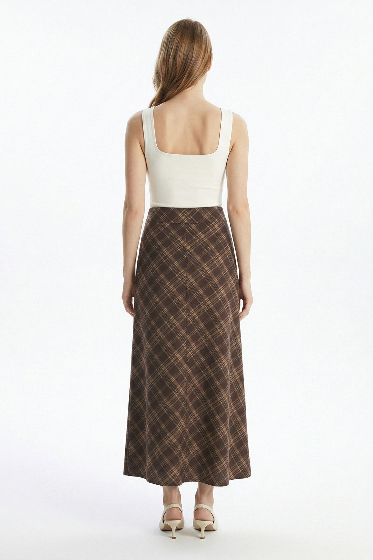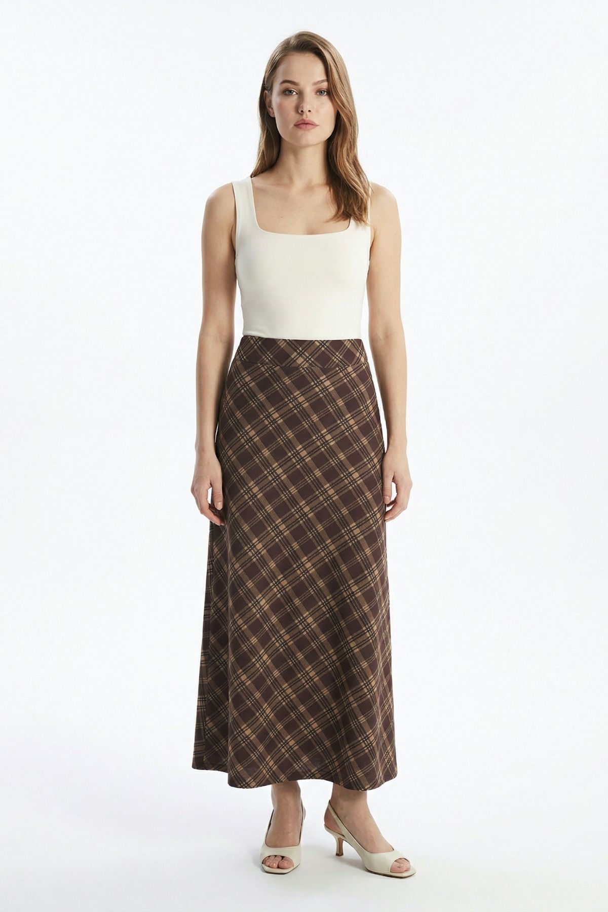 Kahve Ekose Desen Bel Lastikli Etek 3507-1