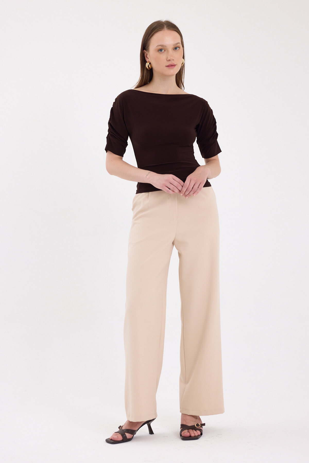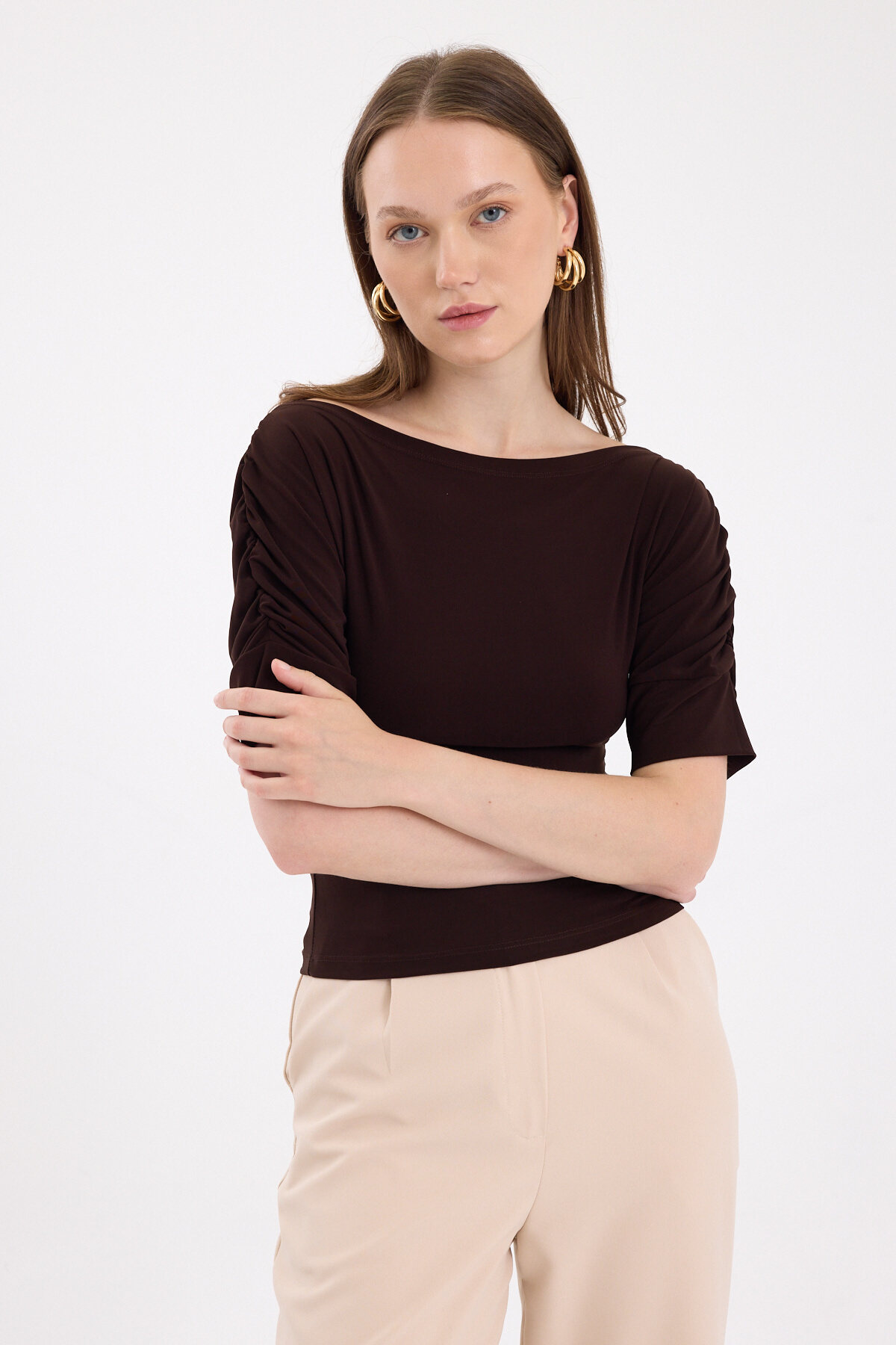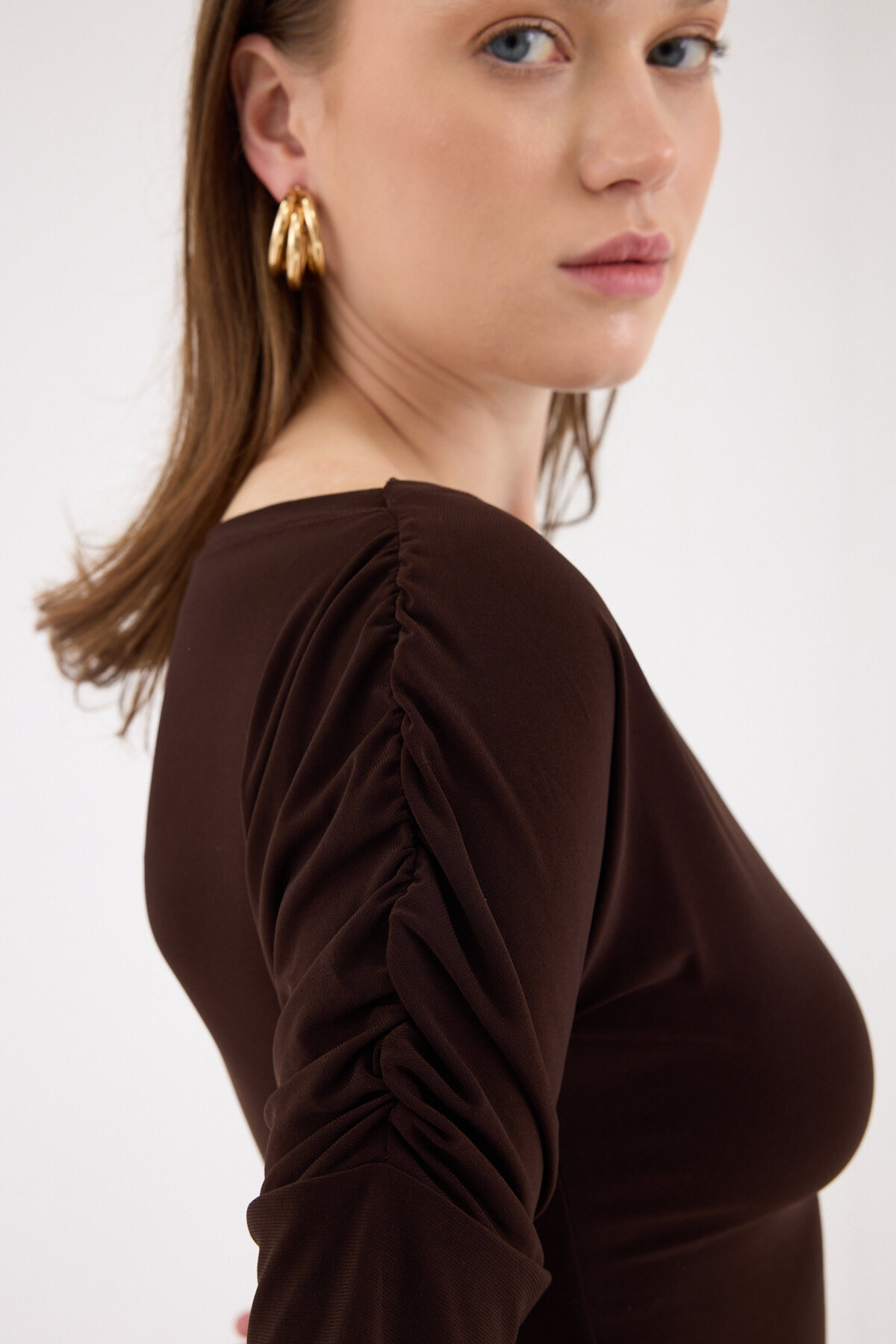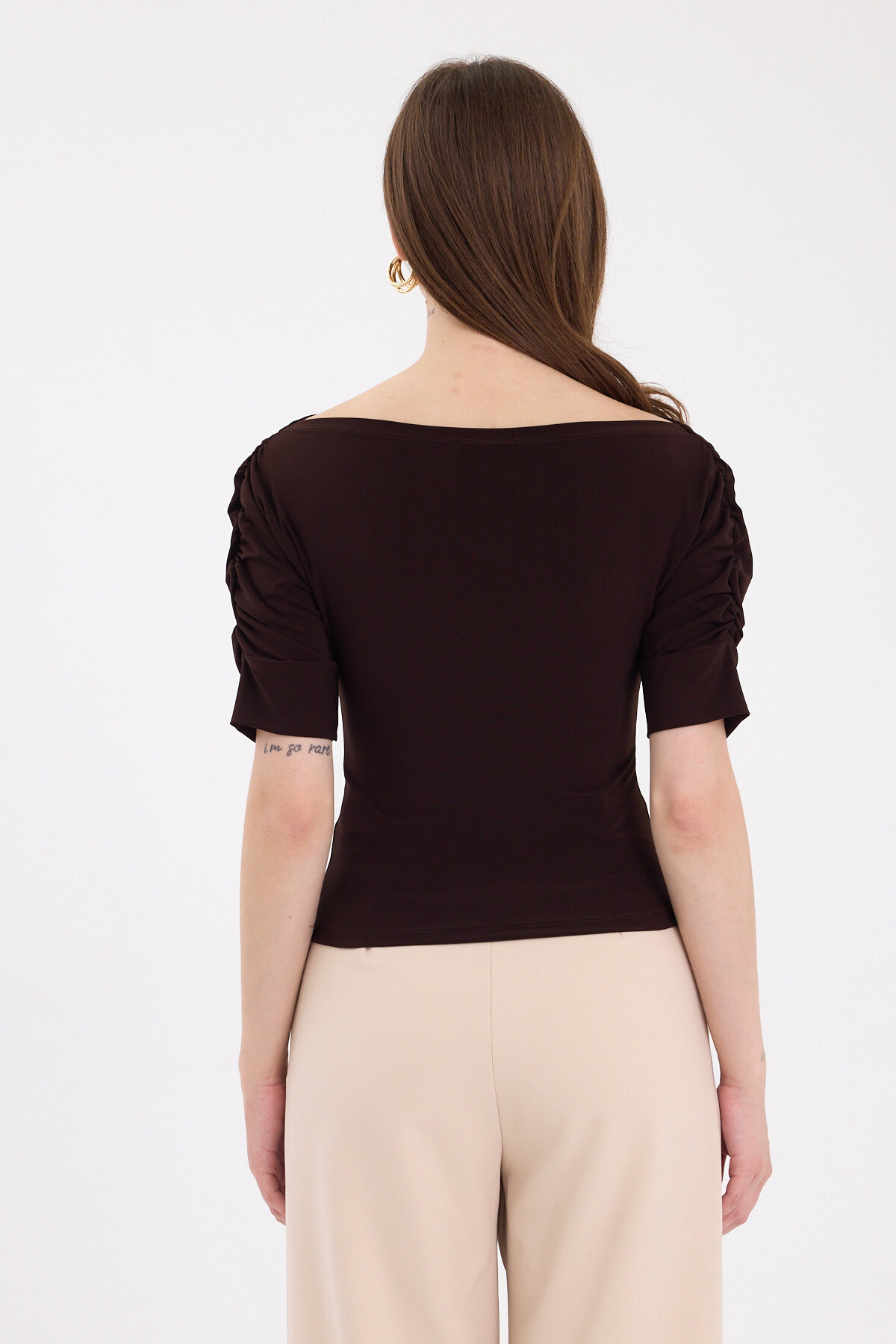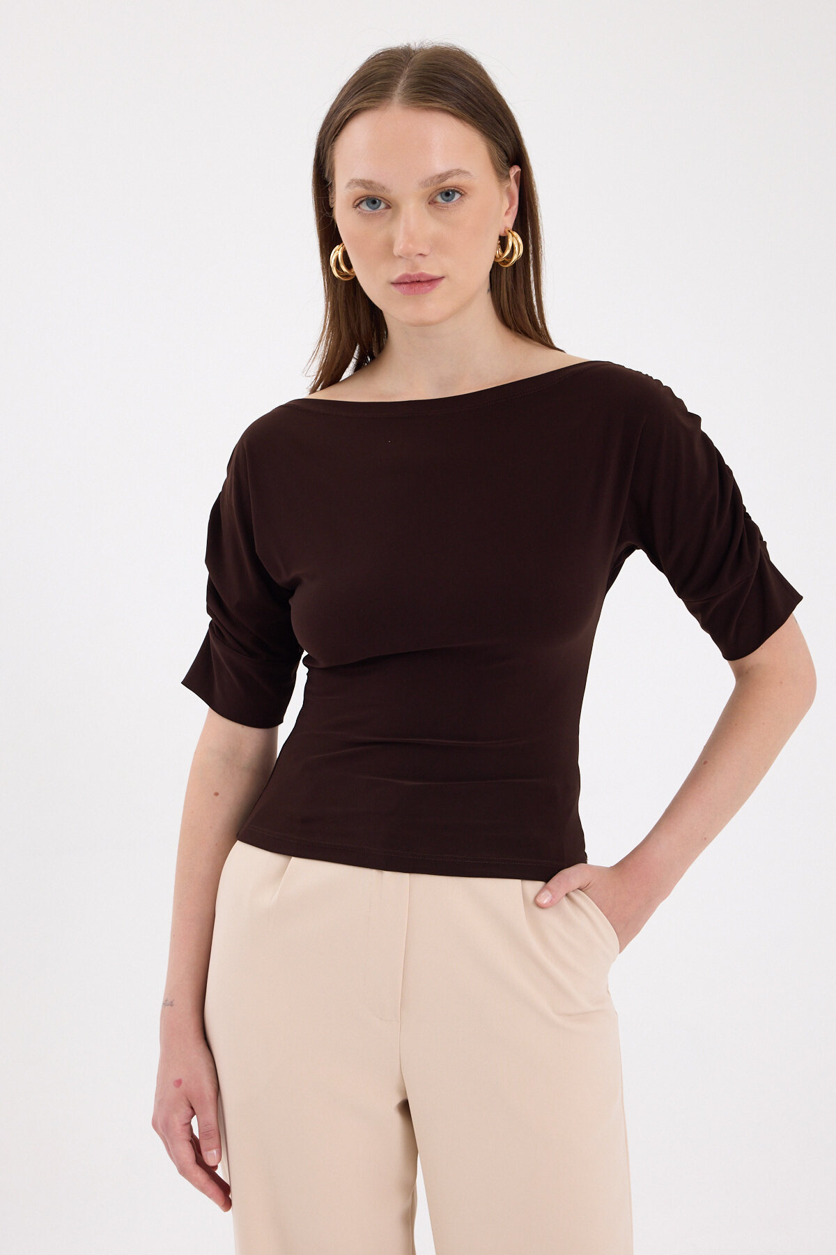 Kahve Kayık Yaka Kol Büzgülü Bluz 2515