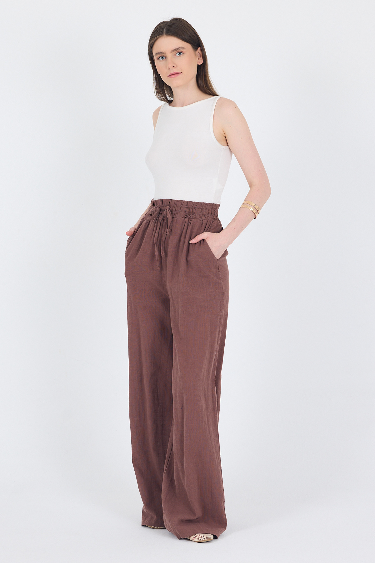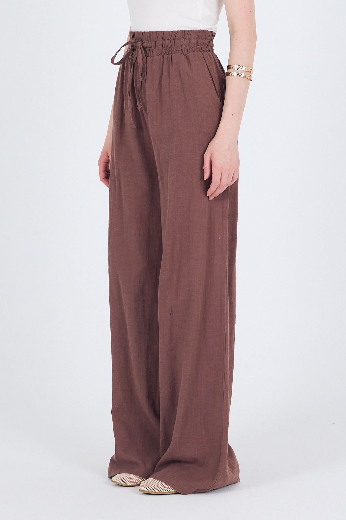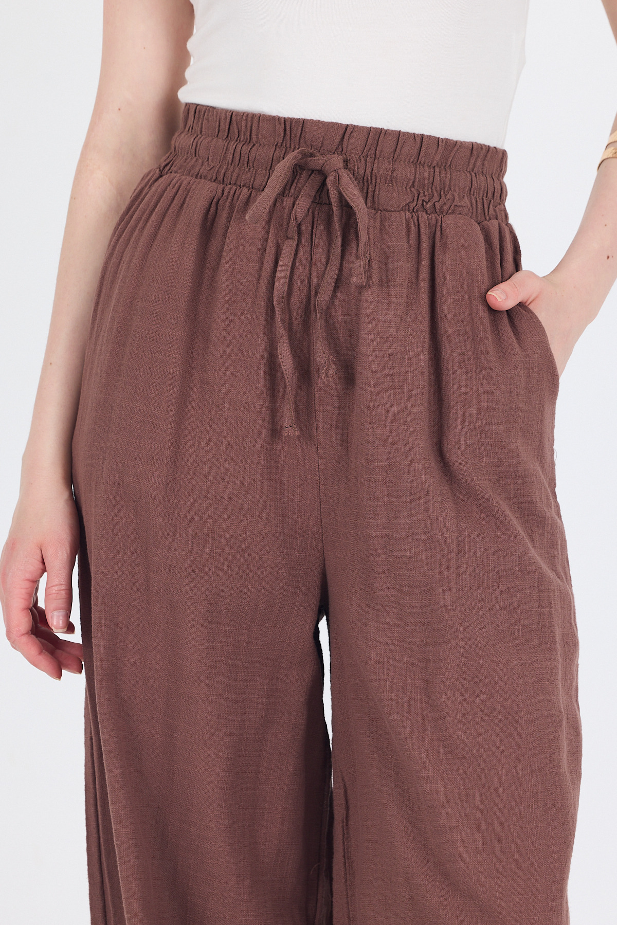 Kahve Keten Görünümlü %100 Pamuk Bol Paça Pantolon 3040
