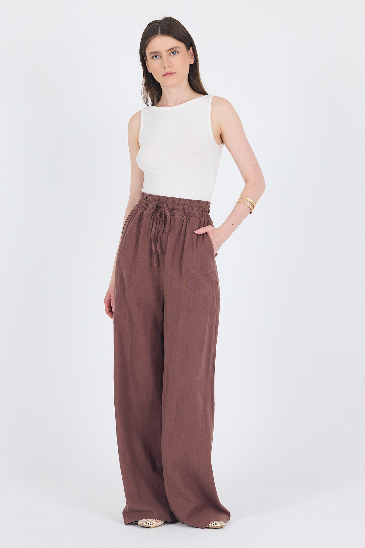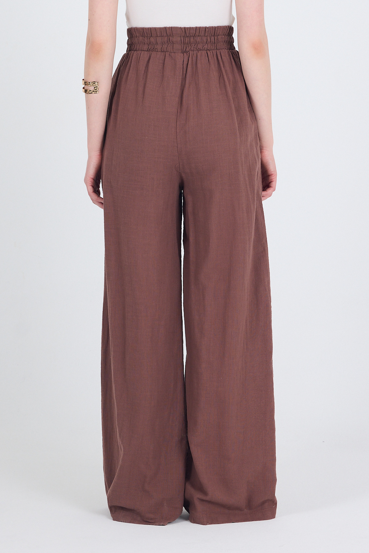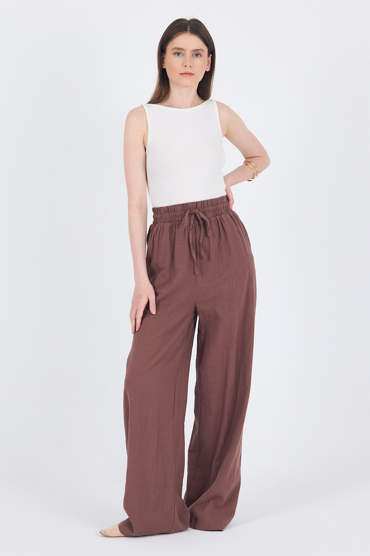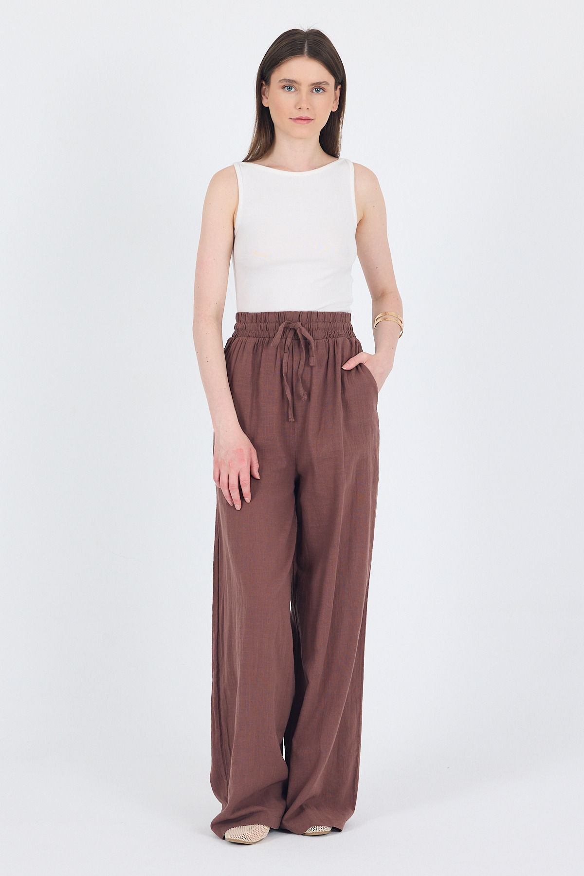 Kahve Keten Görünümlü %100 Pamuk Bol Paça Pantolon 3040