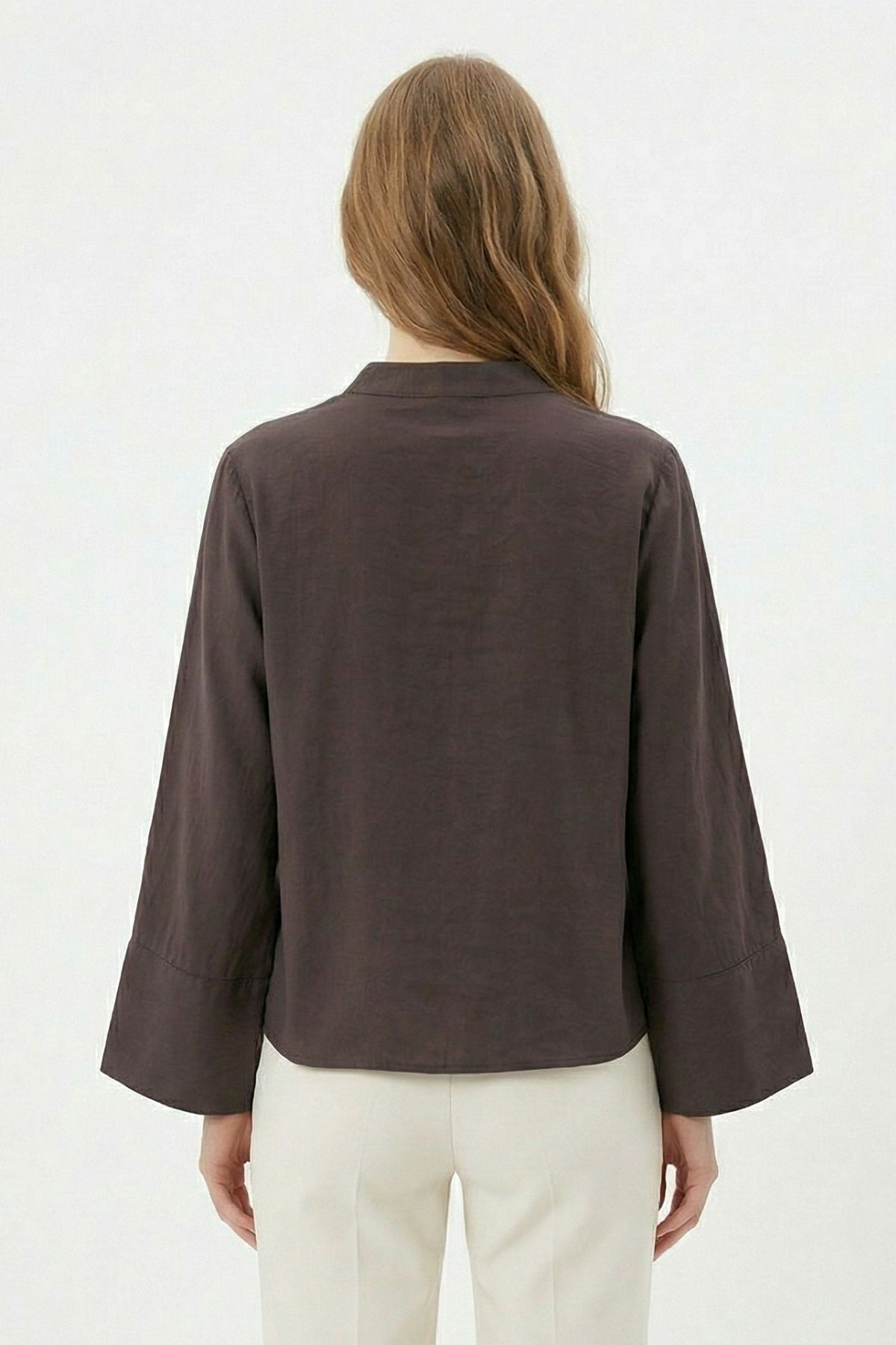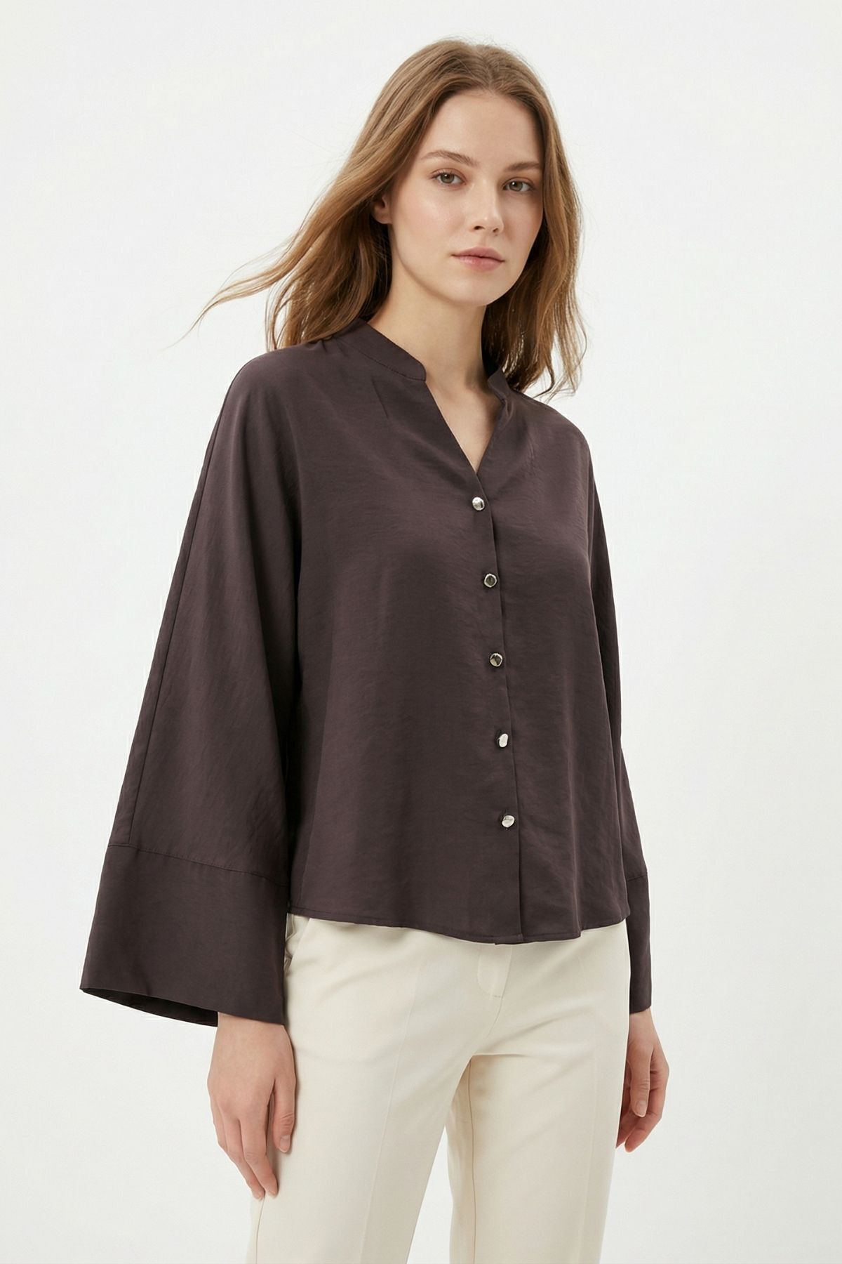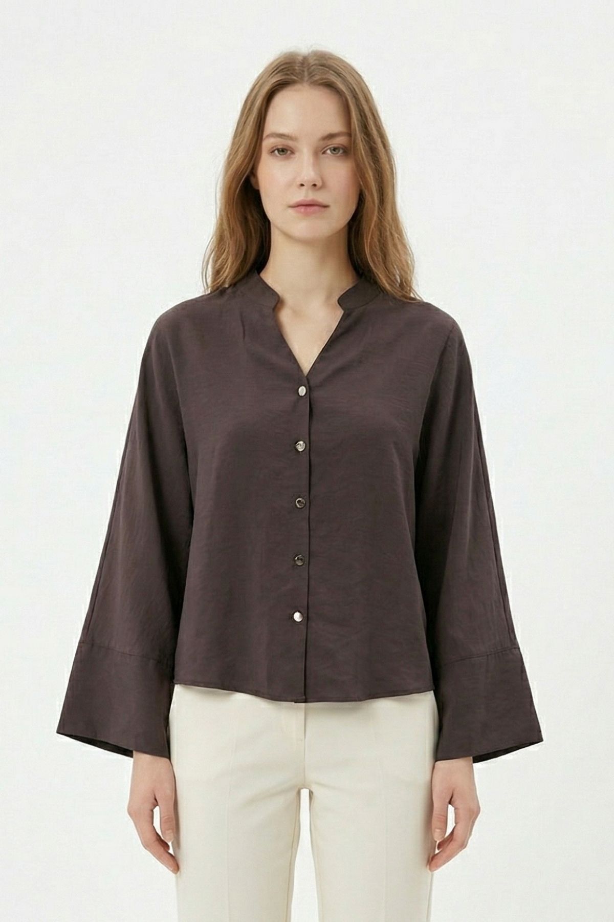 Kahve V Kesim Düğmeli Bluz 8022