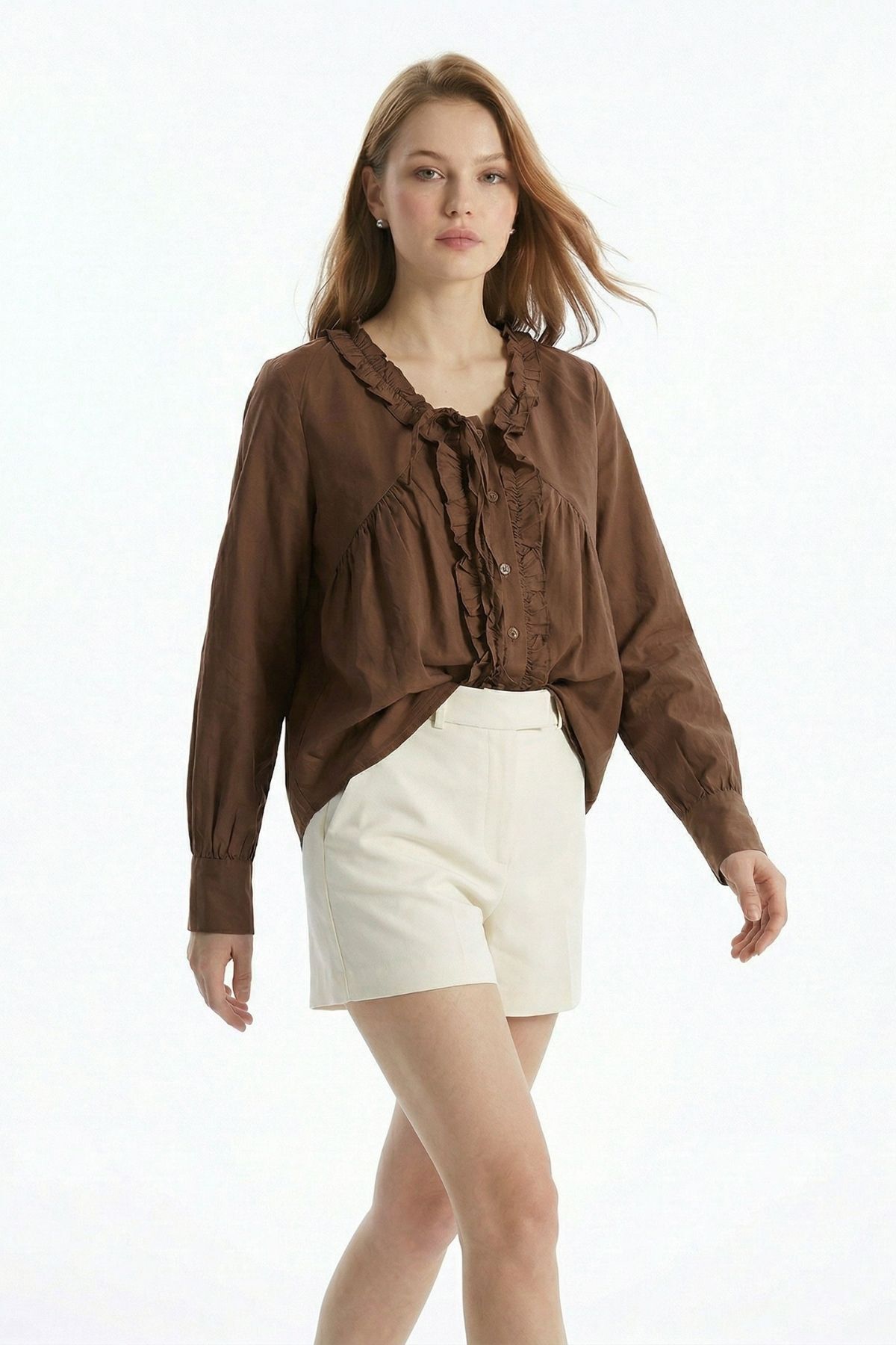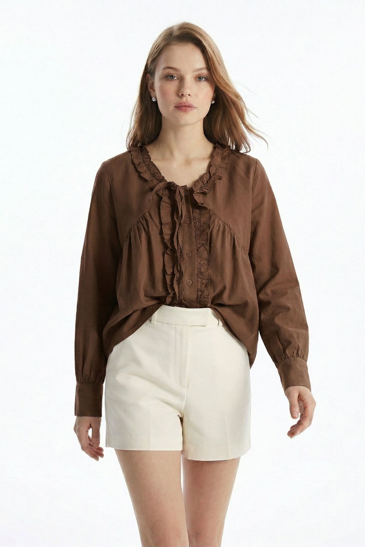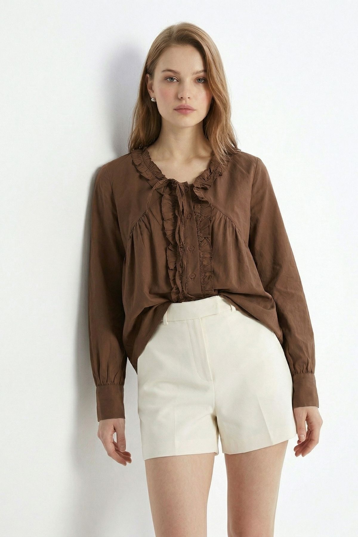 Kahve V Yaka Fırfırlı Bağlama Detay Bluz 0108
