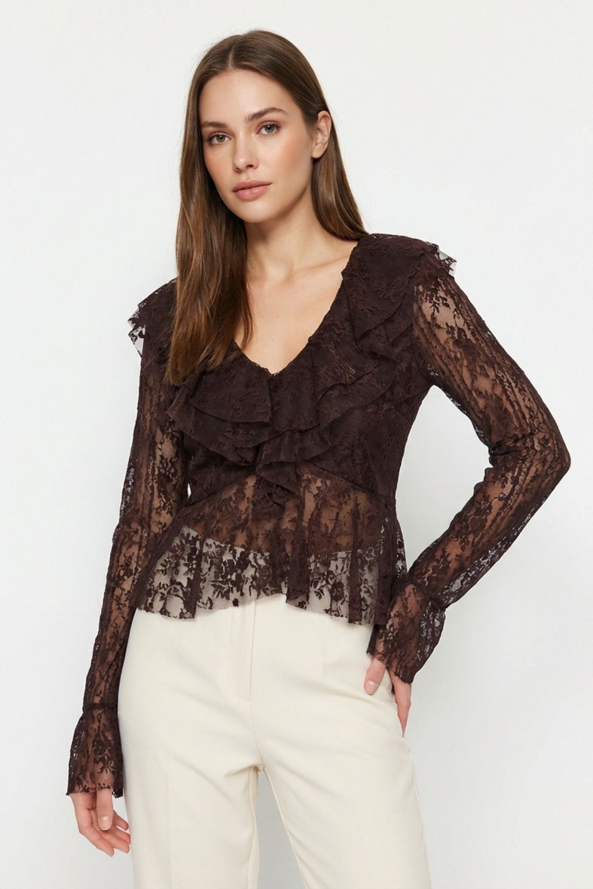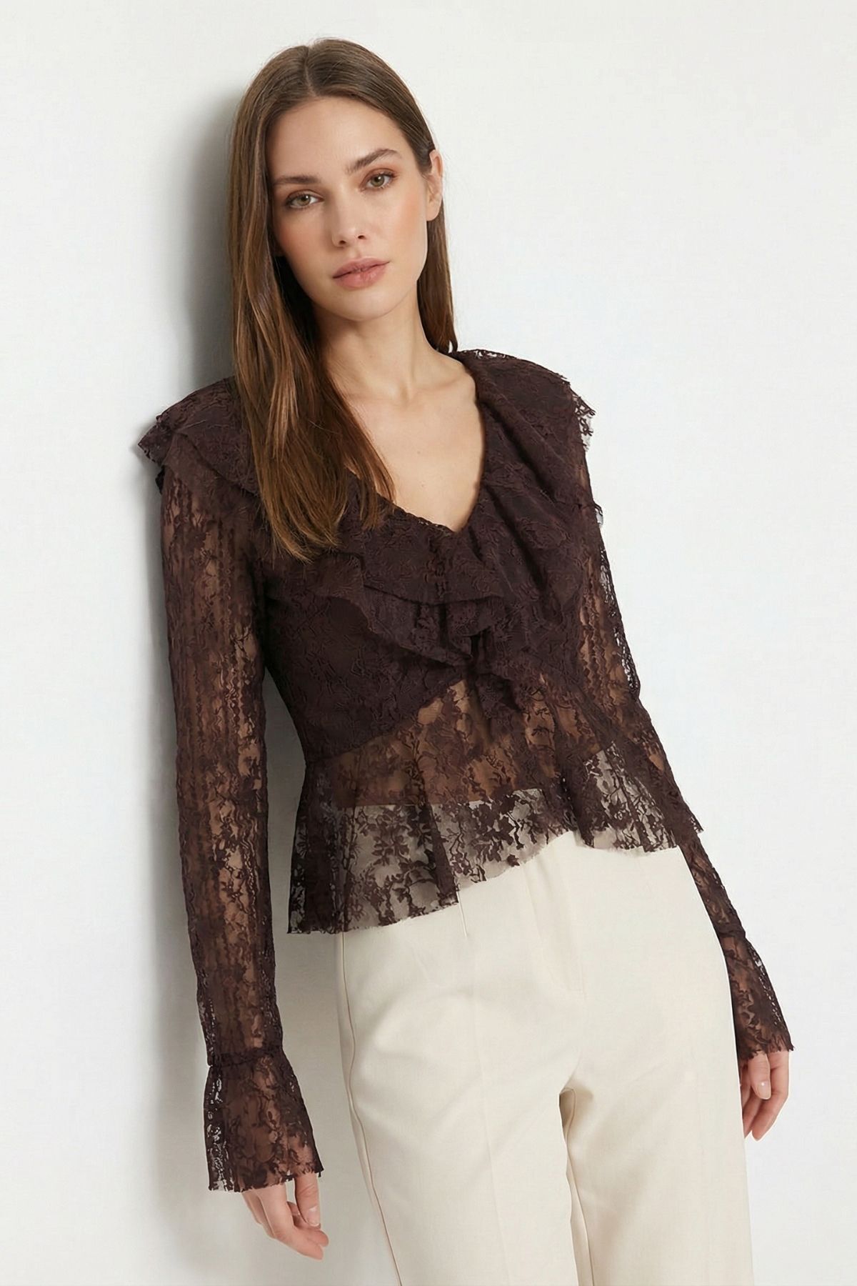 Kahve V Yaka Önü Fırfırlı Dantelli Bluz 8490