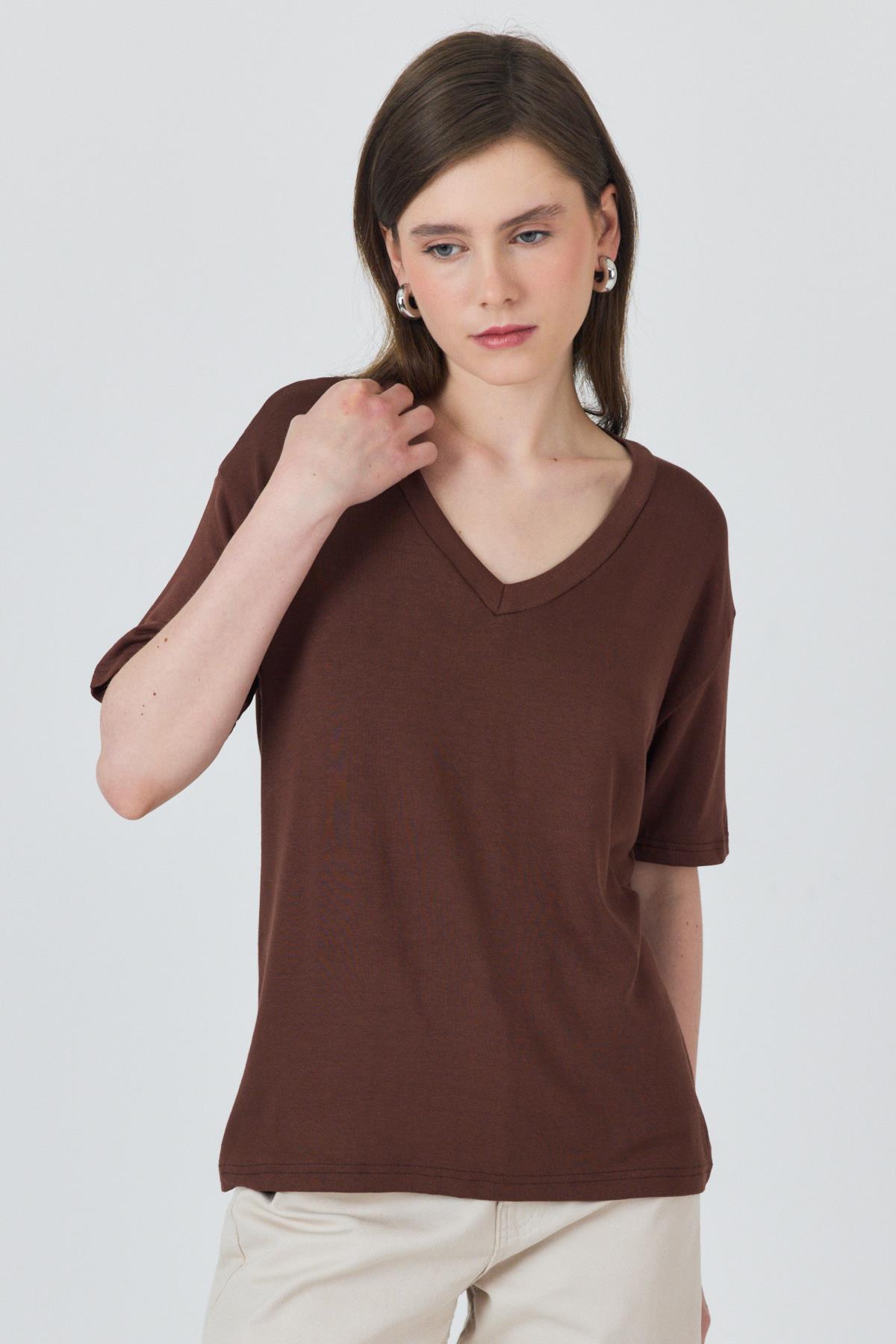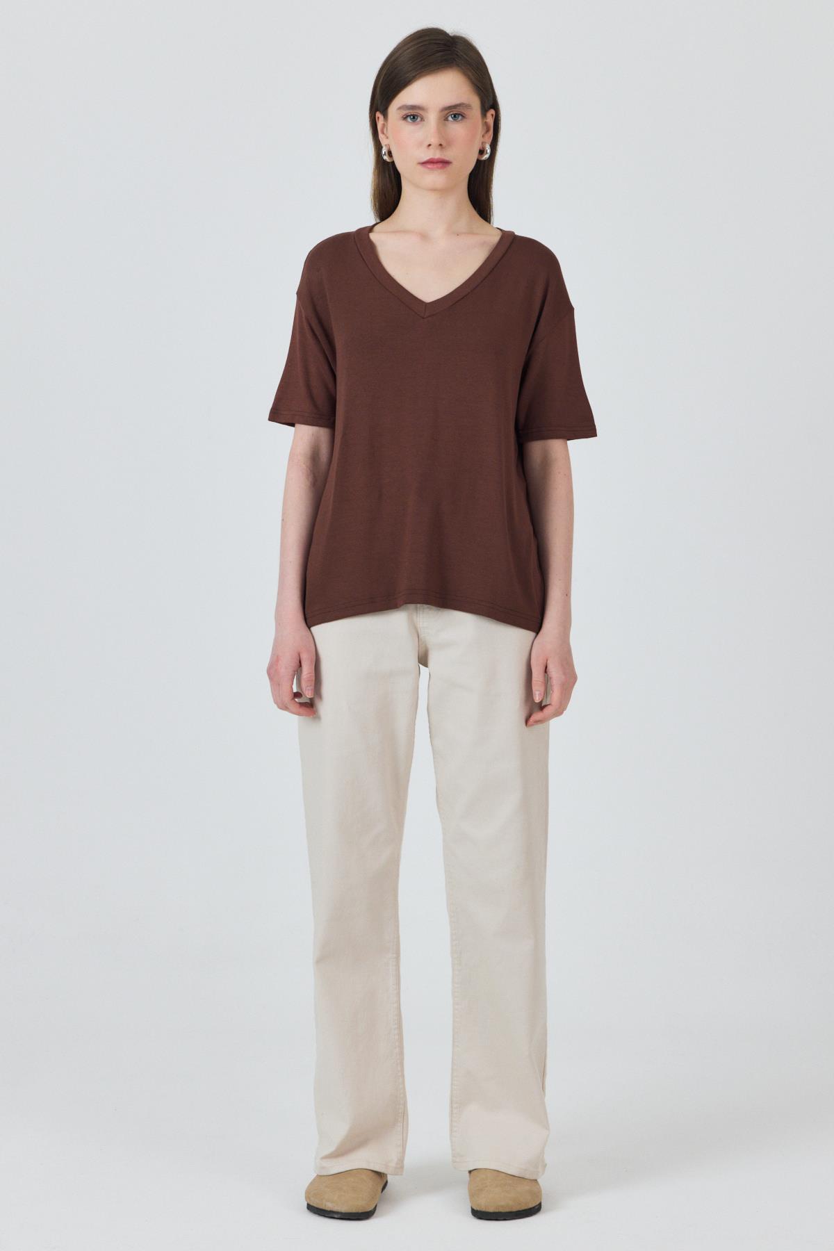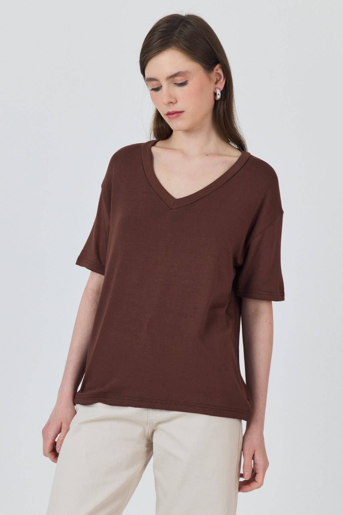 Kahve V Yaka Viskoz/Yumuşak Kumaş Dökümlü Tişört 3077