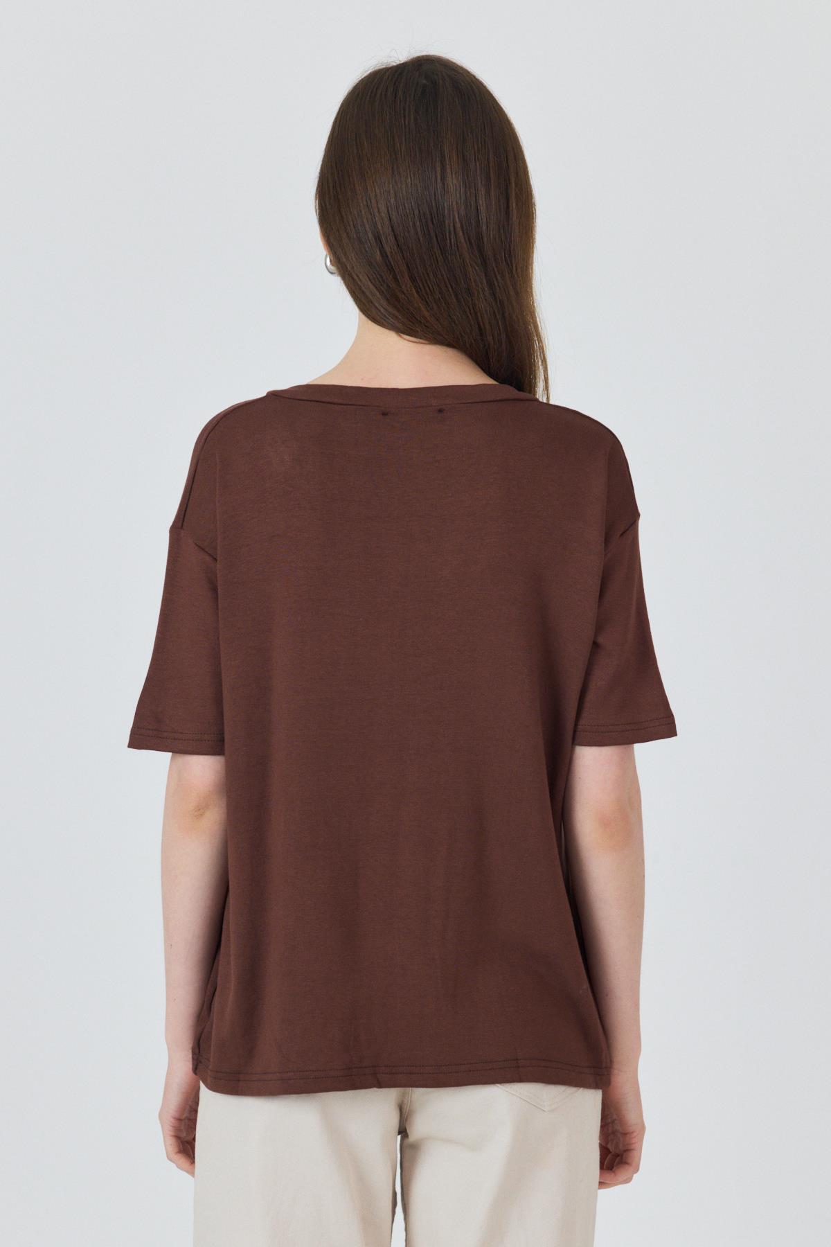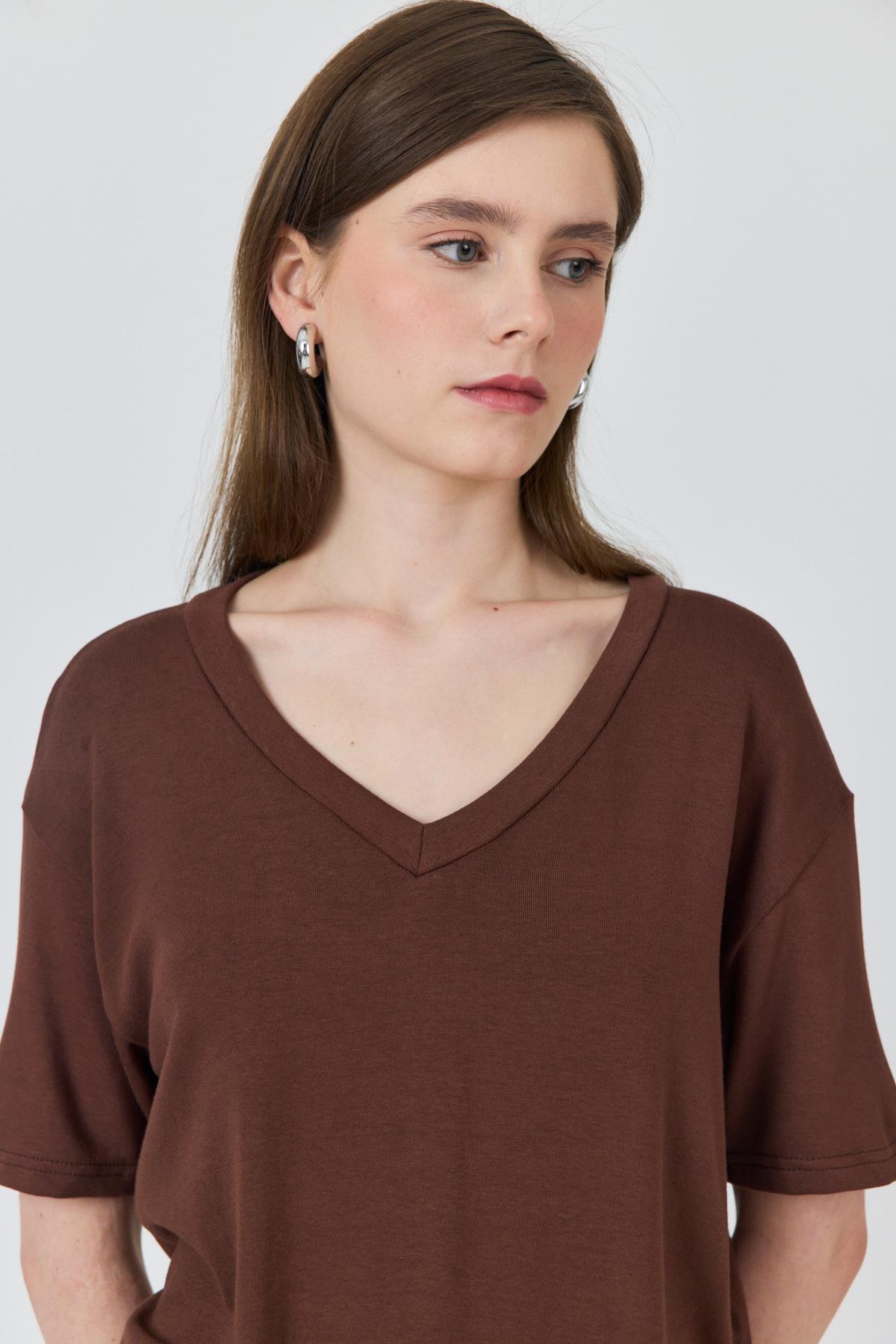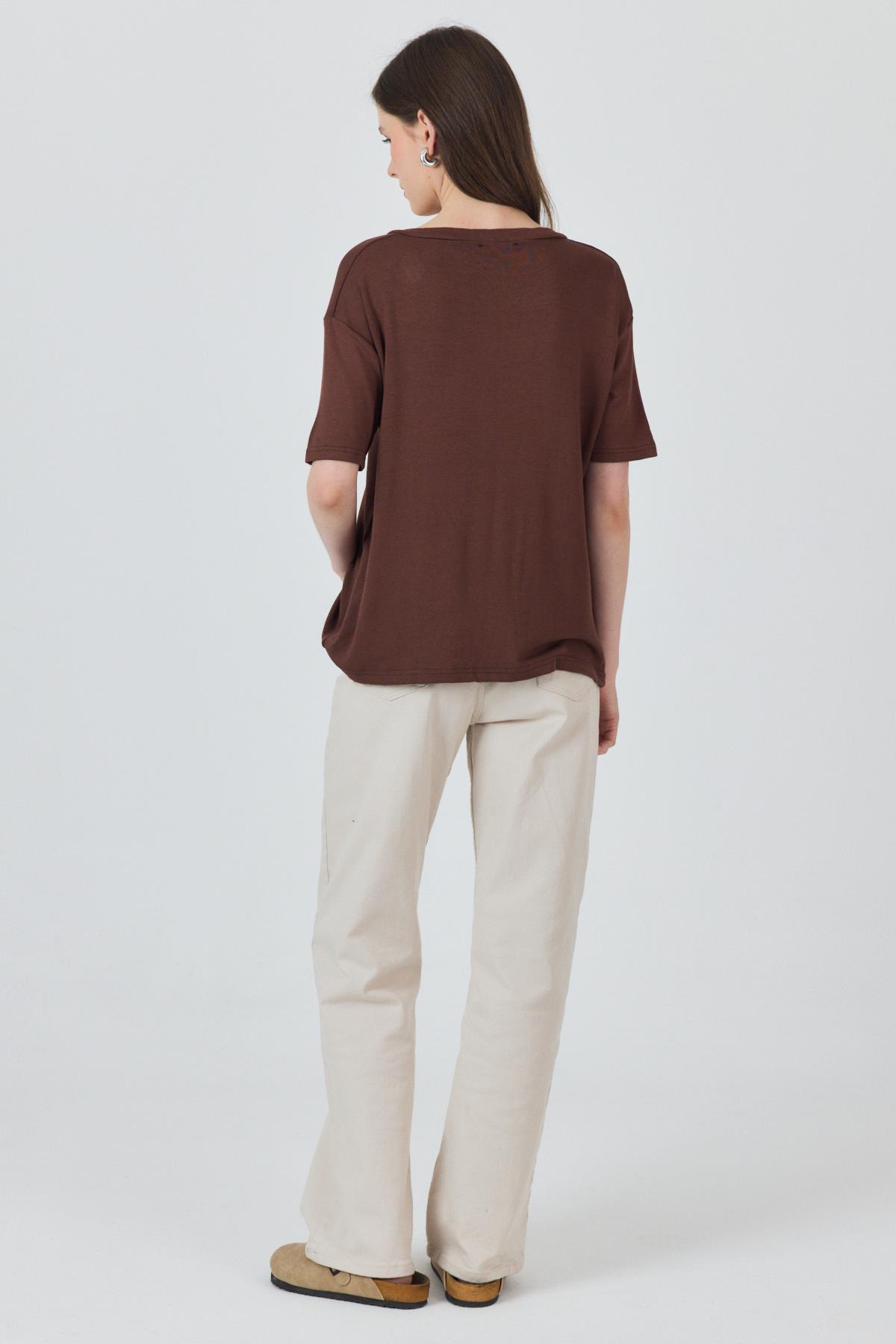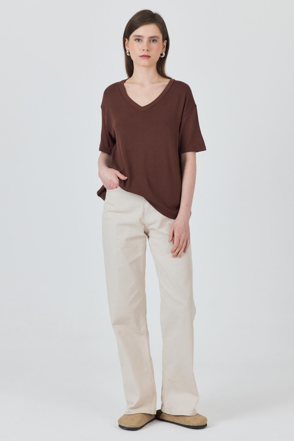 Kahve V Yaka Viskoz/Yumuşak Kumaş Dökümlü Tişört 3077