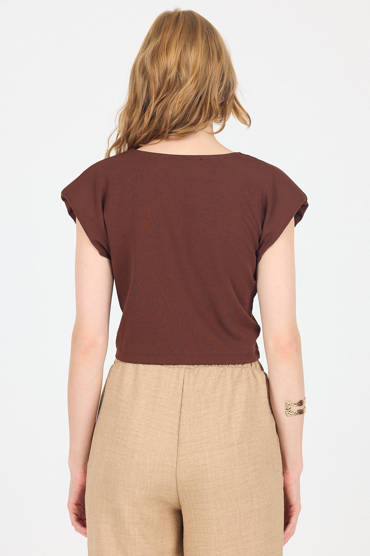 Kahve Vatkalı V Yaka Kruvaze Crop Bluz 4227