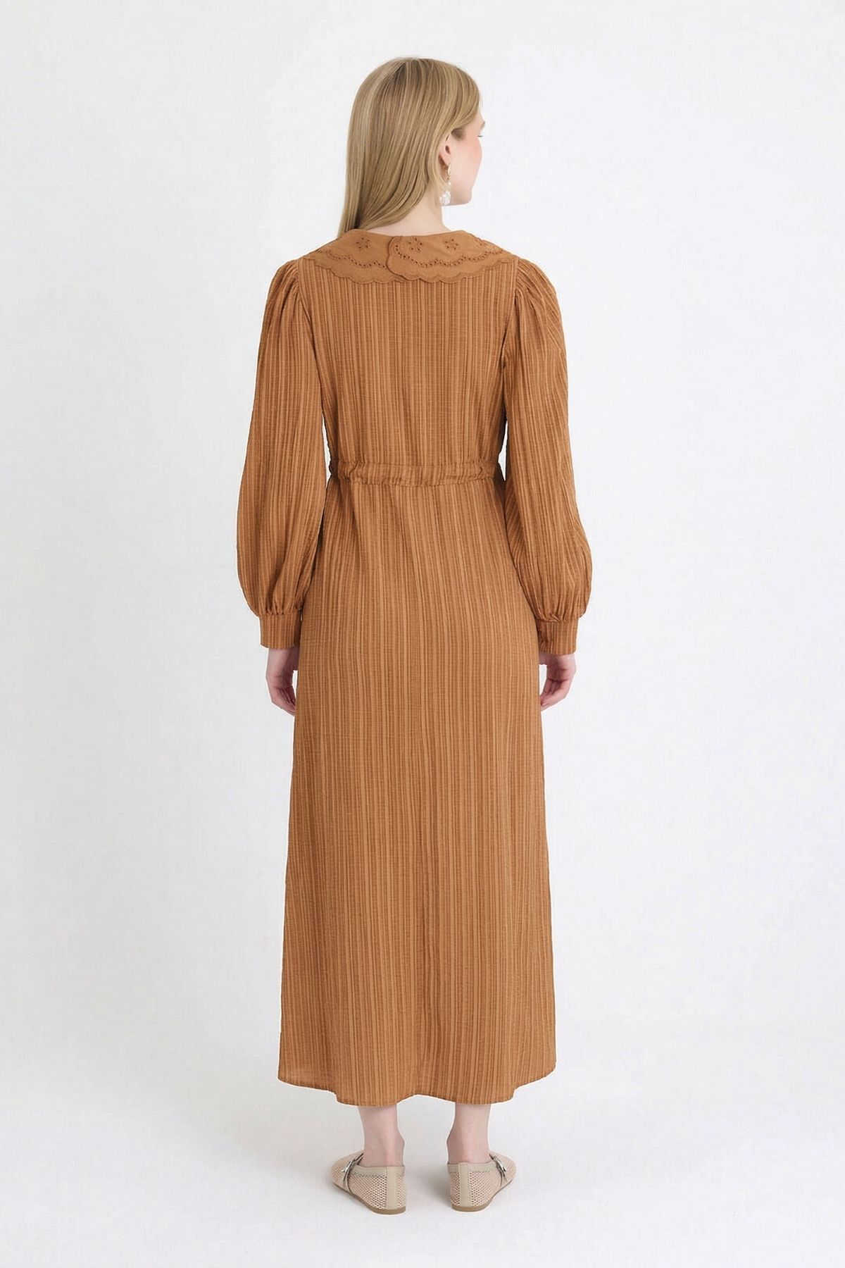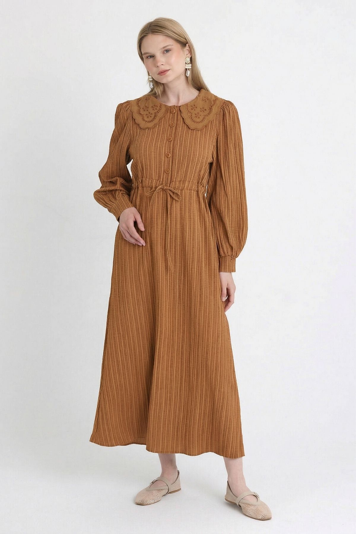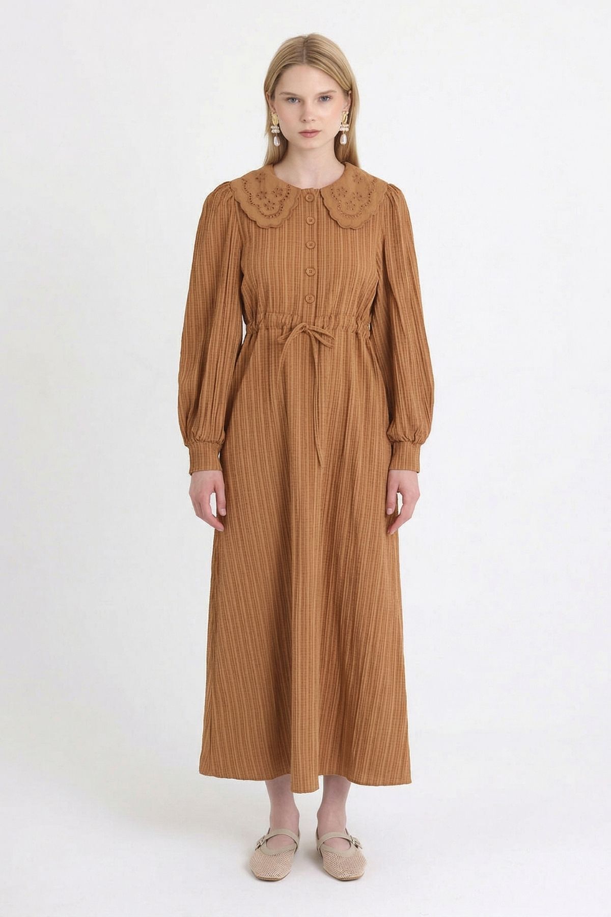 Kahve Yaka Dantelli Bel Bağlamalı Elbise 4330A