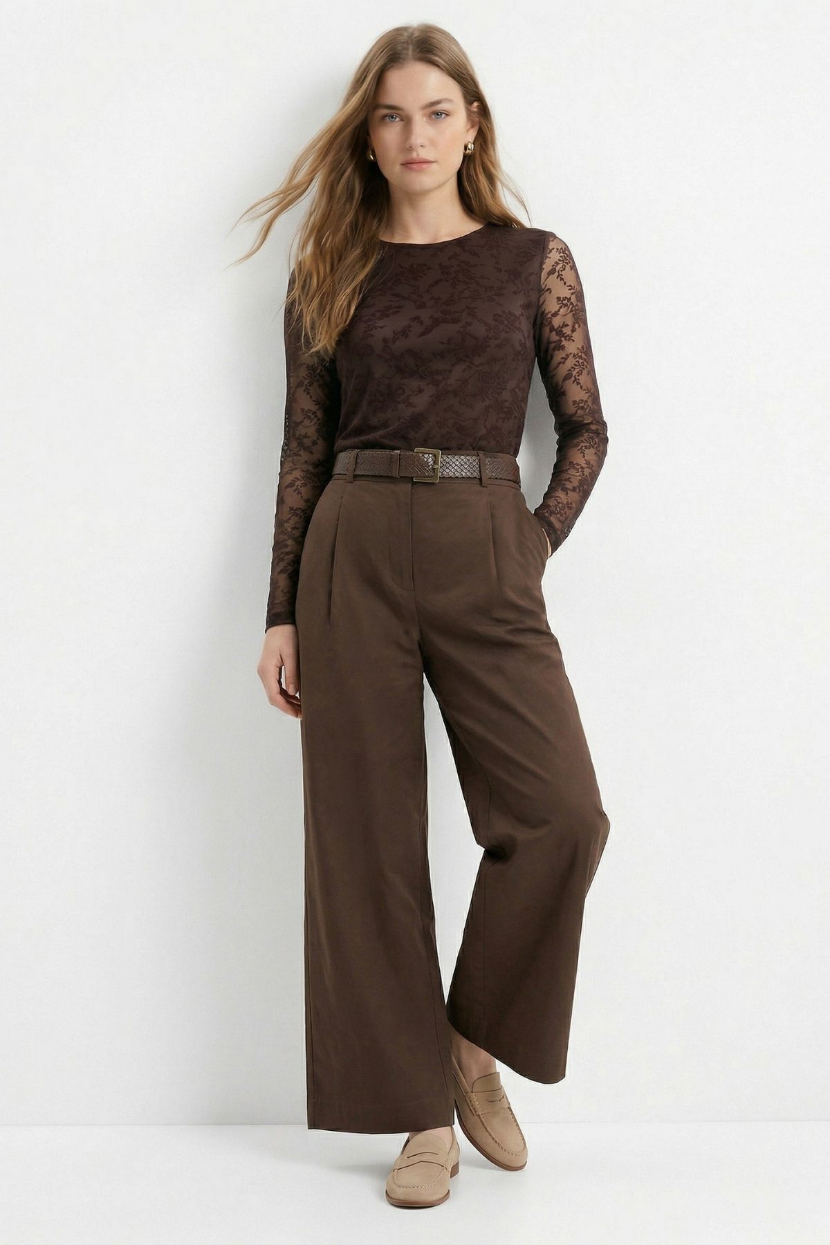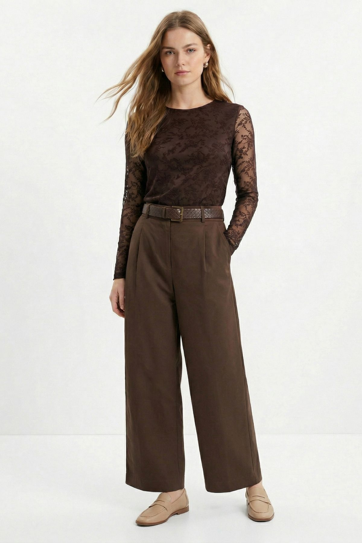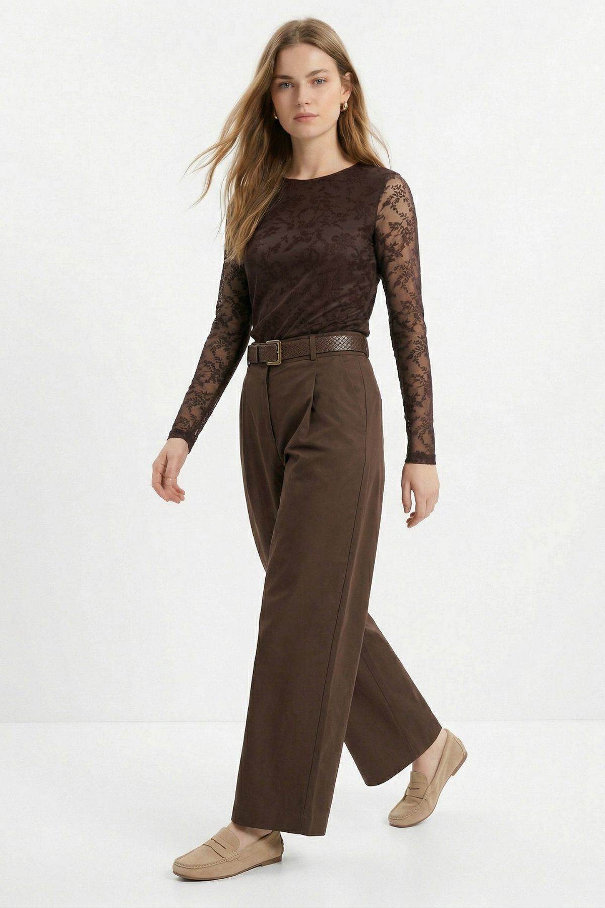 Kahve Yüksek Bel Kemerli Pileli Pantolon 3918