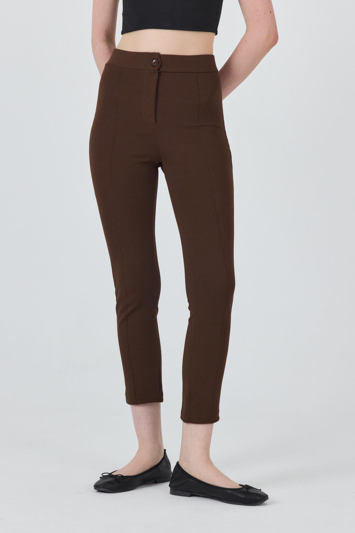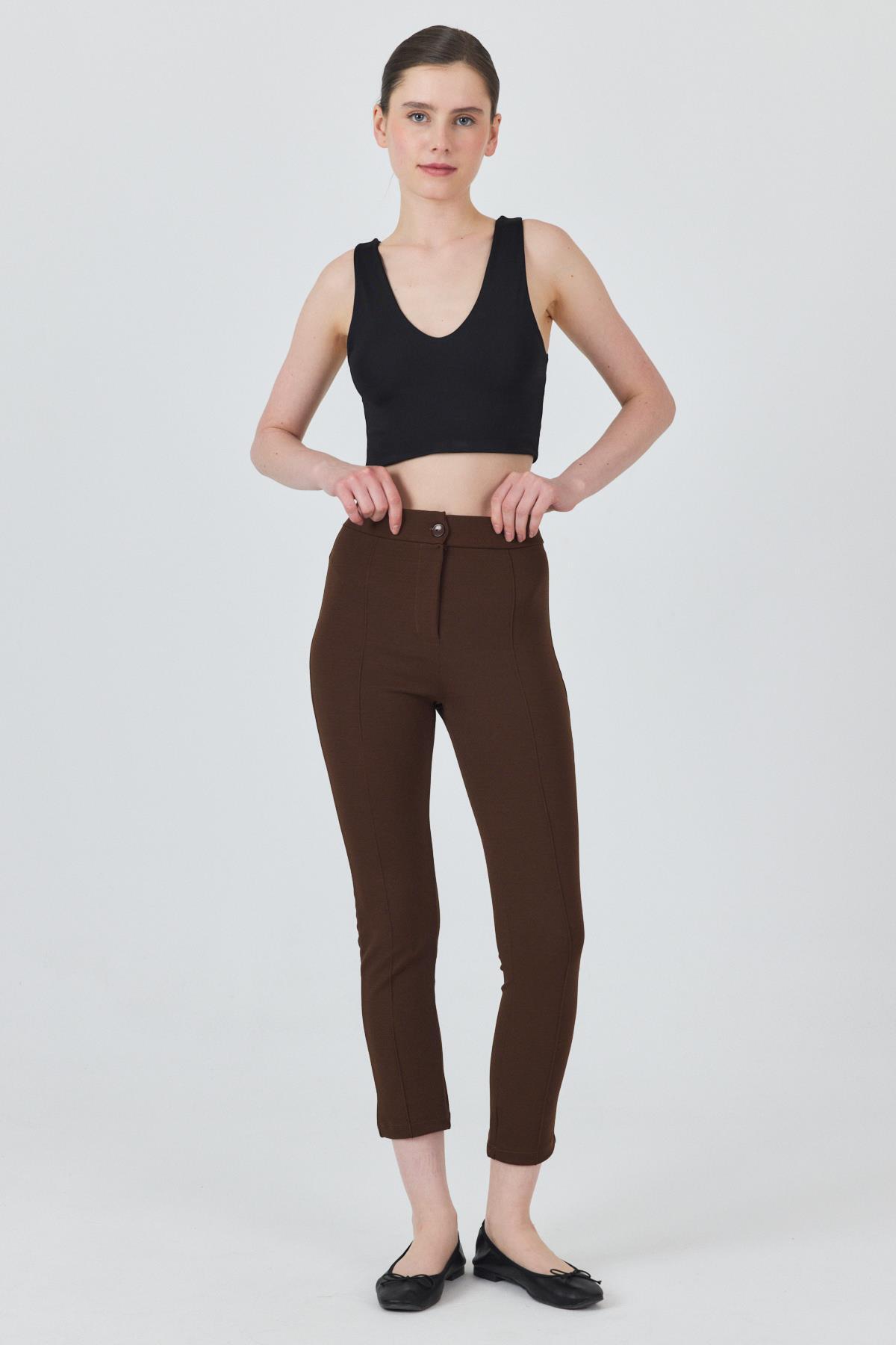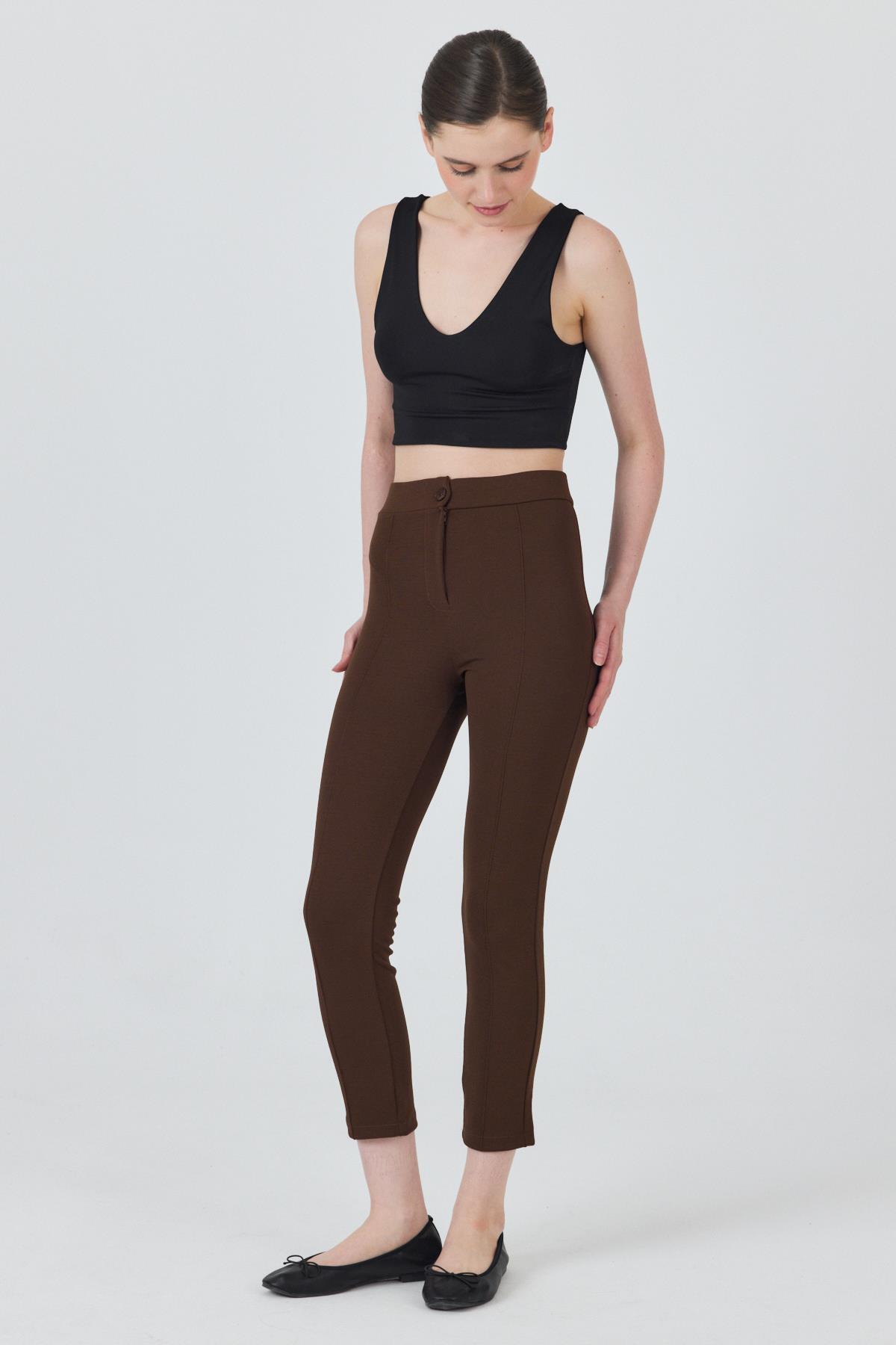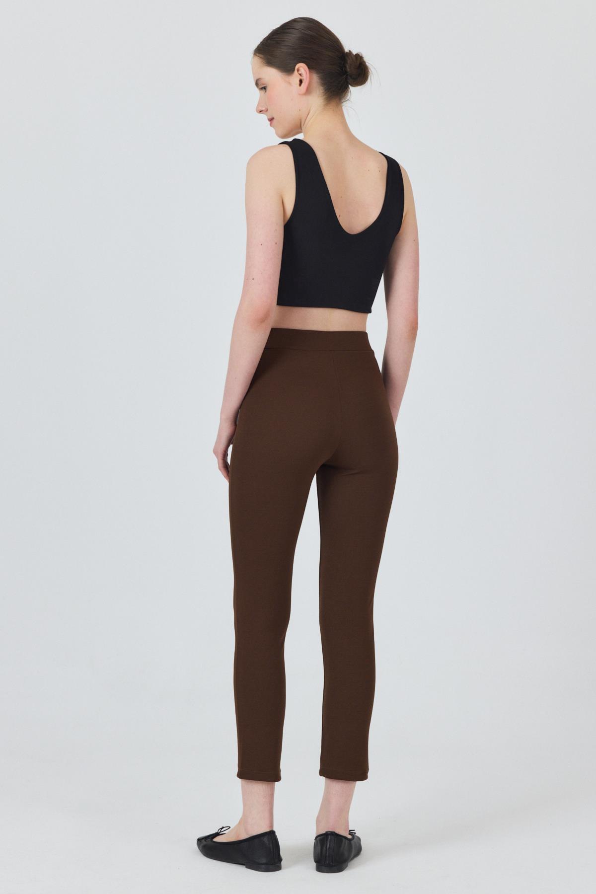 Kahve Yüksek Bel Nervür Dikiş Detaylı Tayt Pantolon 6875A