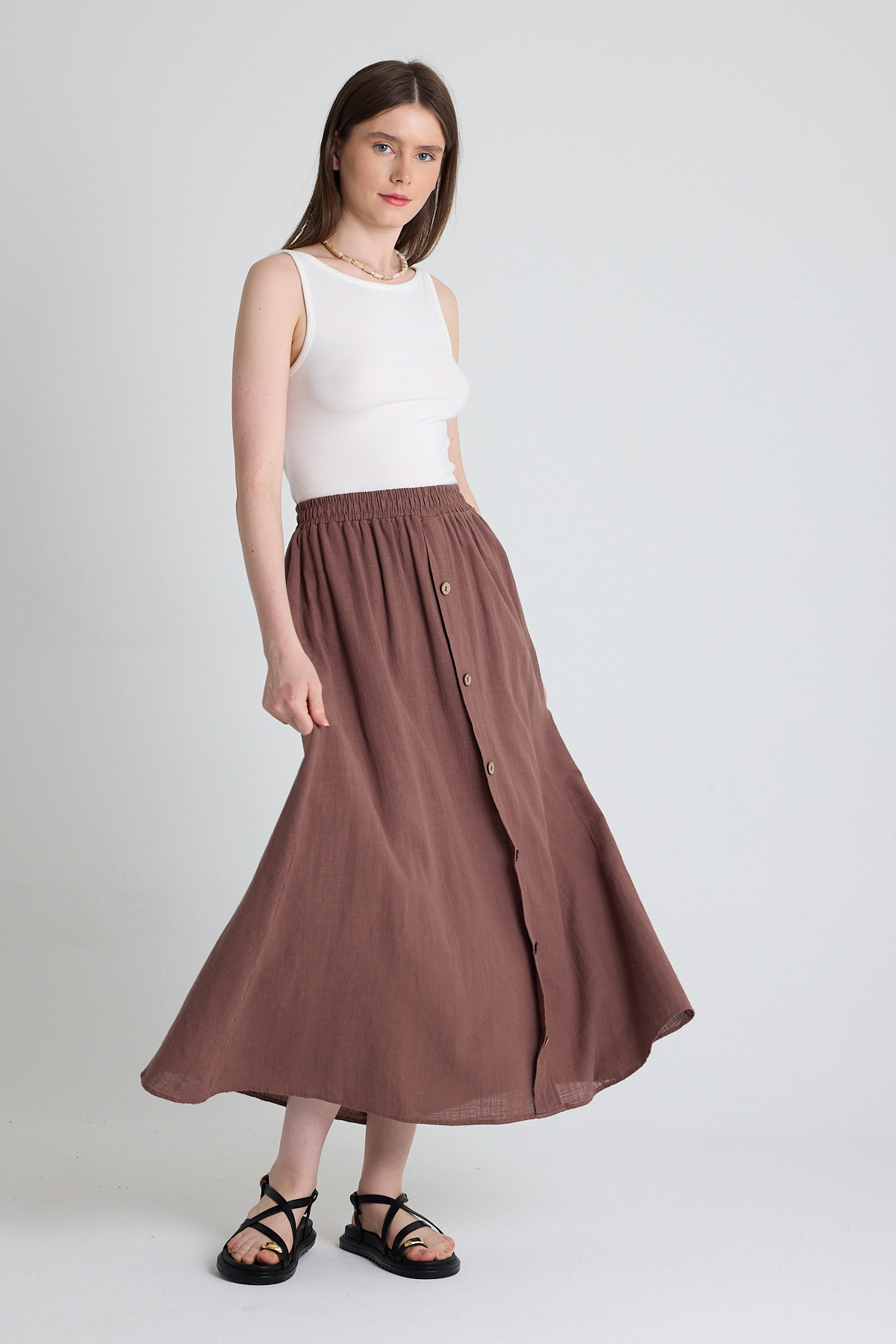 Kahverengi Keten Görünümlü %100 Pamuk Düğmeli Midi Etek 3419