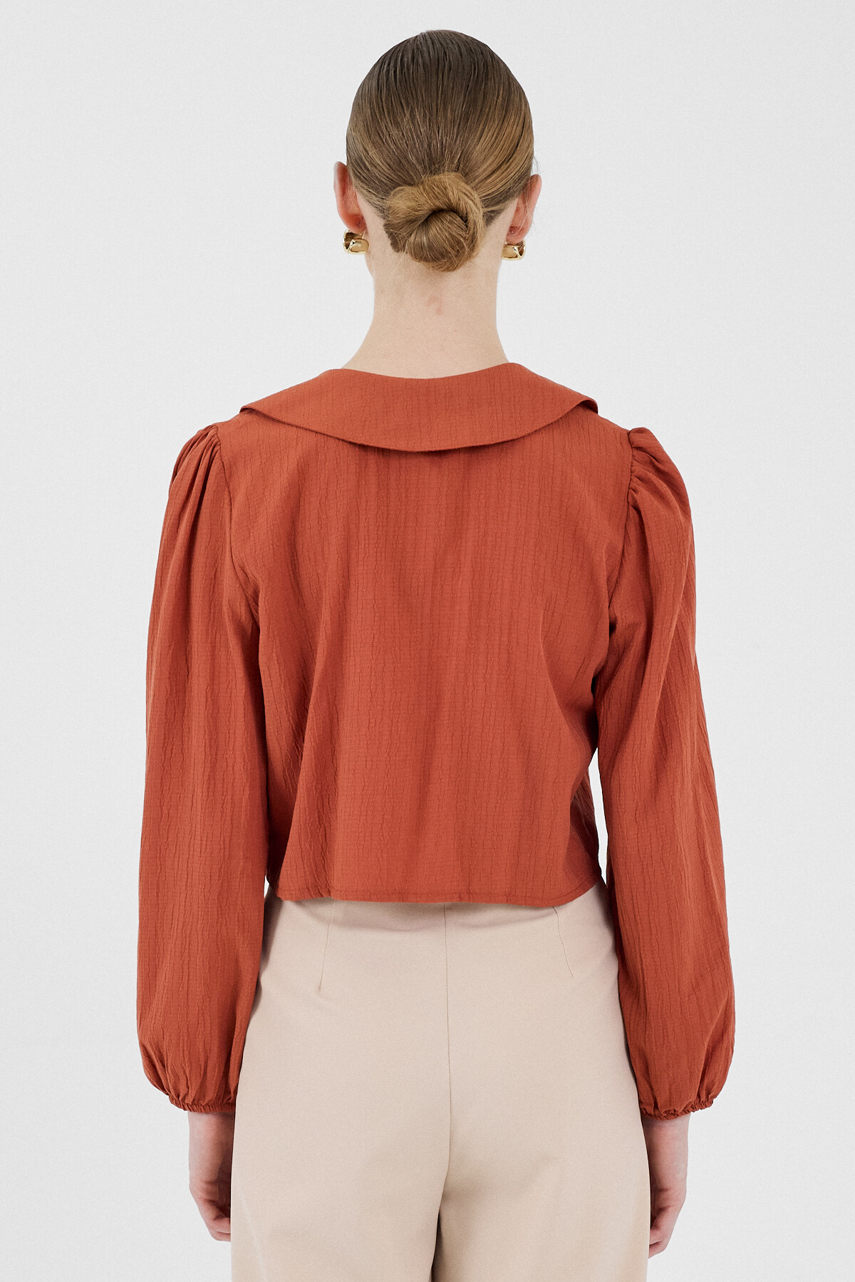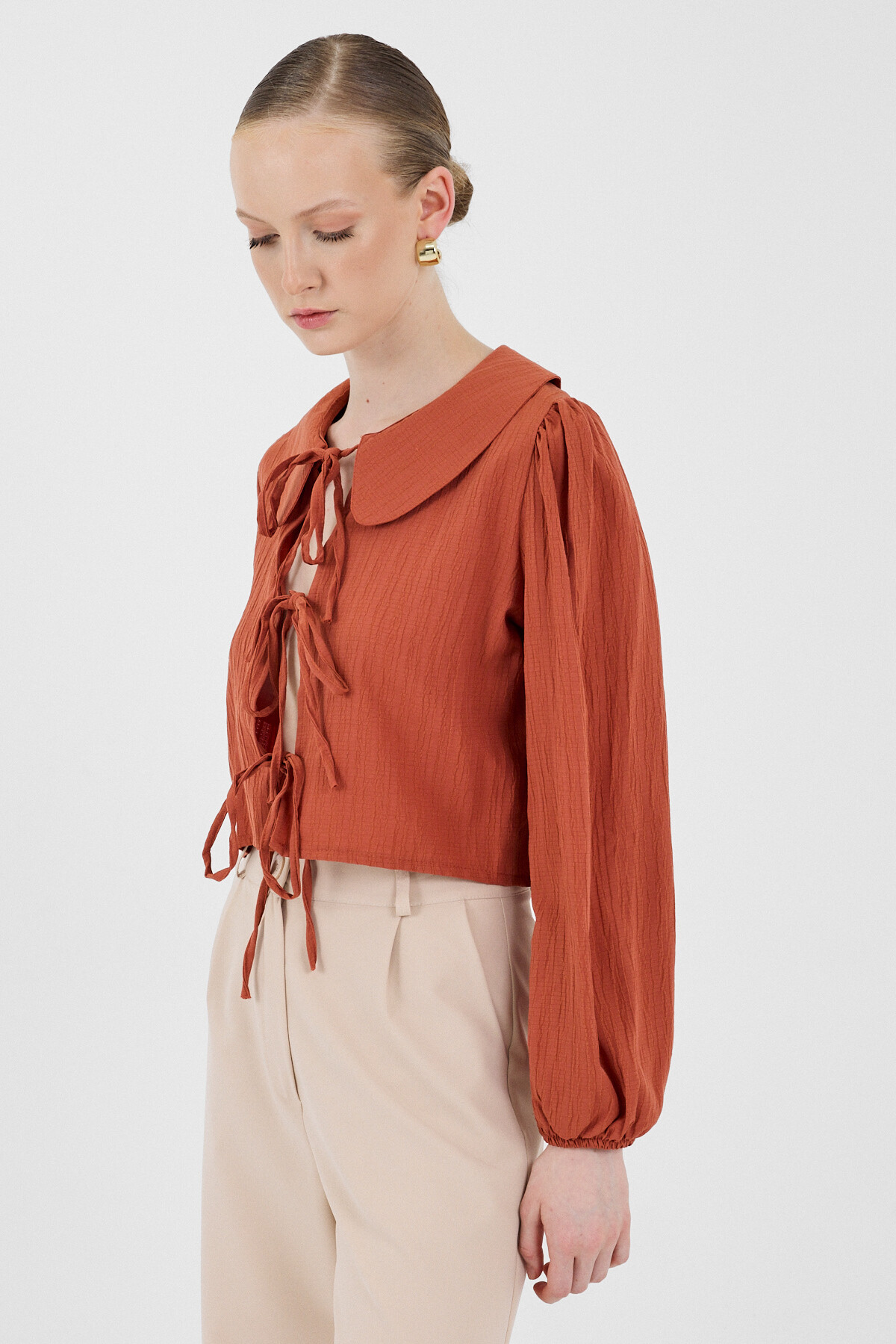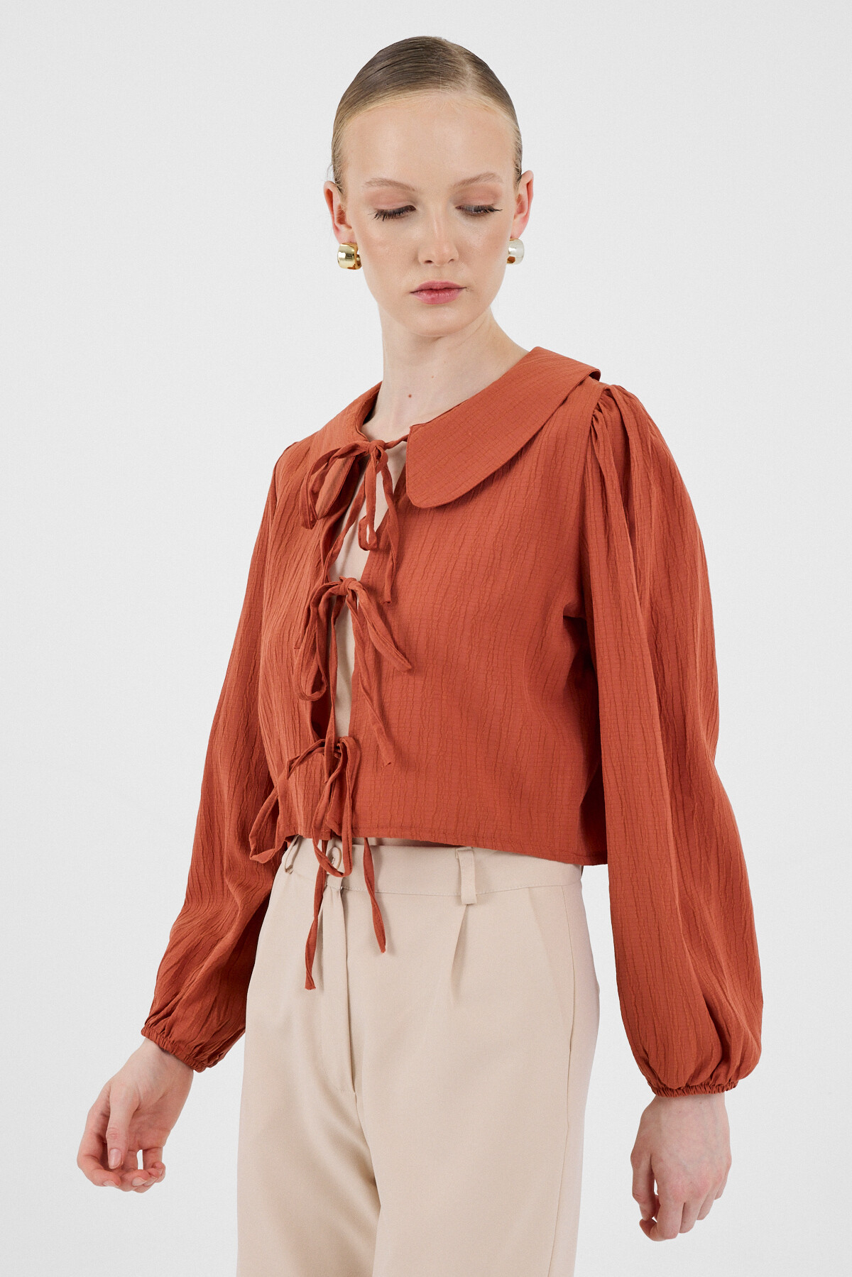 Kiremit Bağlama Detaylı Bebe Yaka Uzun Kollu Bluz 8020A