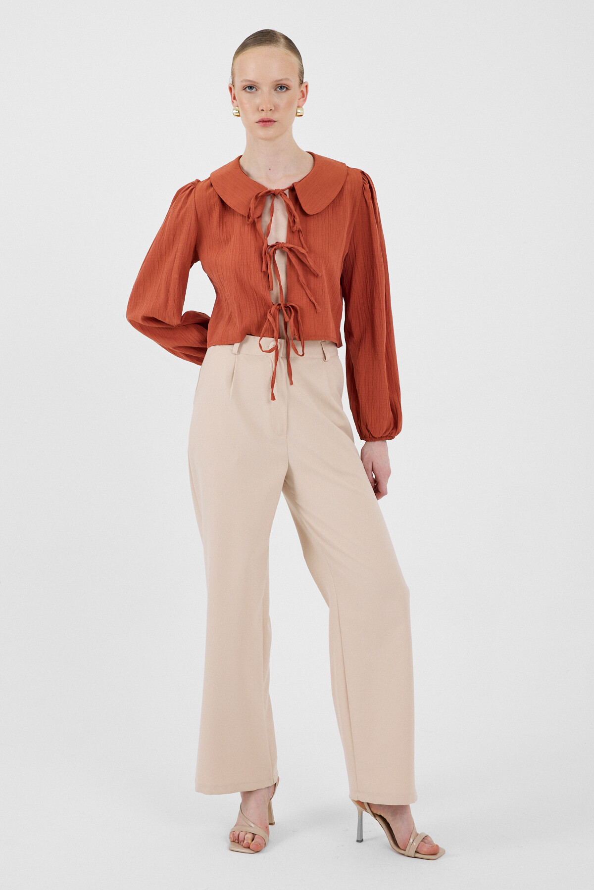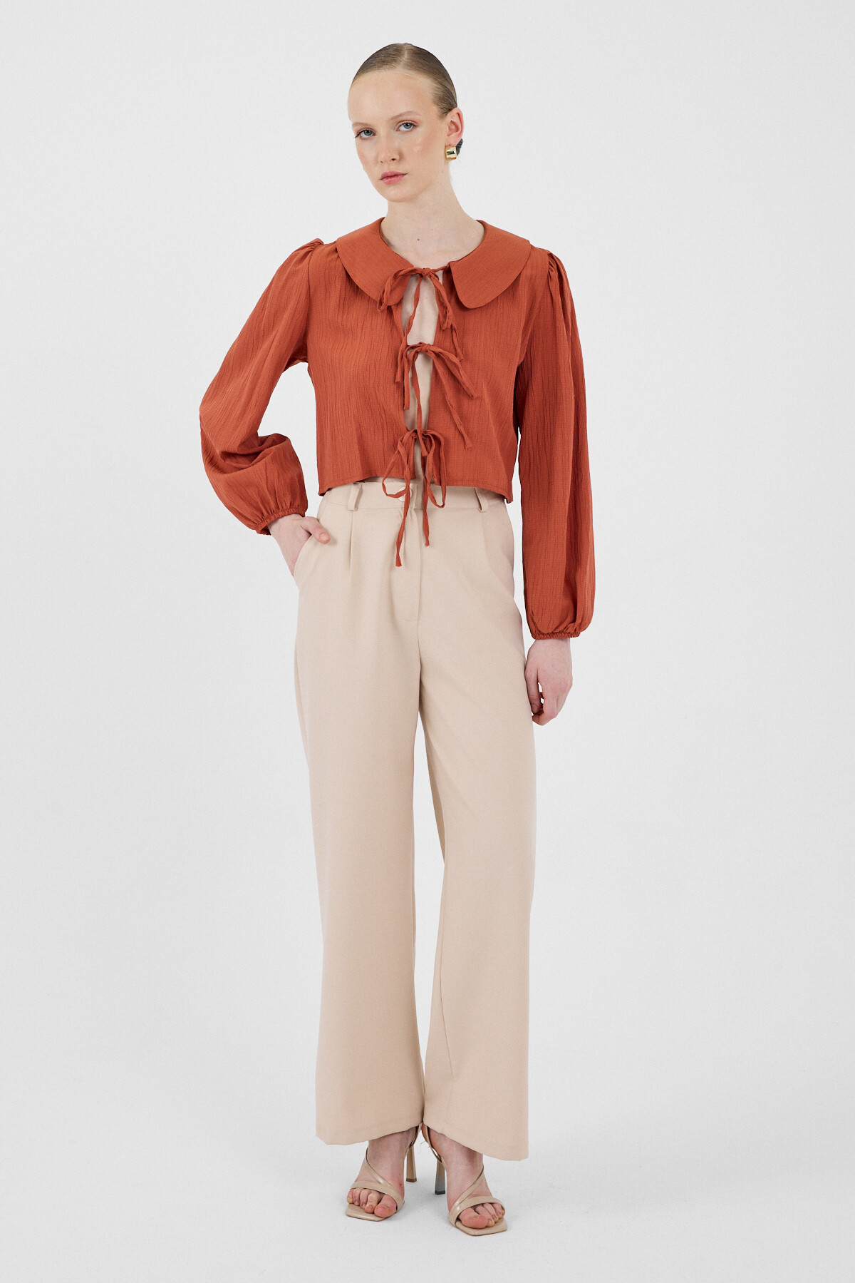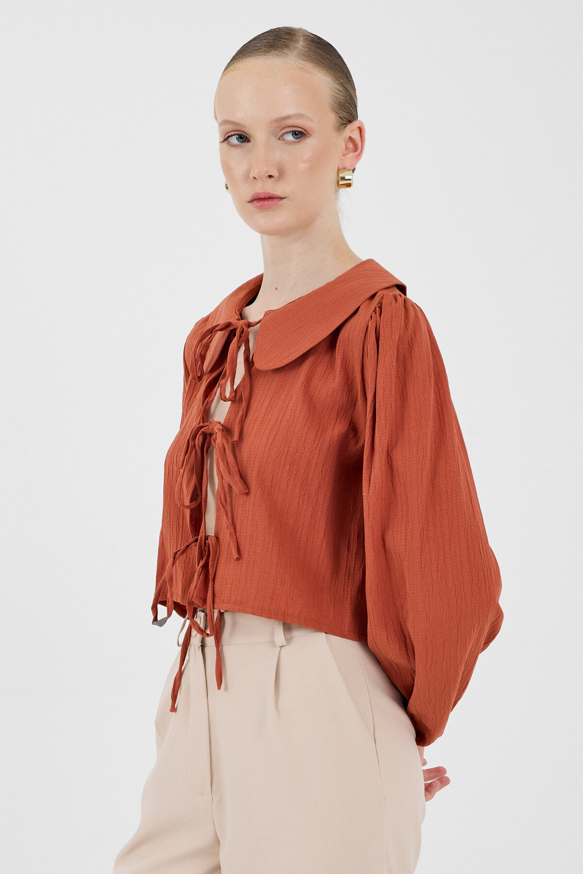 Kiremit Bağlama Detaylı Bebe Yaka Uzun Kollu Bluz 8020A