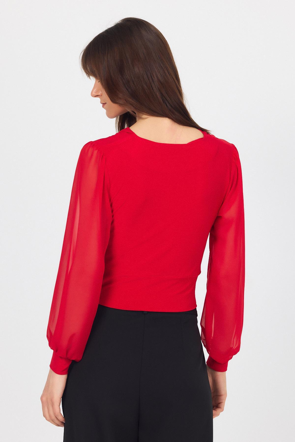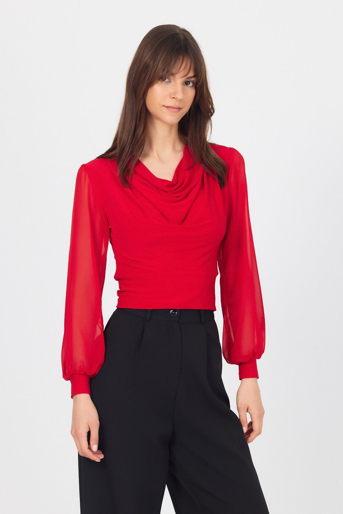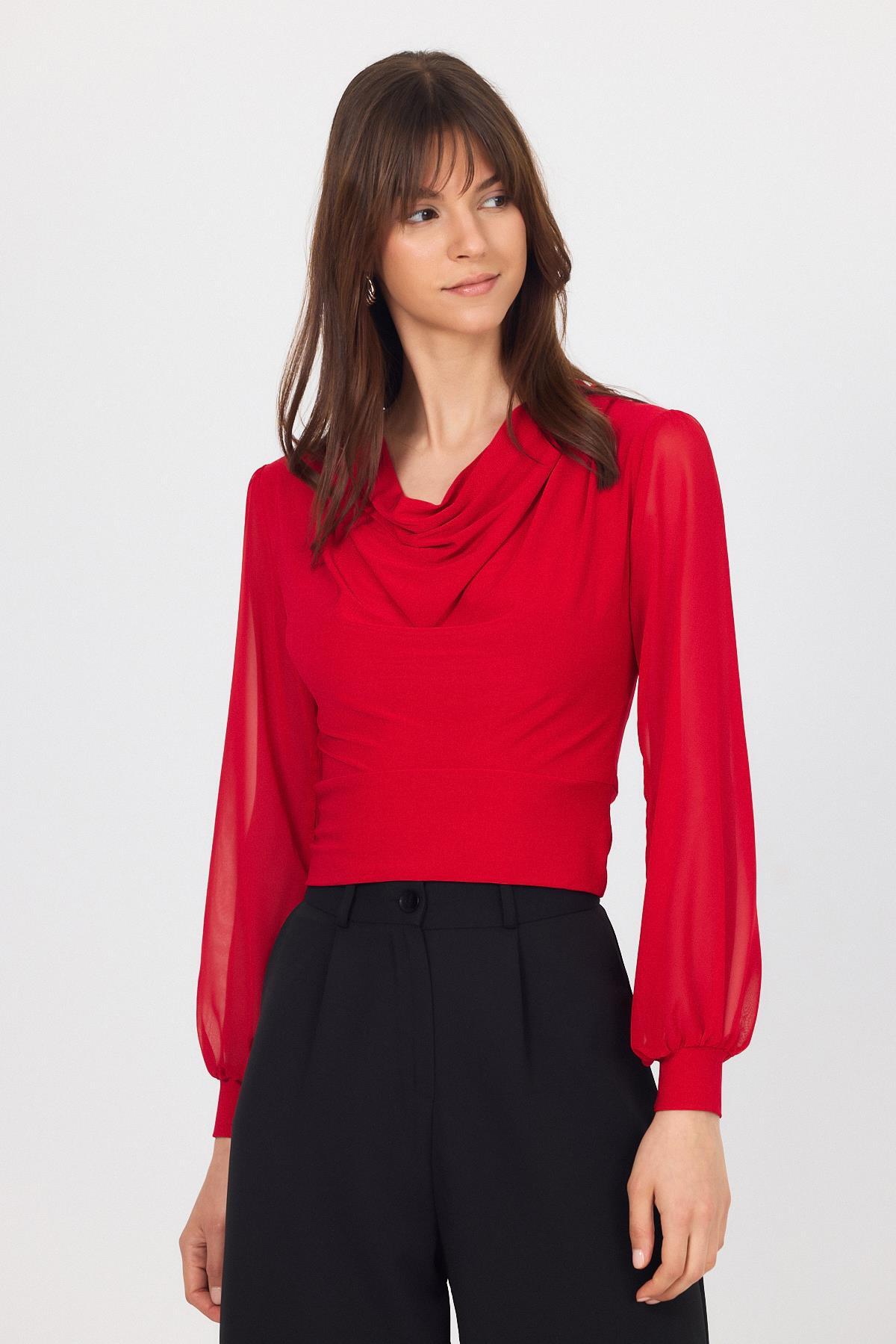 Kırmızı Drapeli Tül Kol Detaylı Bluz 9474
