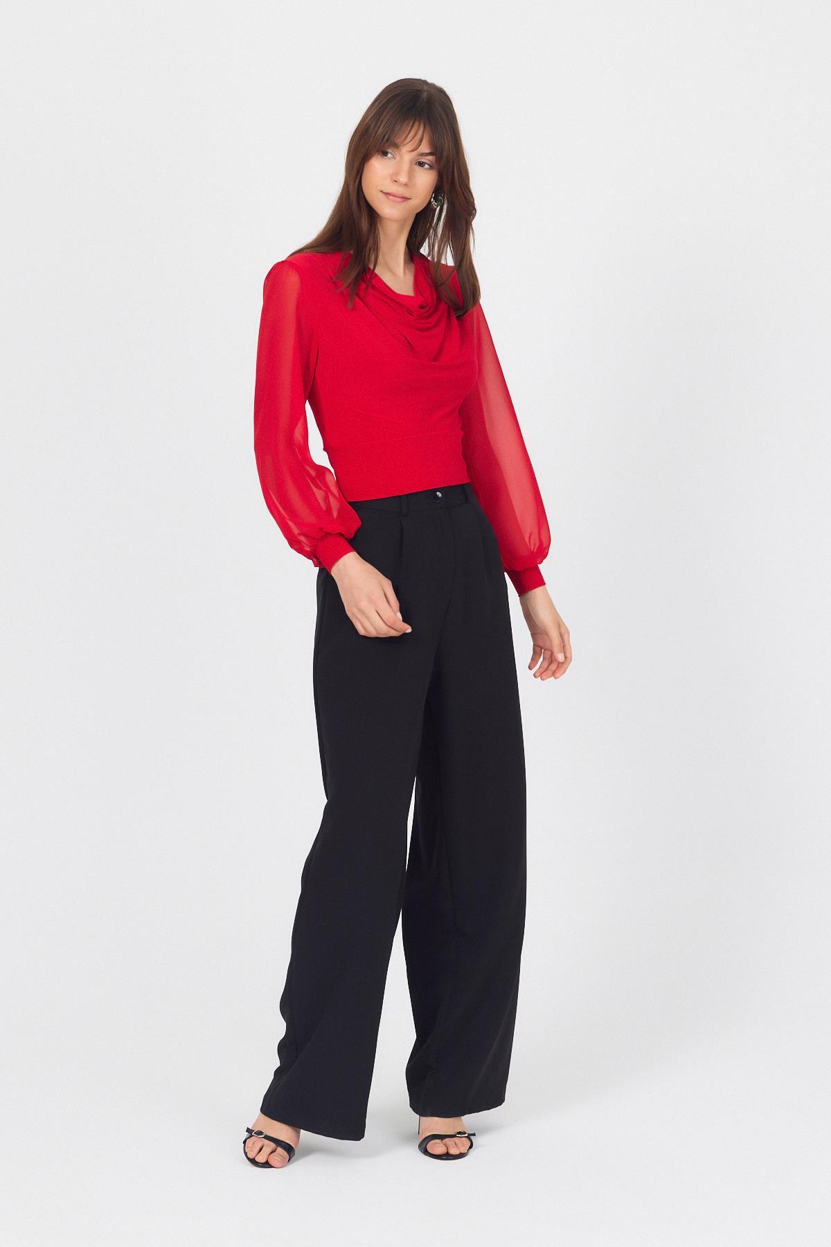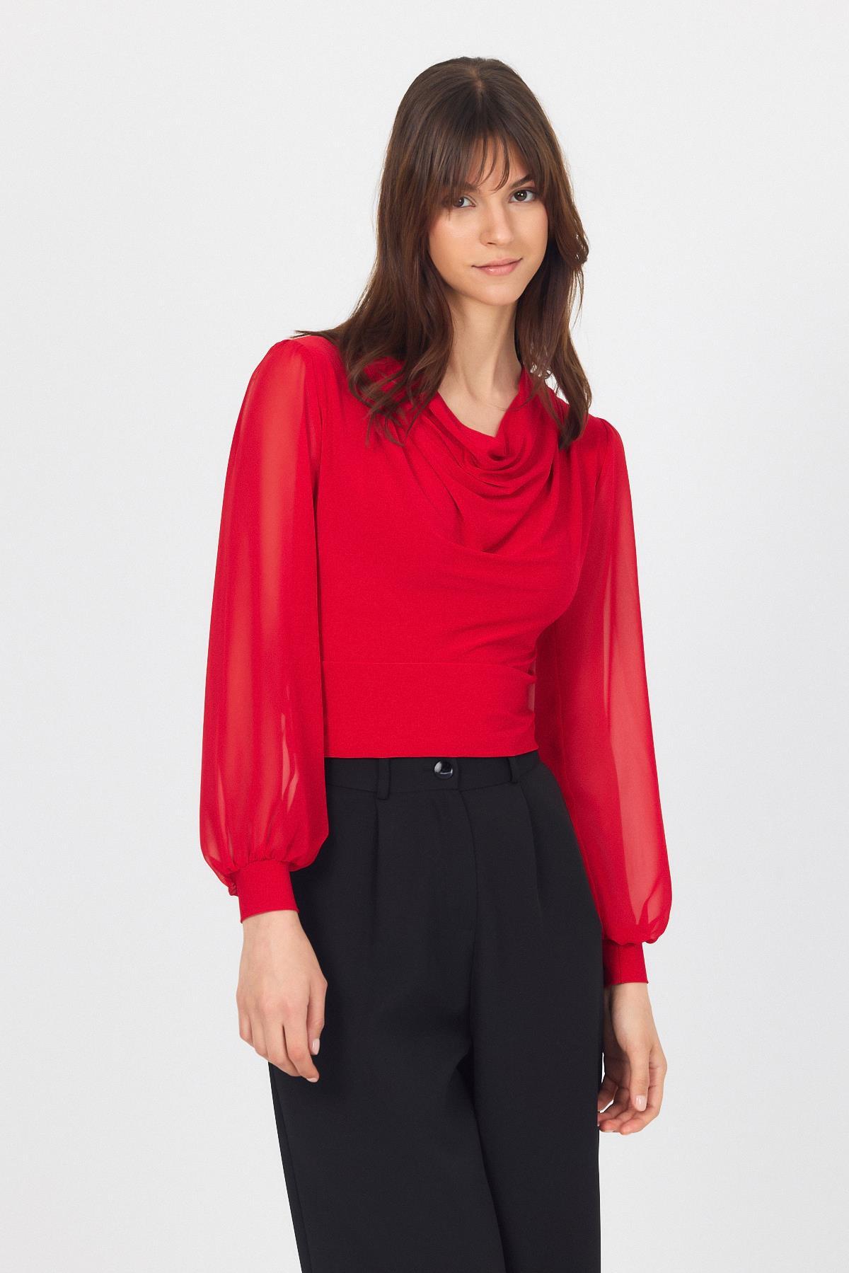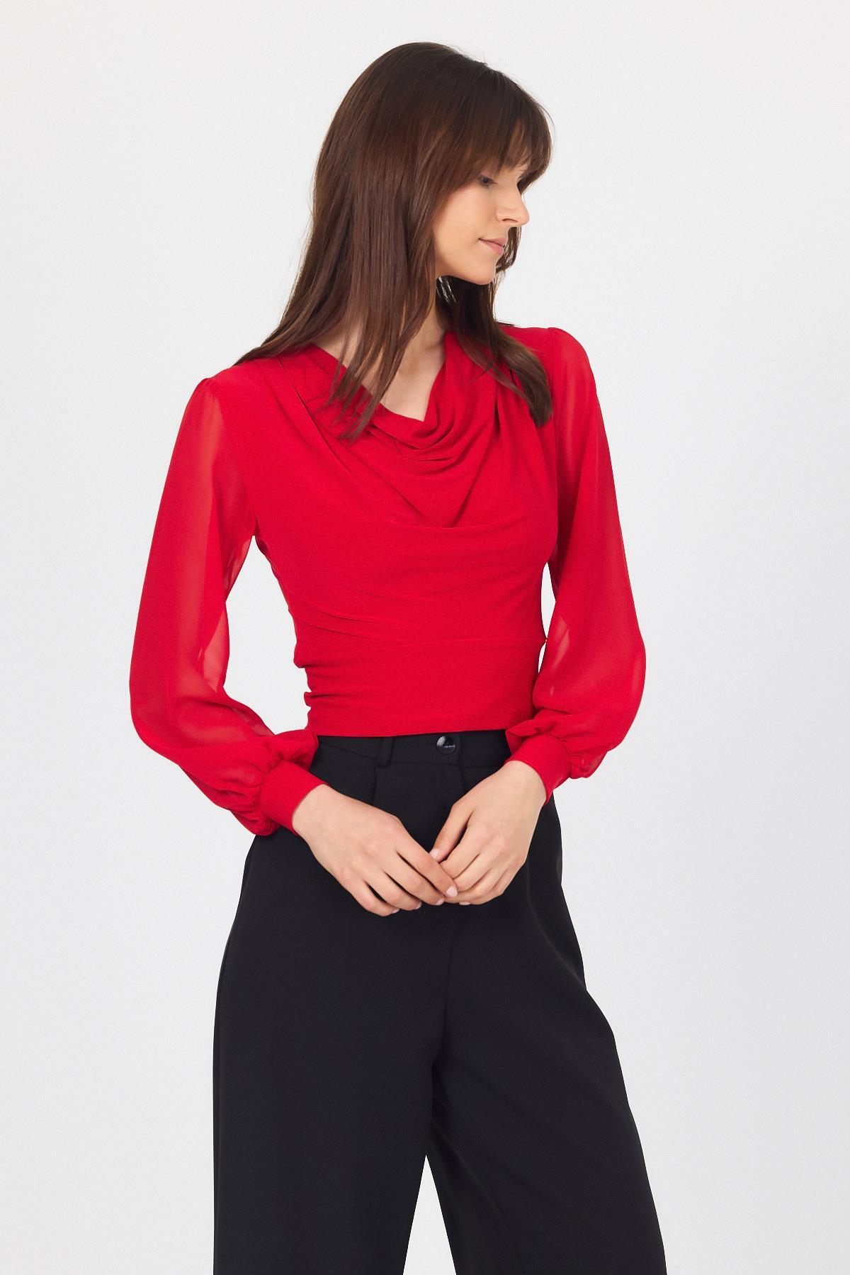Kırmızı Drapeli Tül Kol Detaylı Bluz 9474