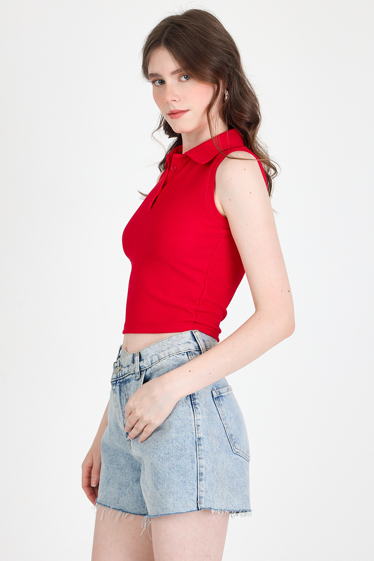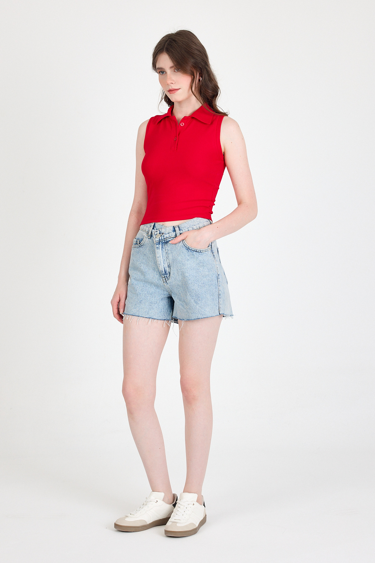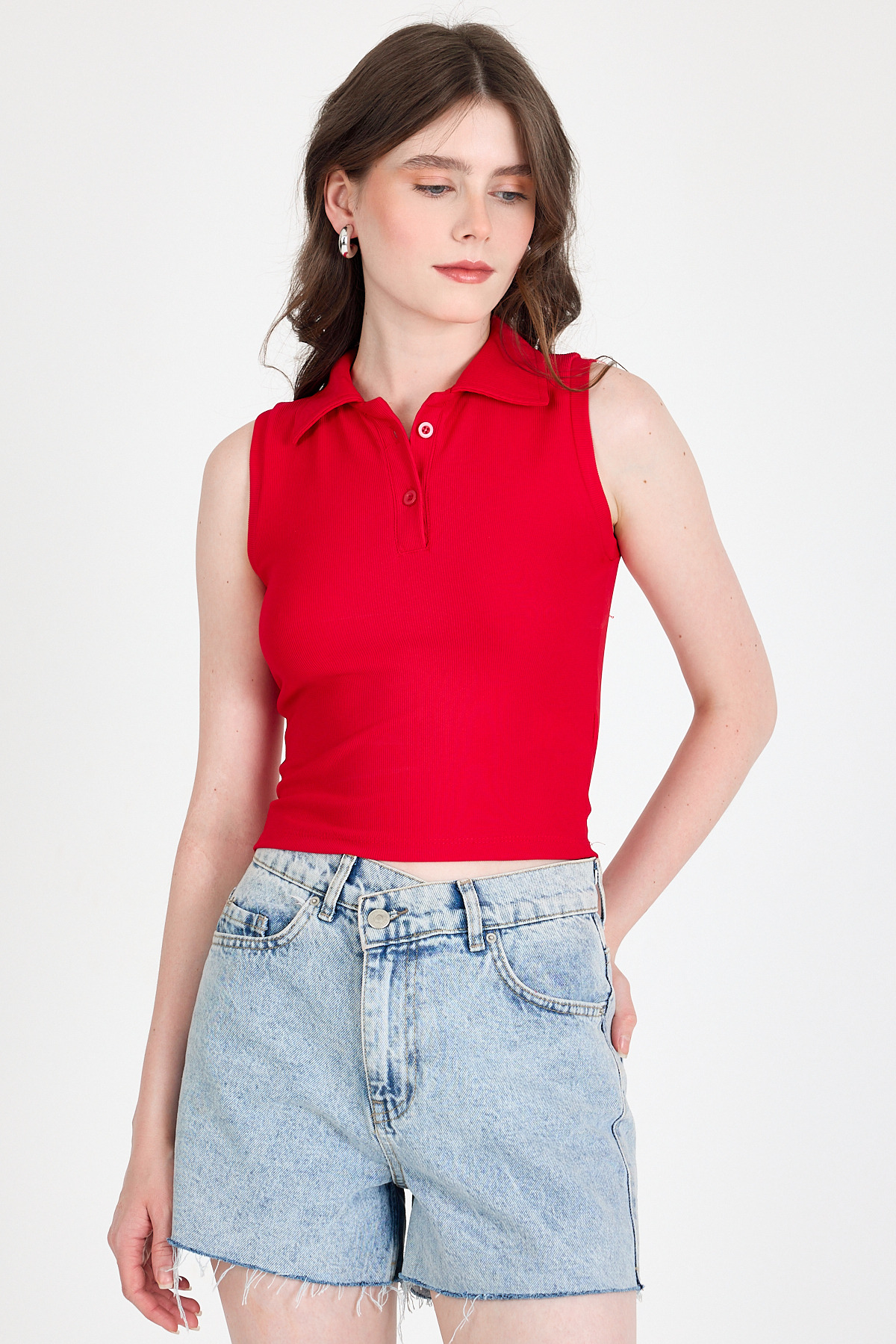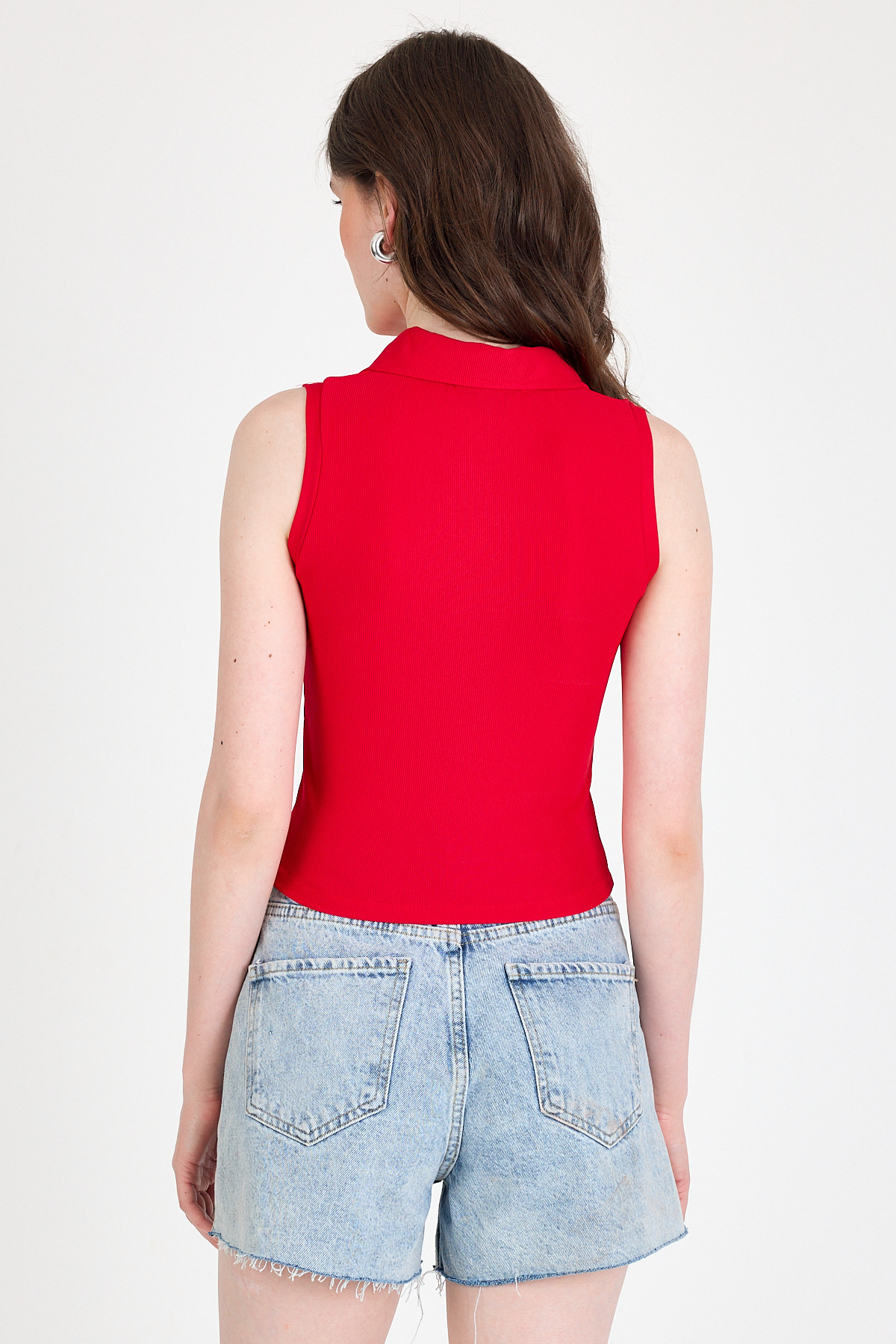 Kırmızı Düğmeli Polo Yaka Sıfır Kol Örme Bluz 2219