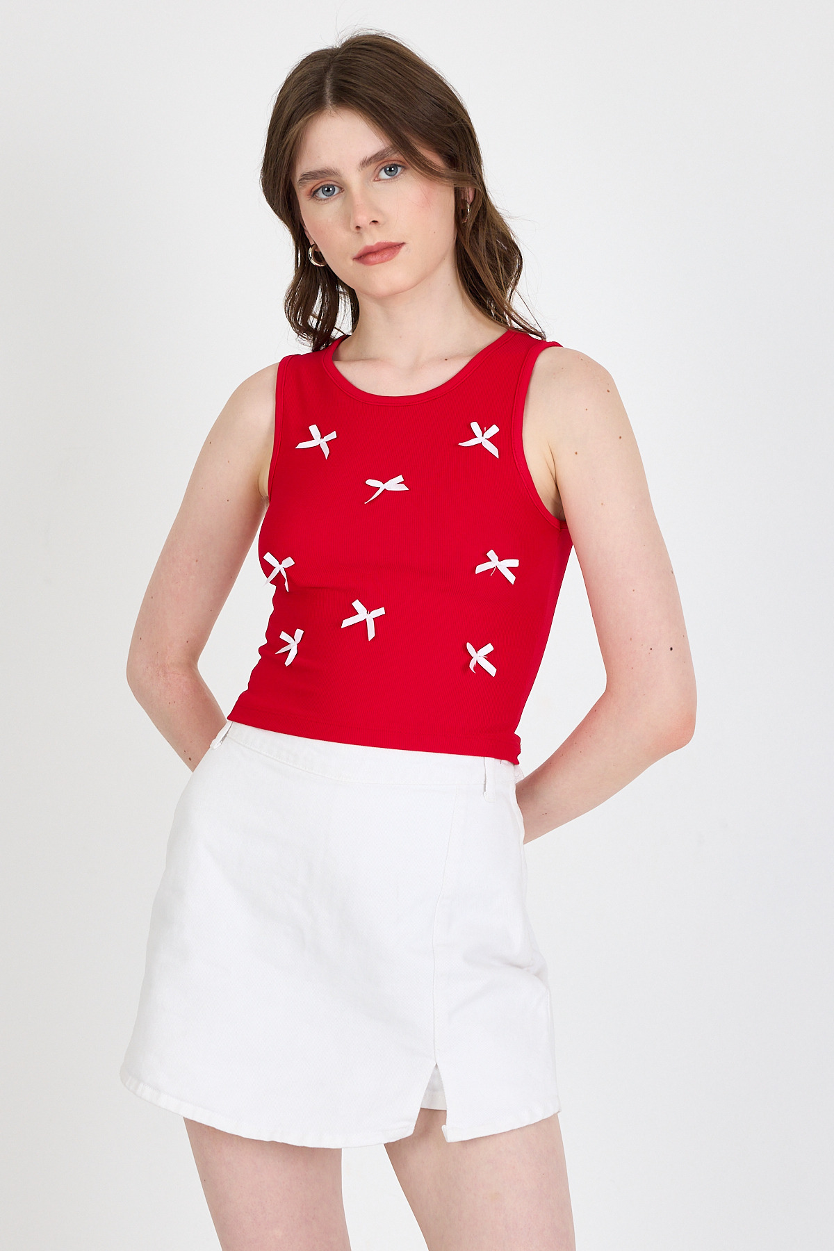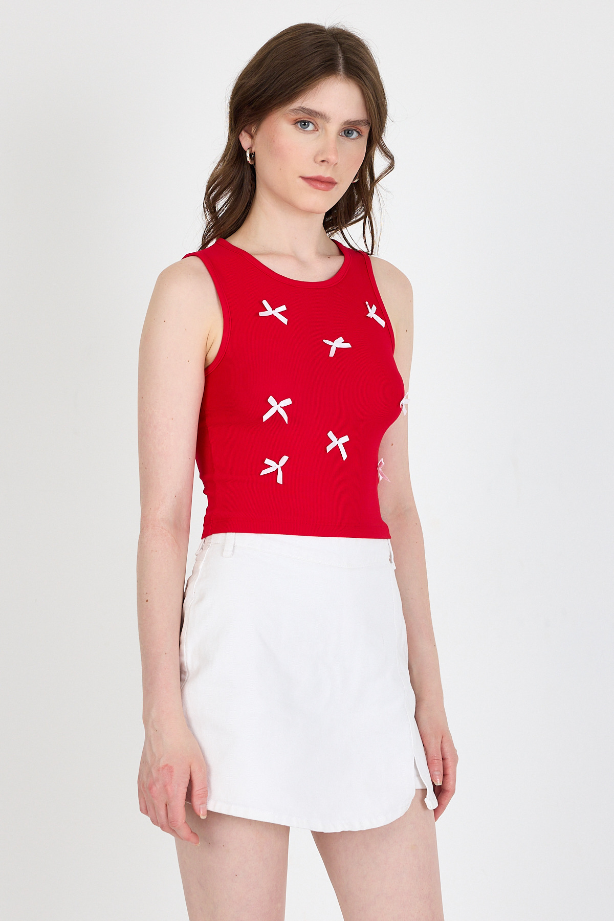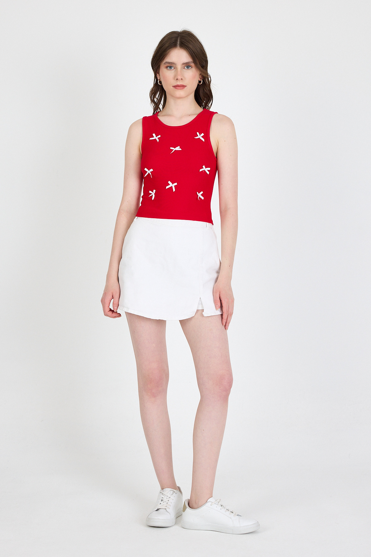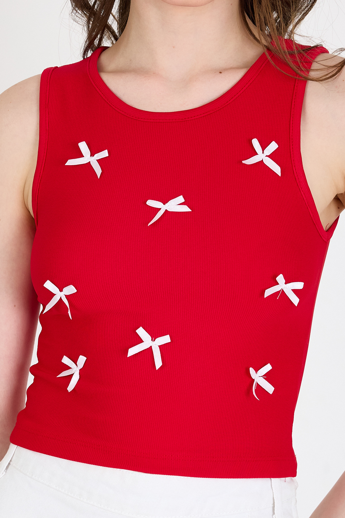 Kırmızı Fiyonk İşlemeli Crop Örme Atlet 0849