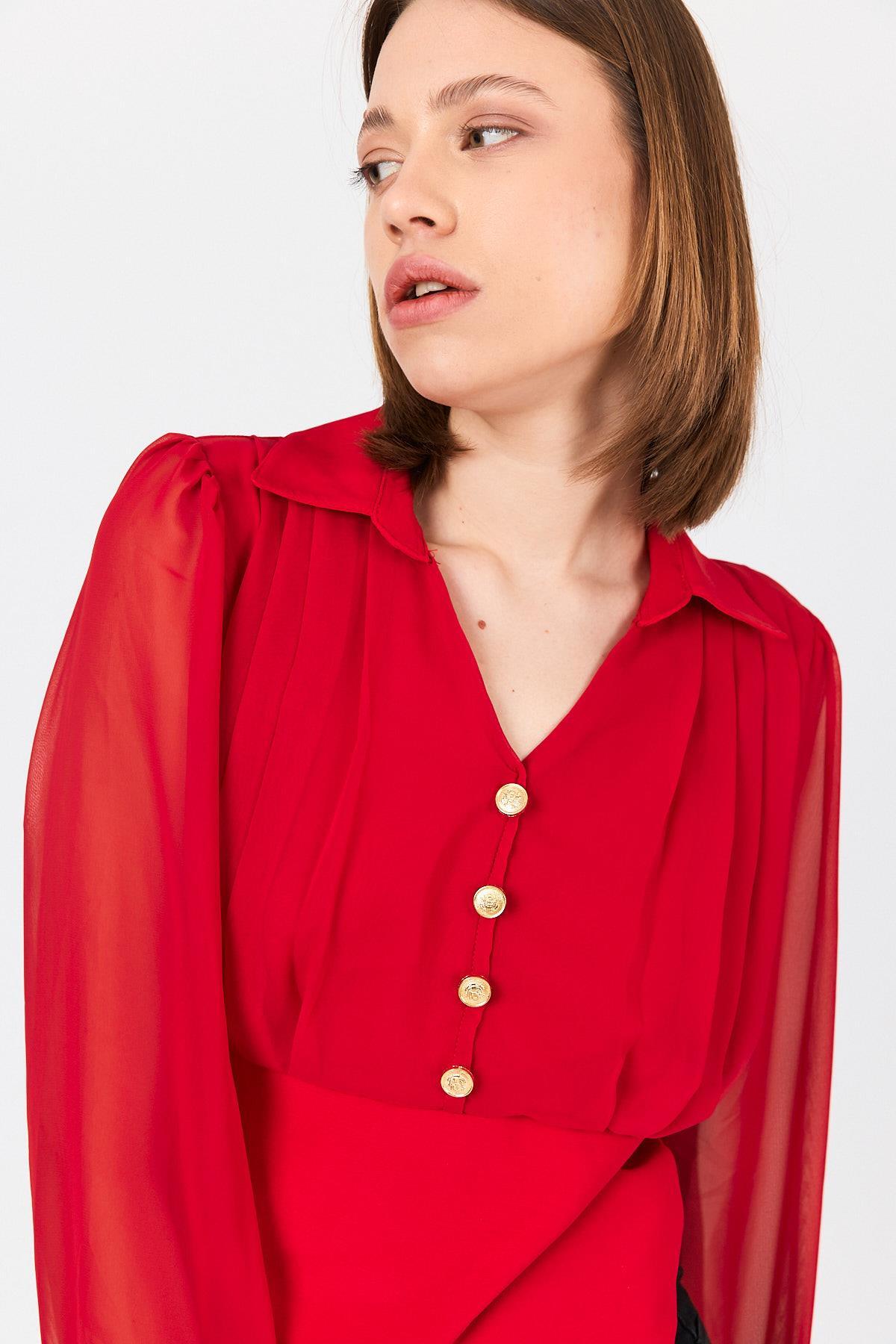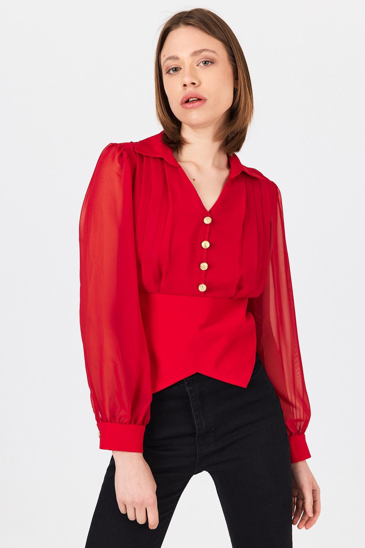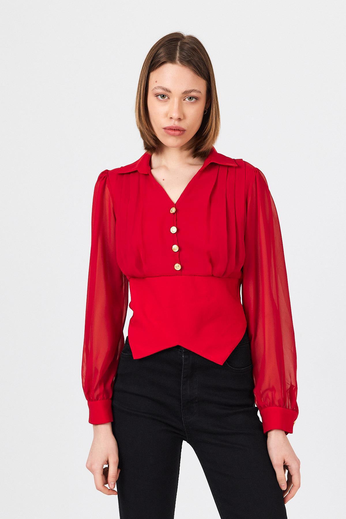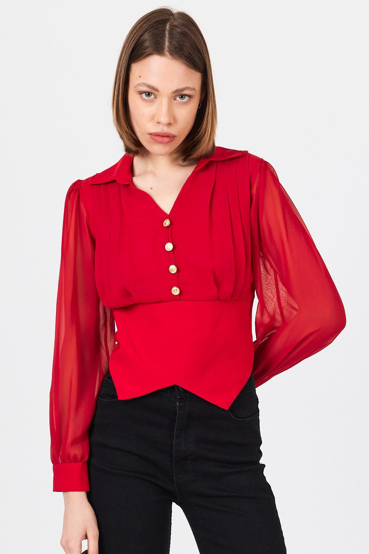 Kırmızı Pileli Gömlek Yaka Düğmeli Bluz 9471