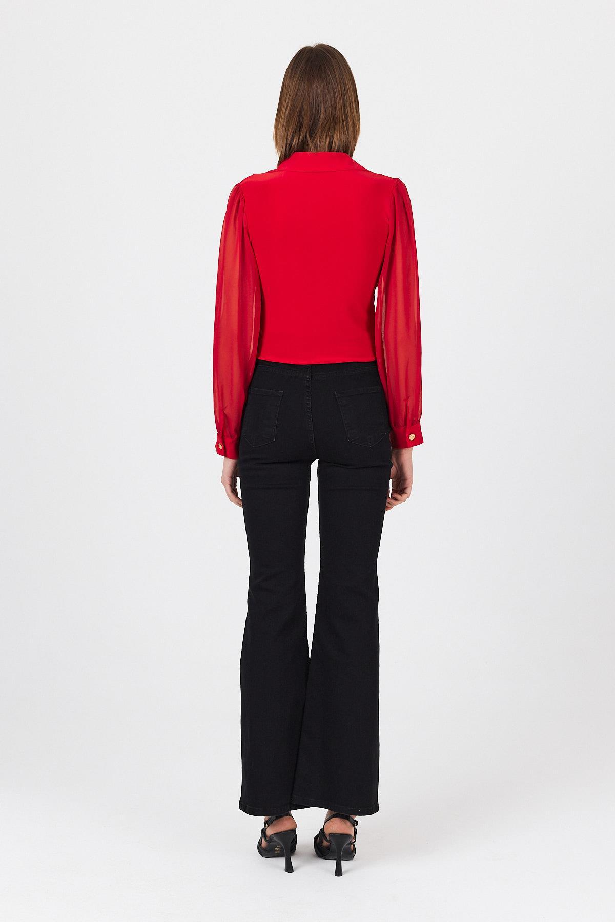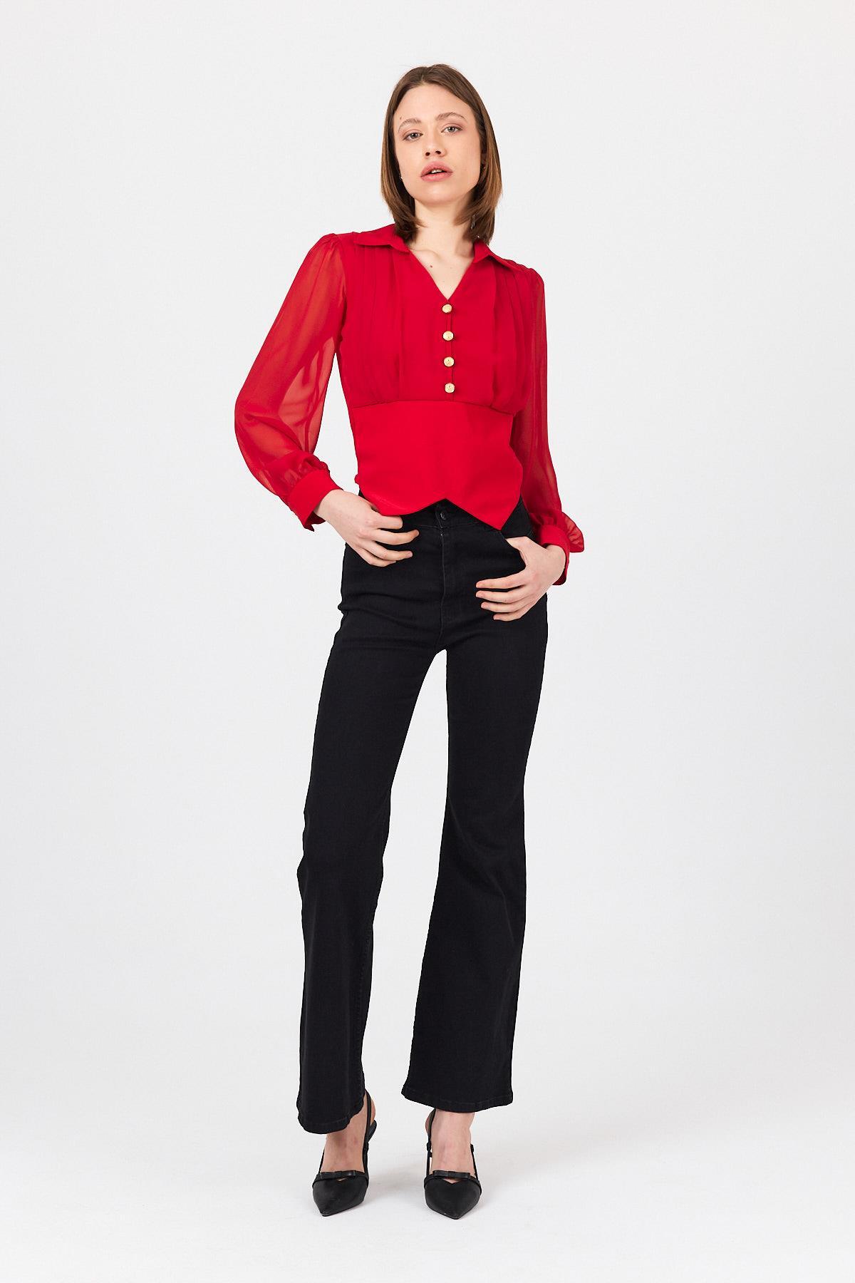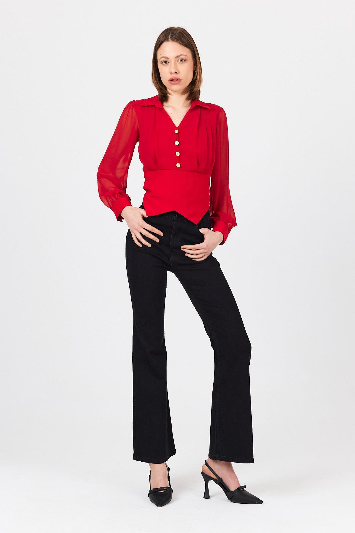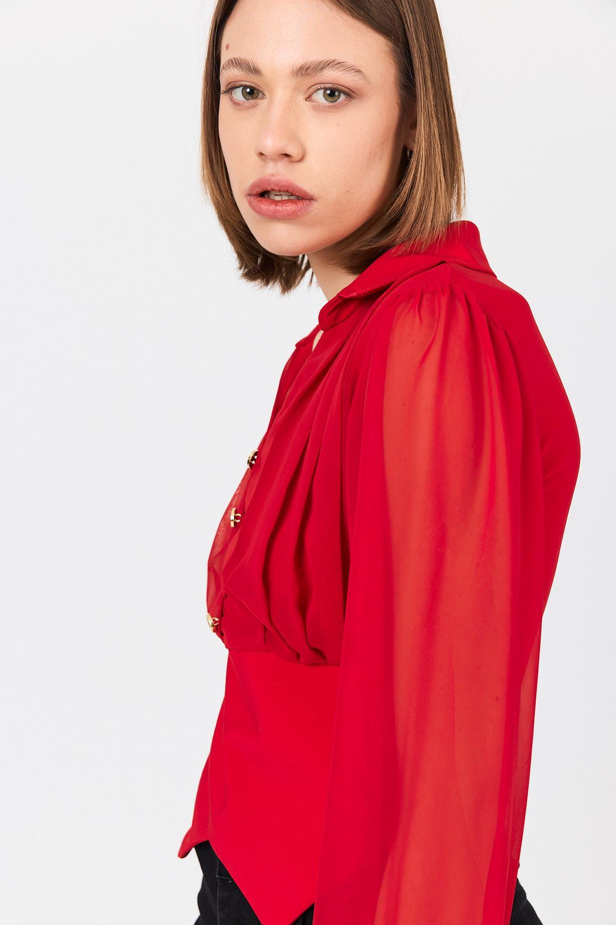 Kırmızı Pileli Gömlek Yaka Düğmeli Bluz 9471