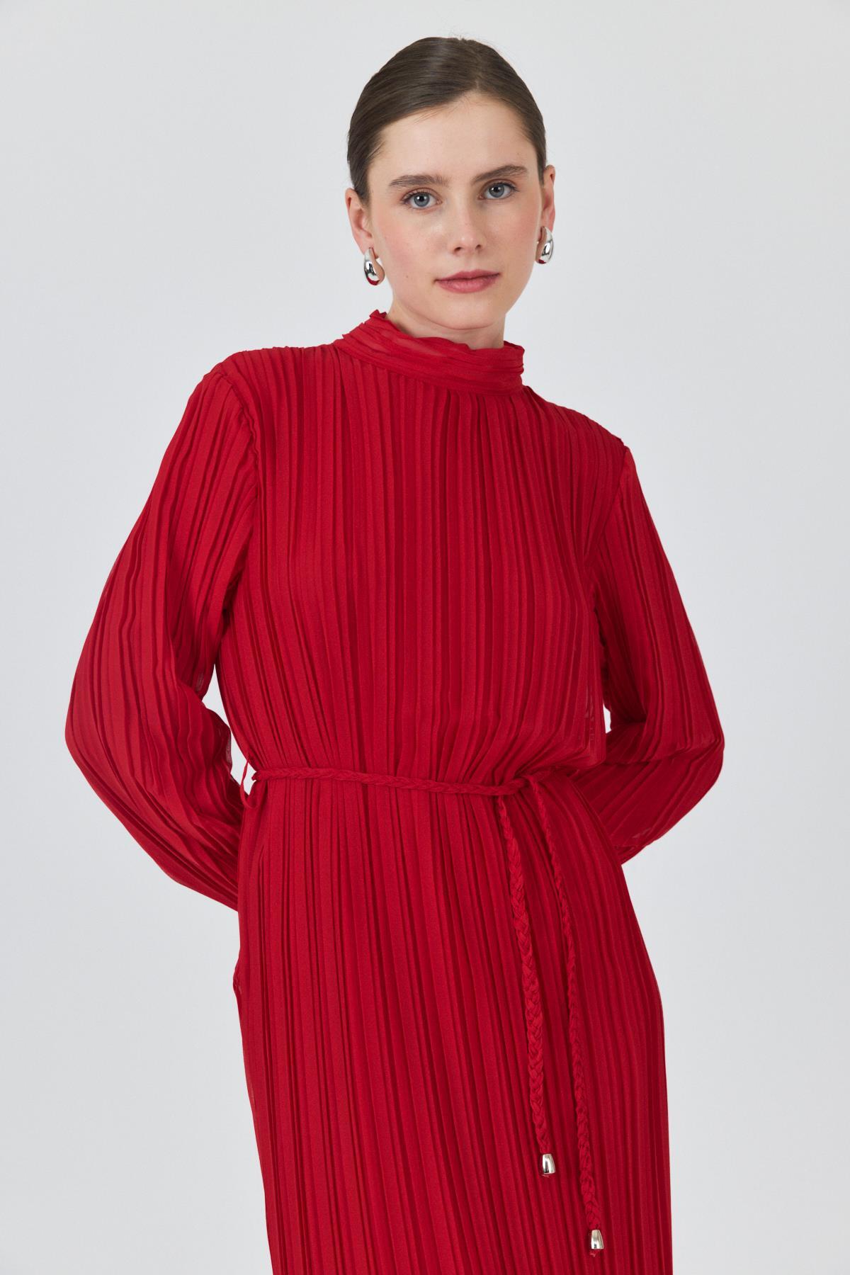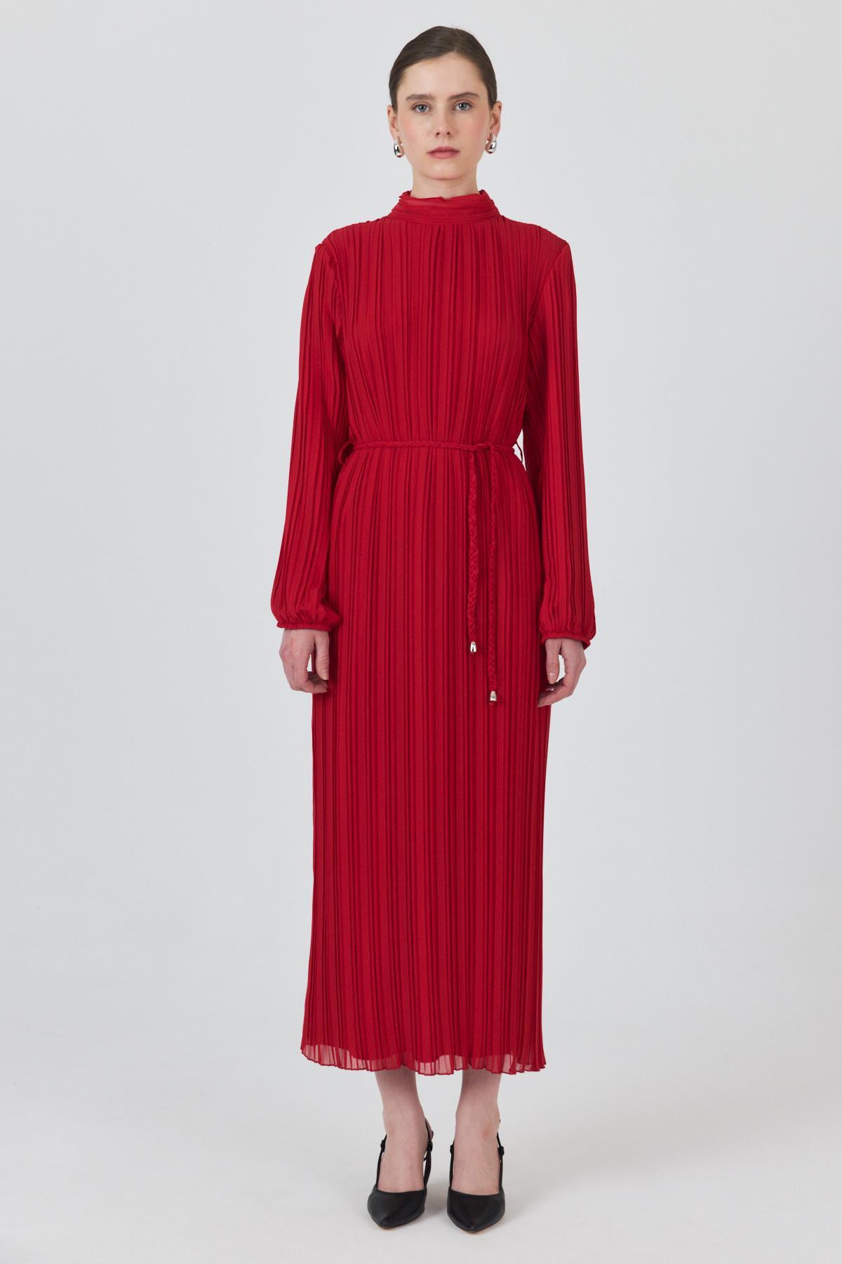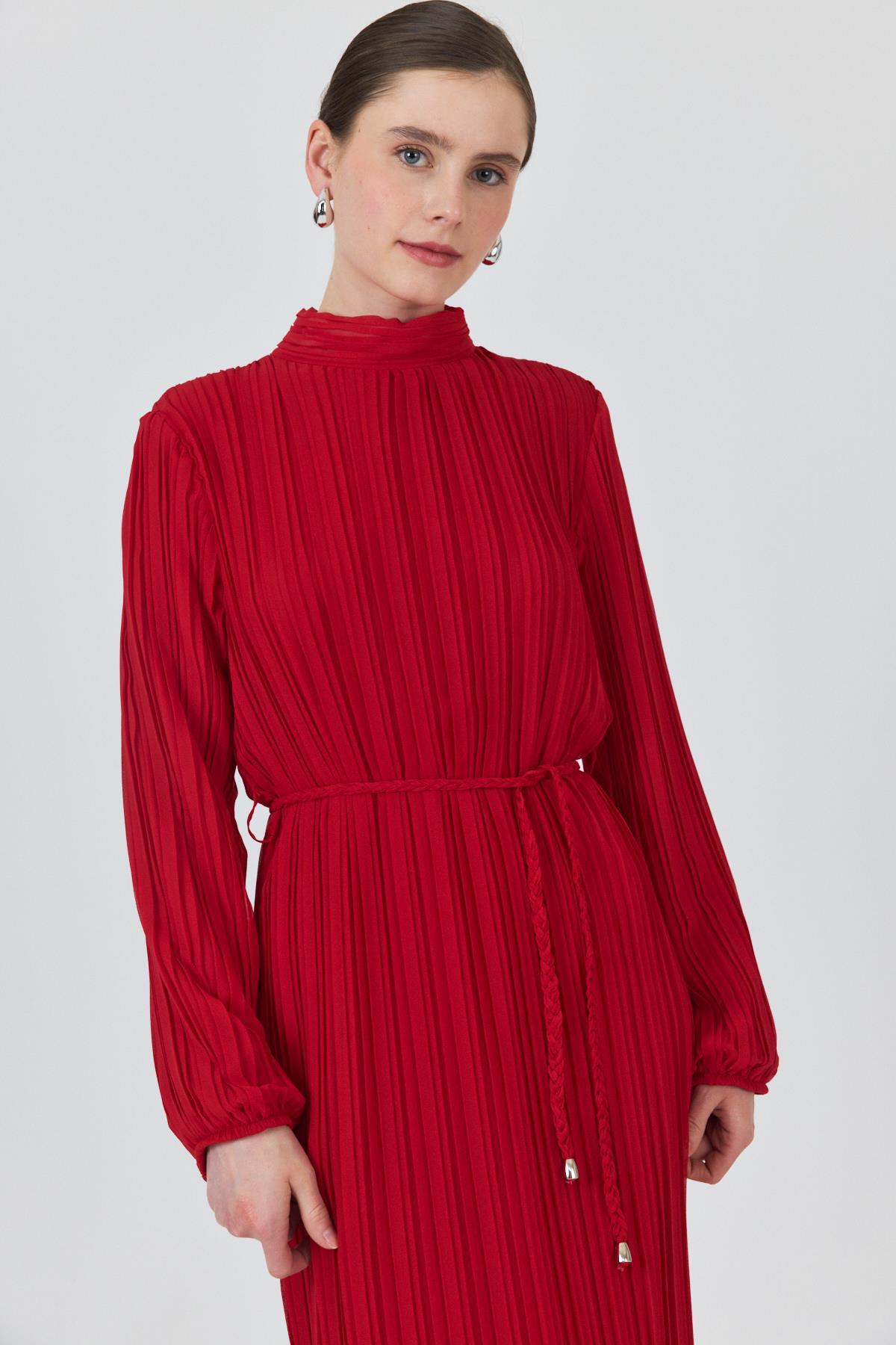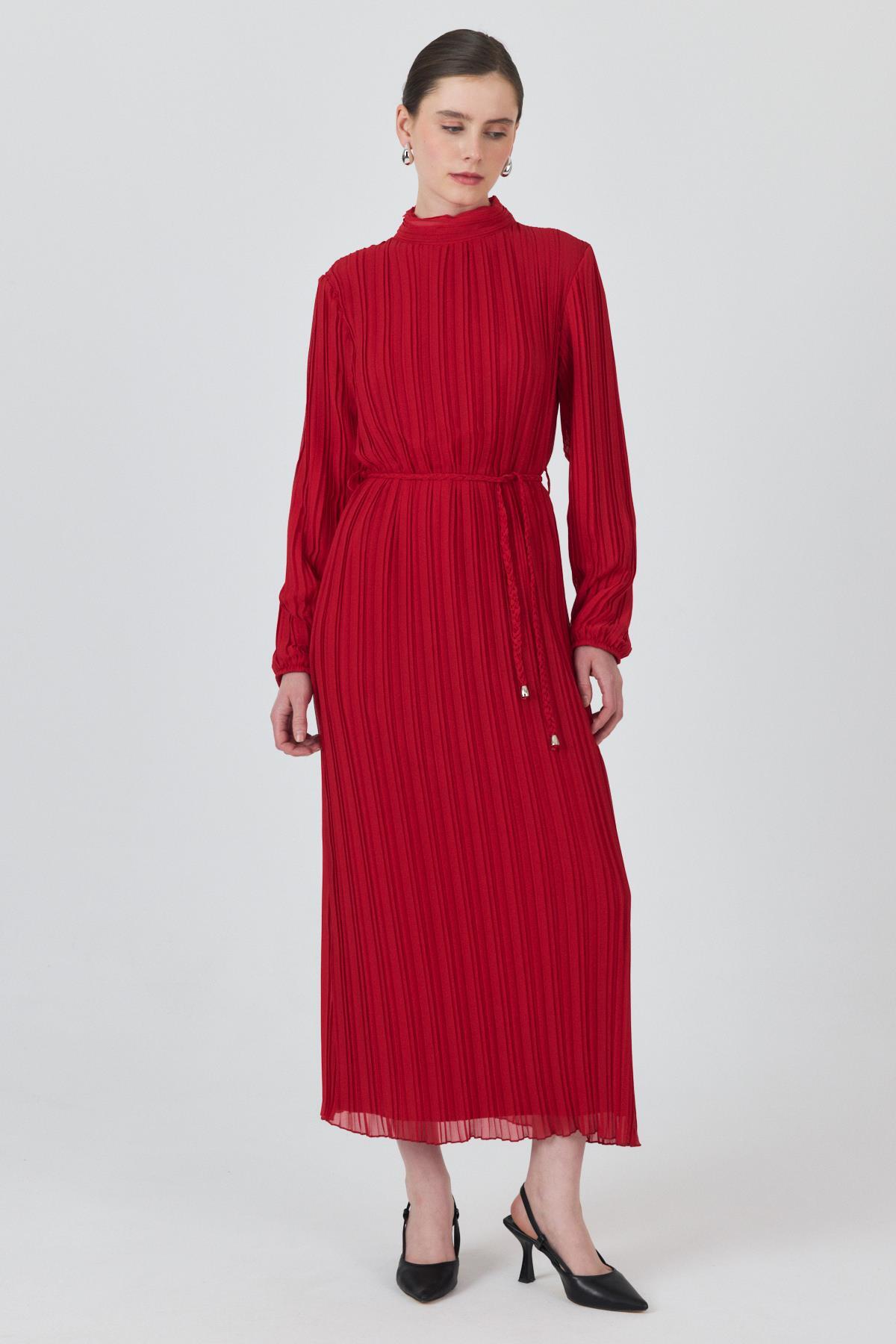 Kırmızı Pileli Uzun Kollu Kemer Detaylı Midi Boy Elbise 020