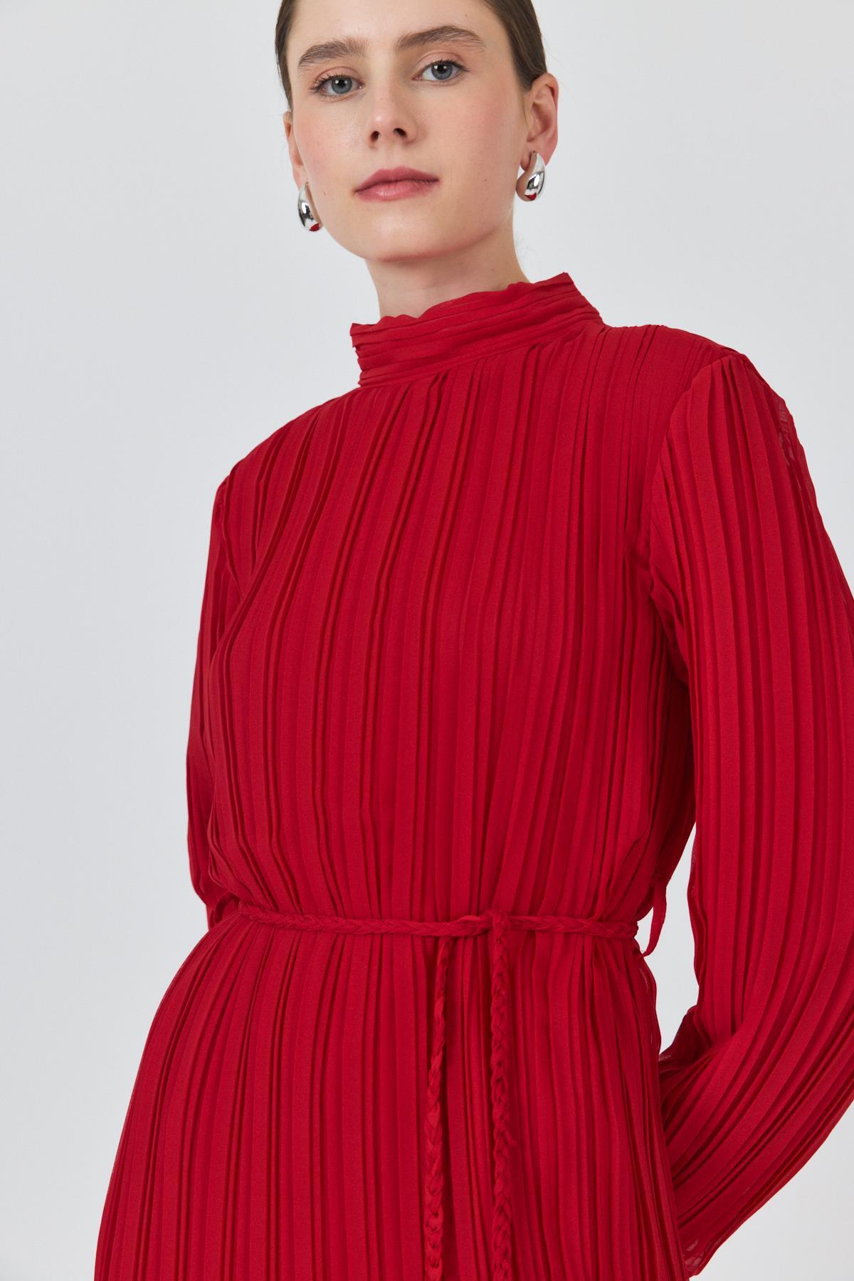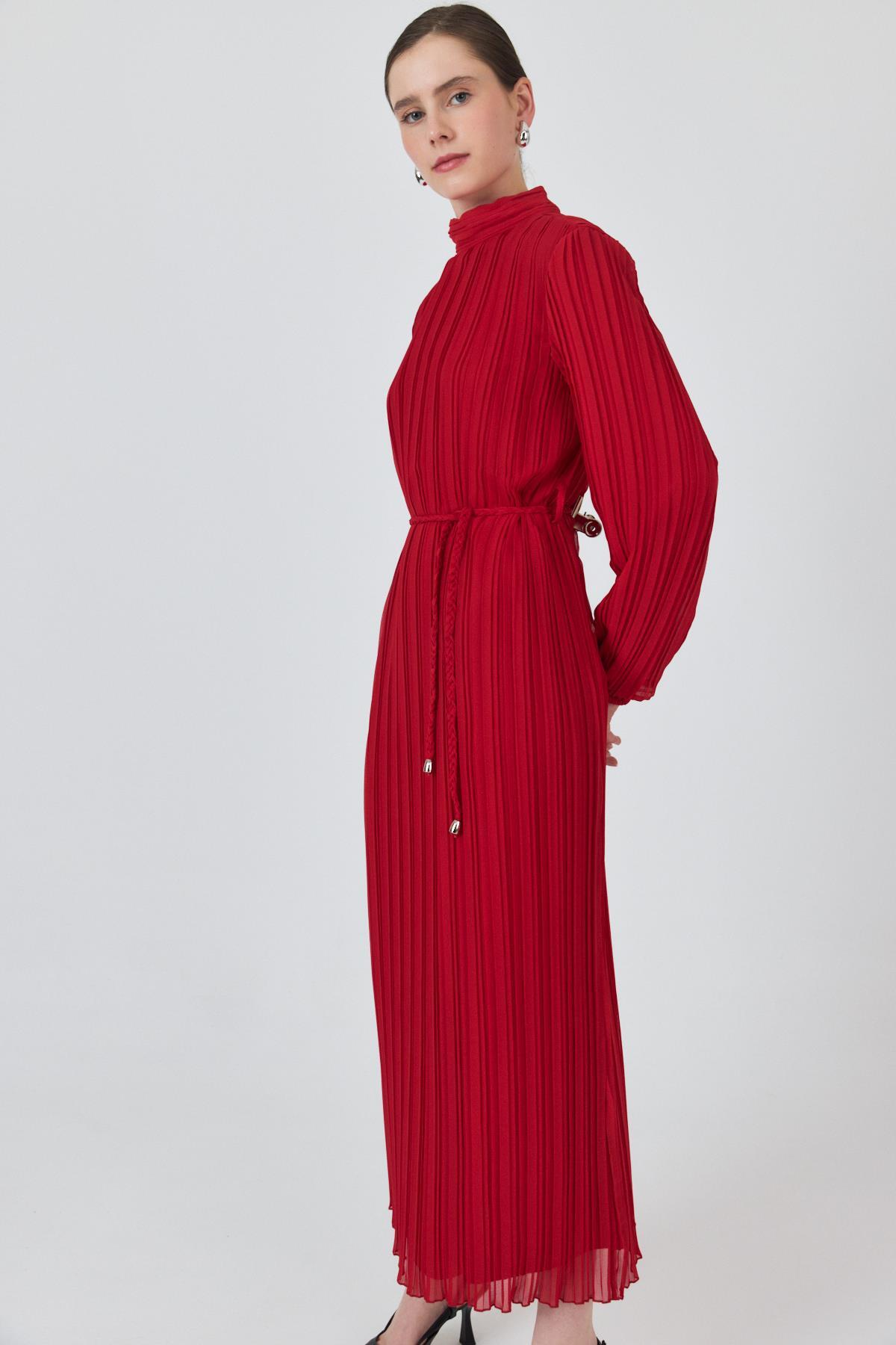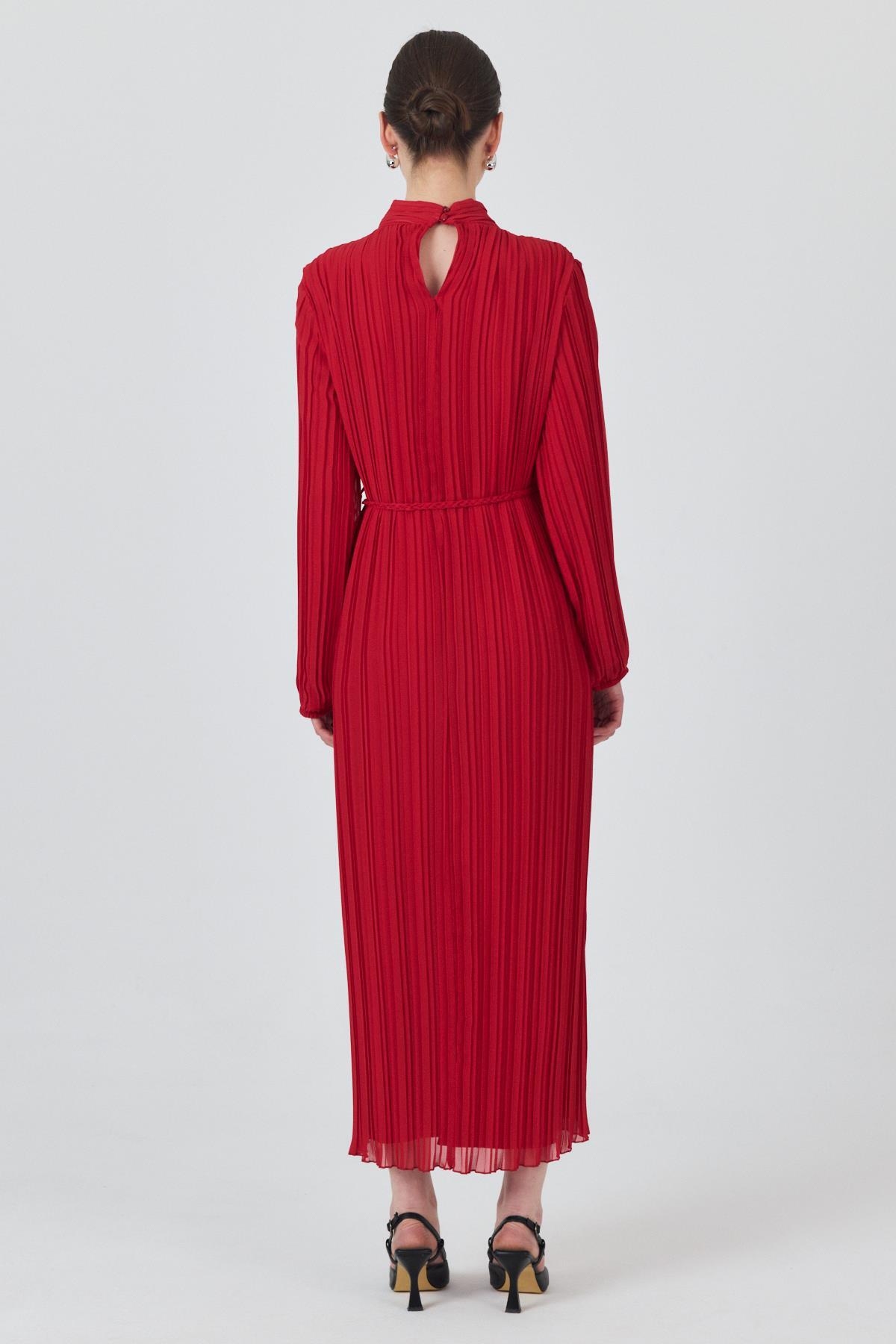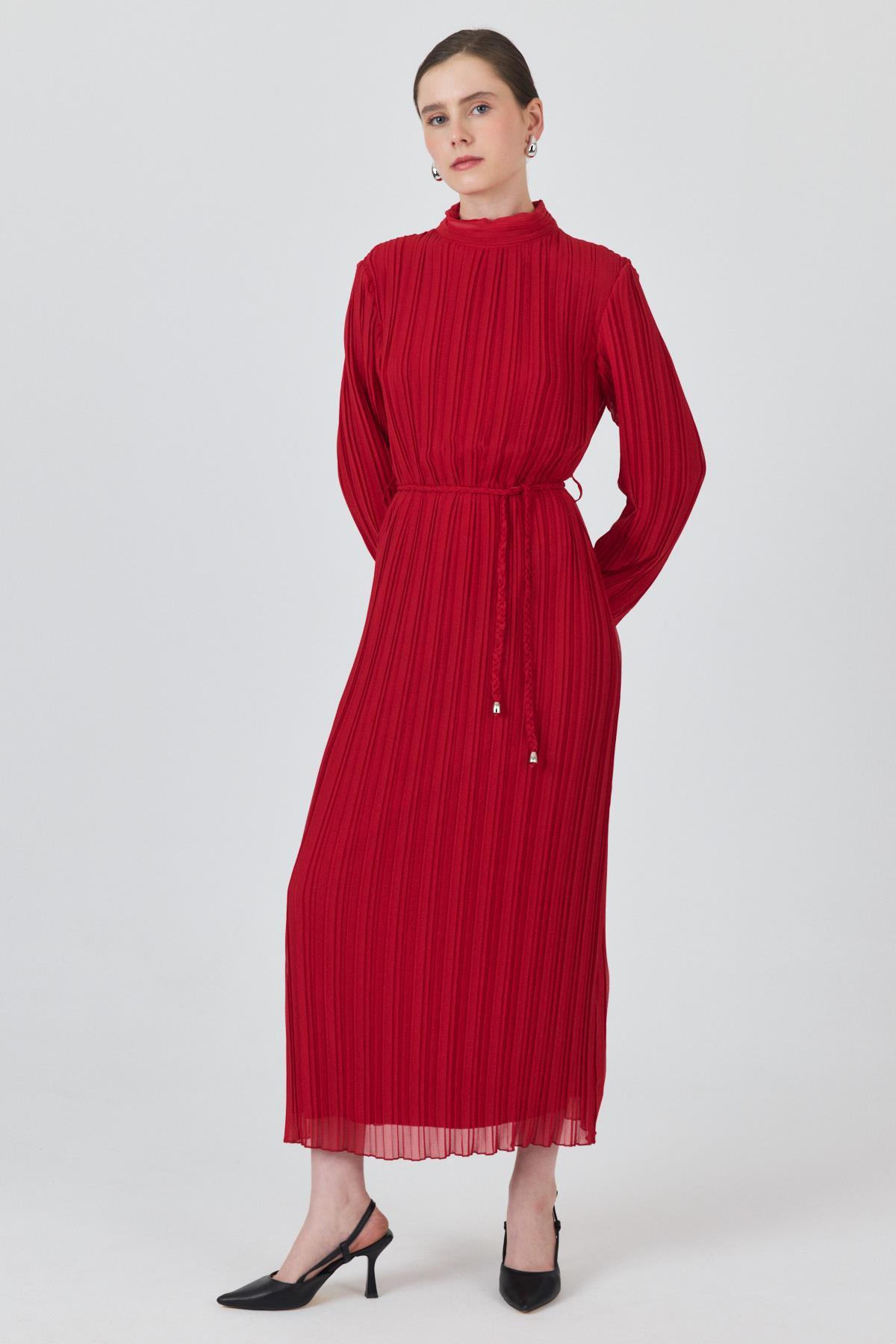 Kırmızı Pileli Uzun Kollu Kemer Detaylı Midi Boy Elbise 020