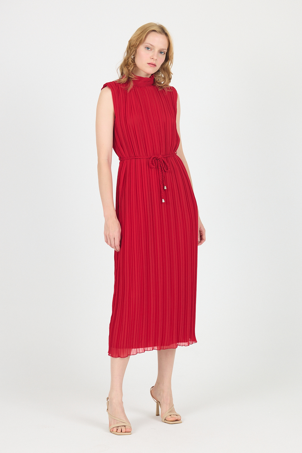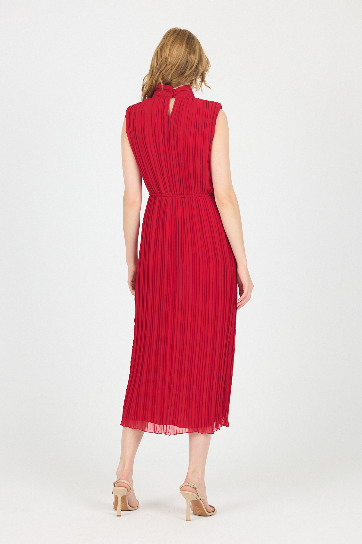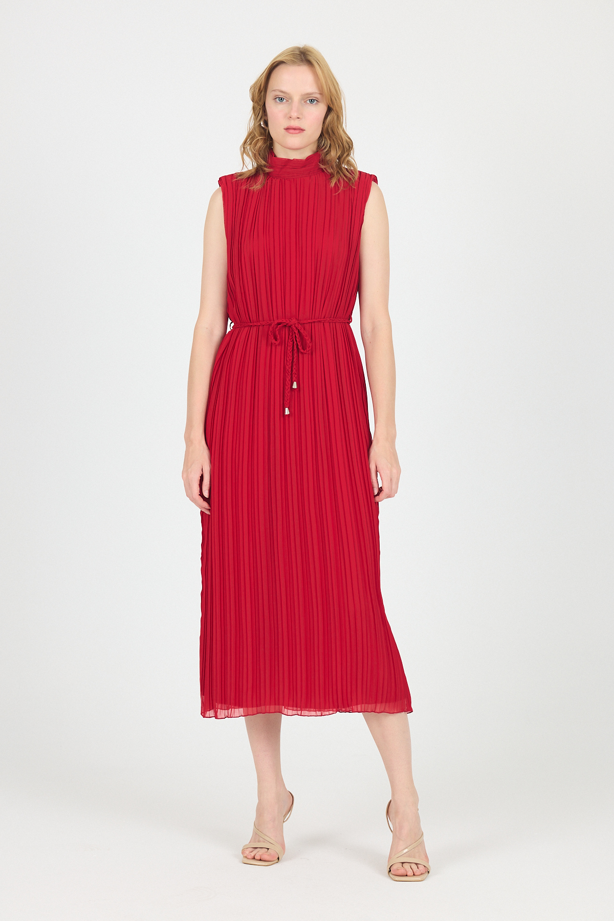Kırmızı Şifon Kolsuz Pileli Bel Bağlamalı Midi Elbise 118