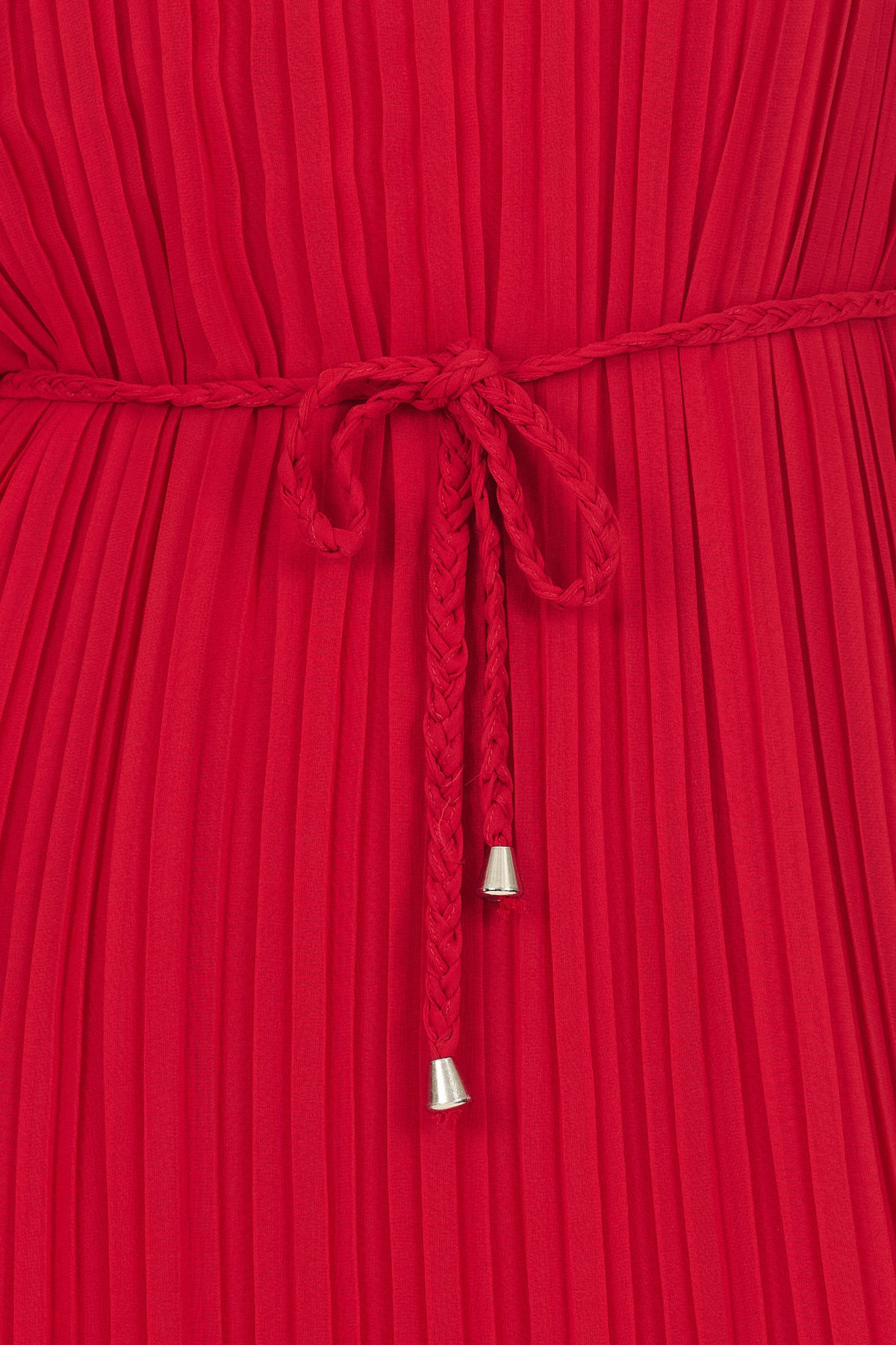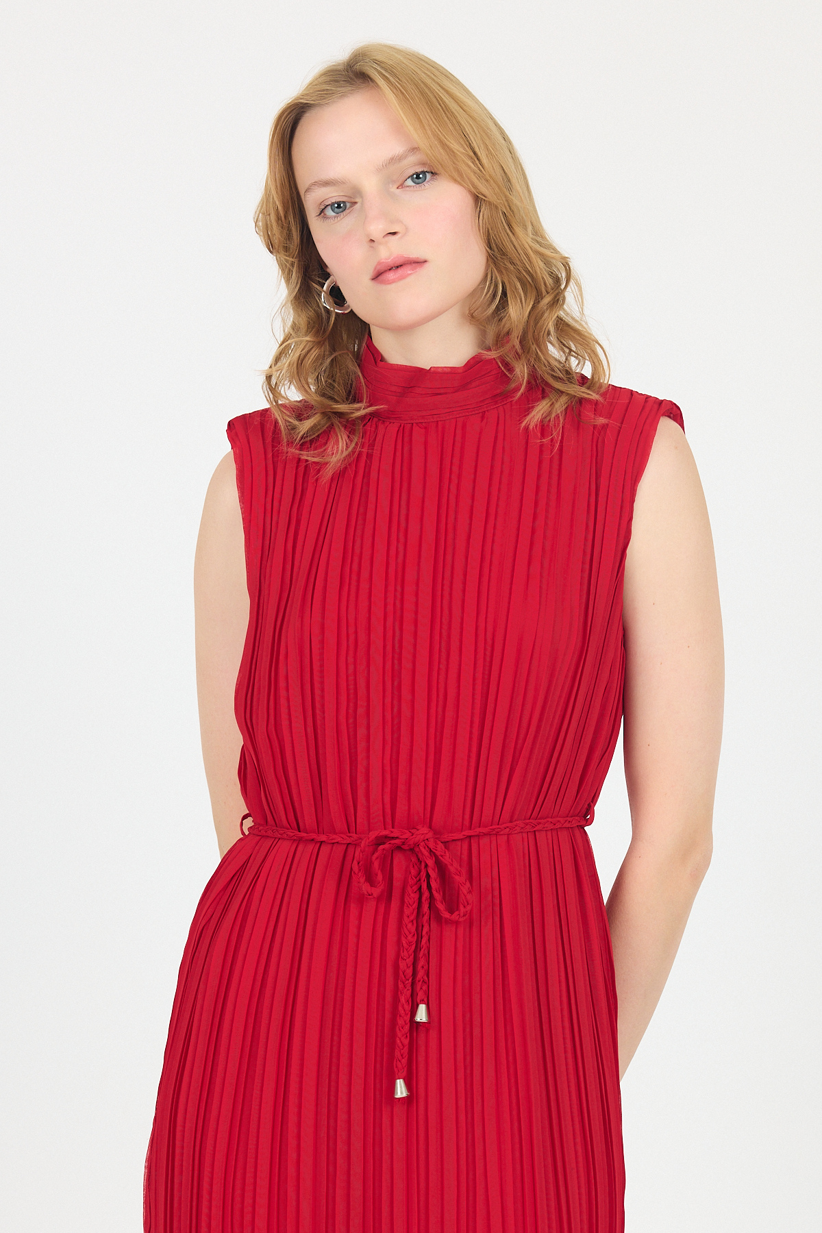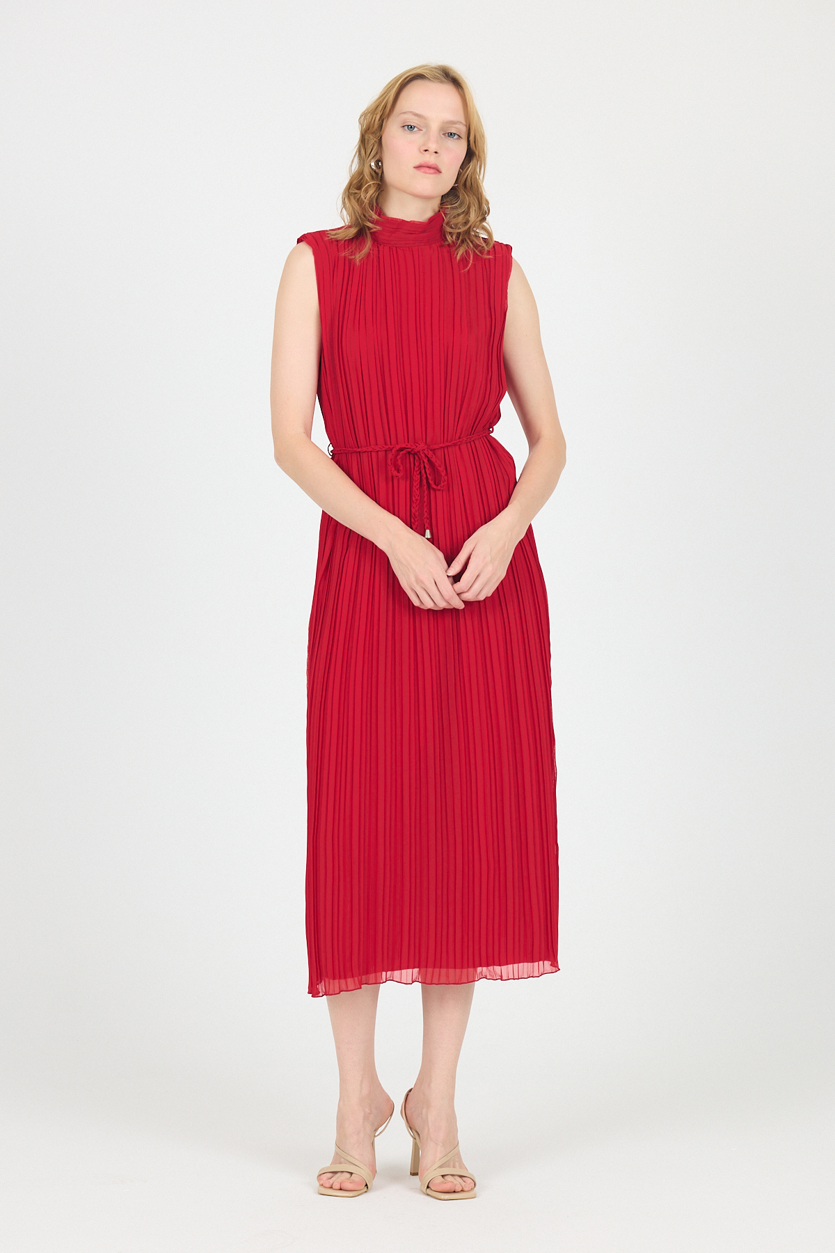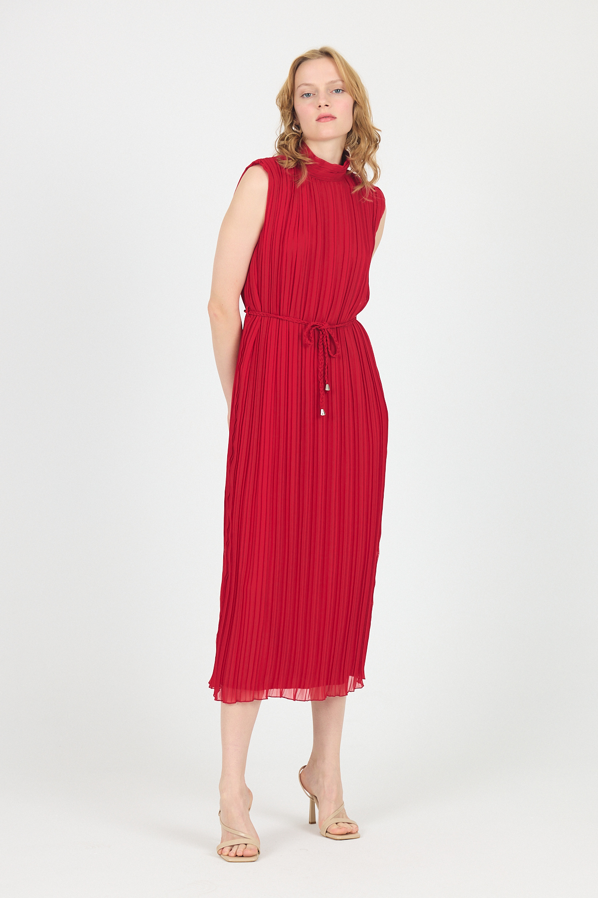 Kırmızı Şifon Kolsuz Pileli Bel Bağlamalı Midi Elbise 118
