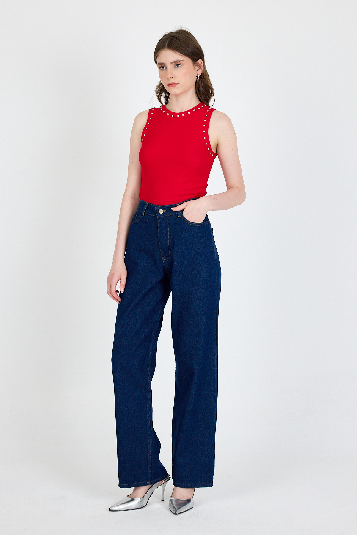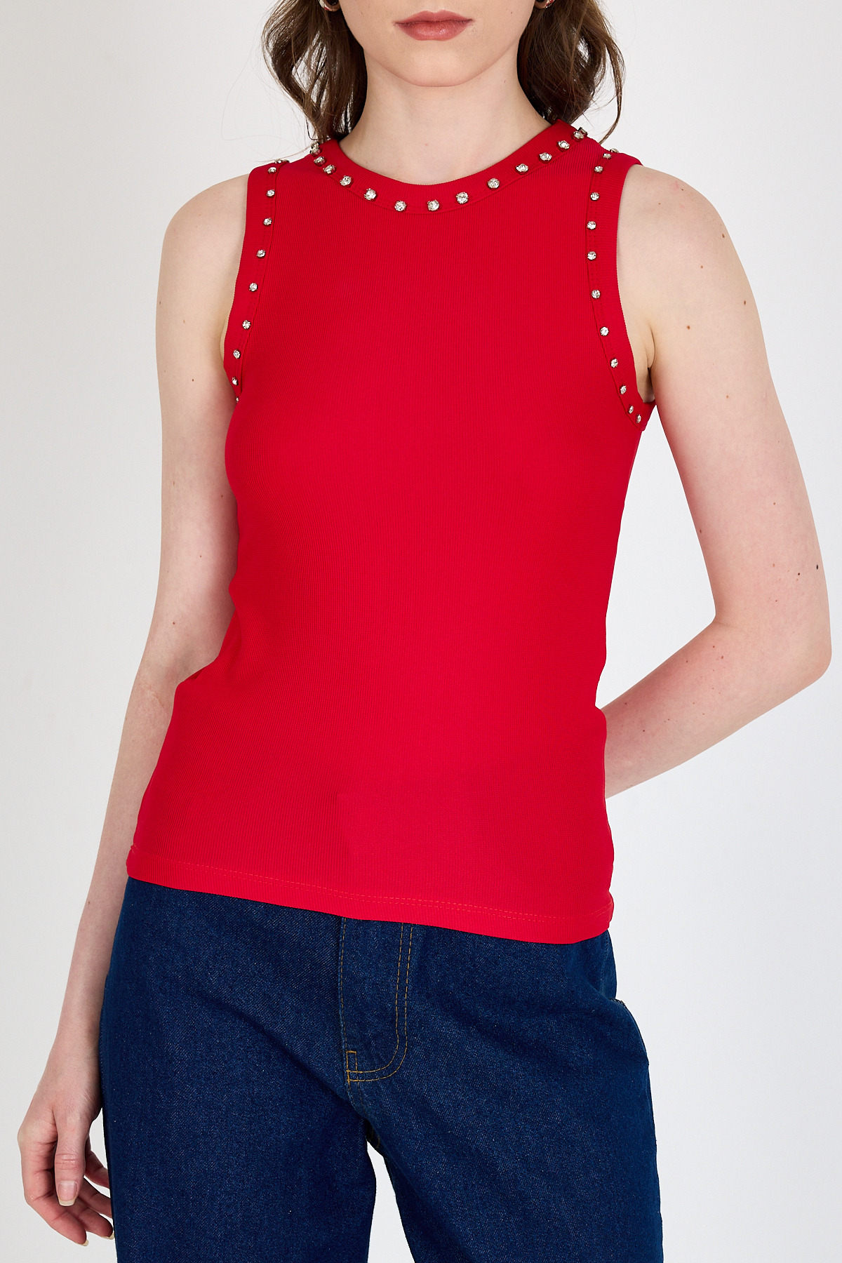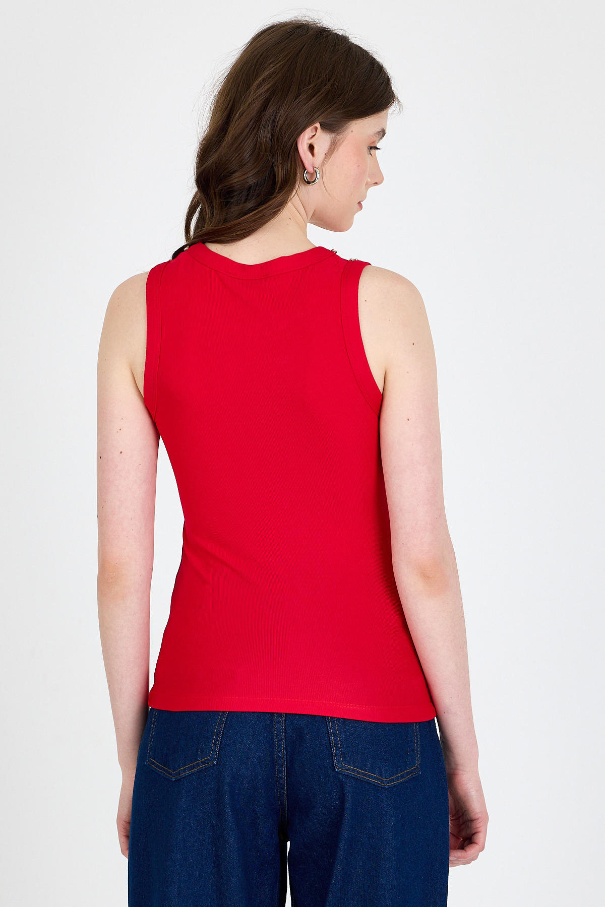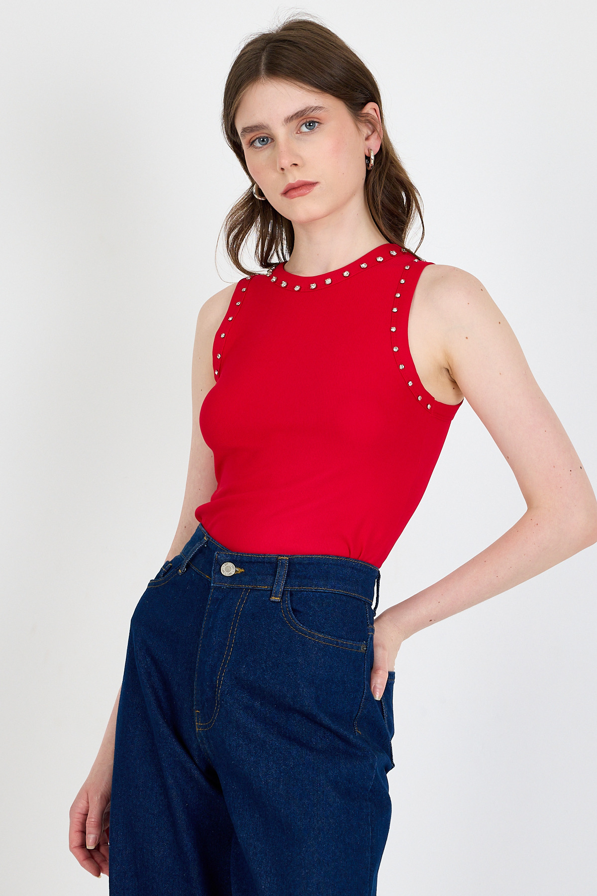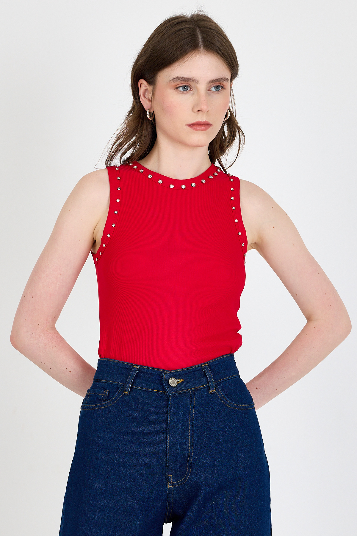 Kırmızı Yaka Ve Omuz Taş Detaylı Ribanalı Örme Atlet 1249