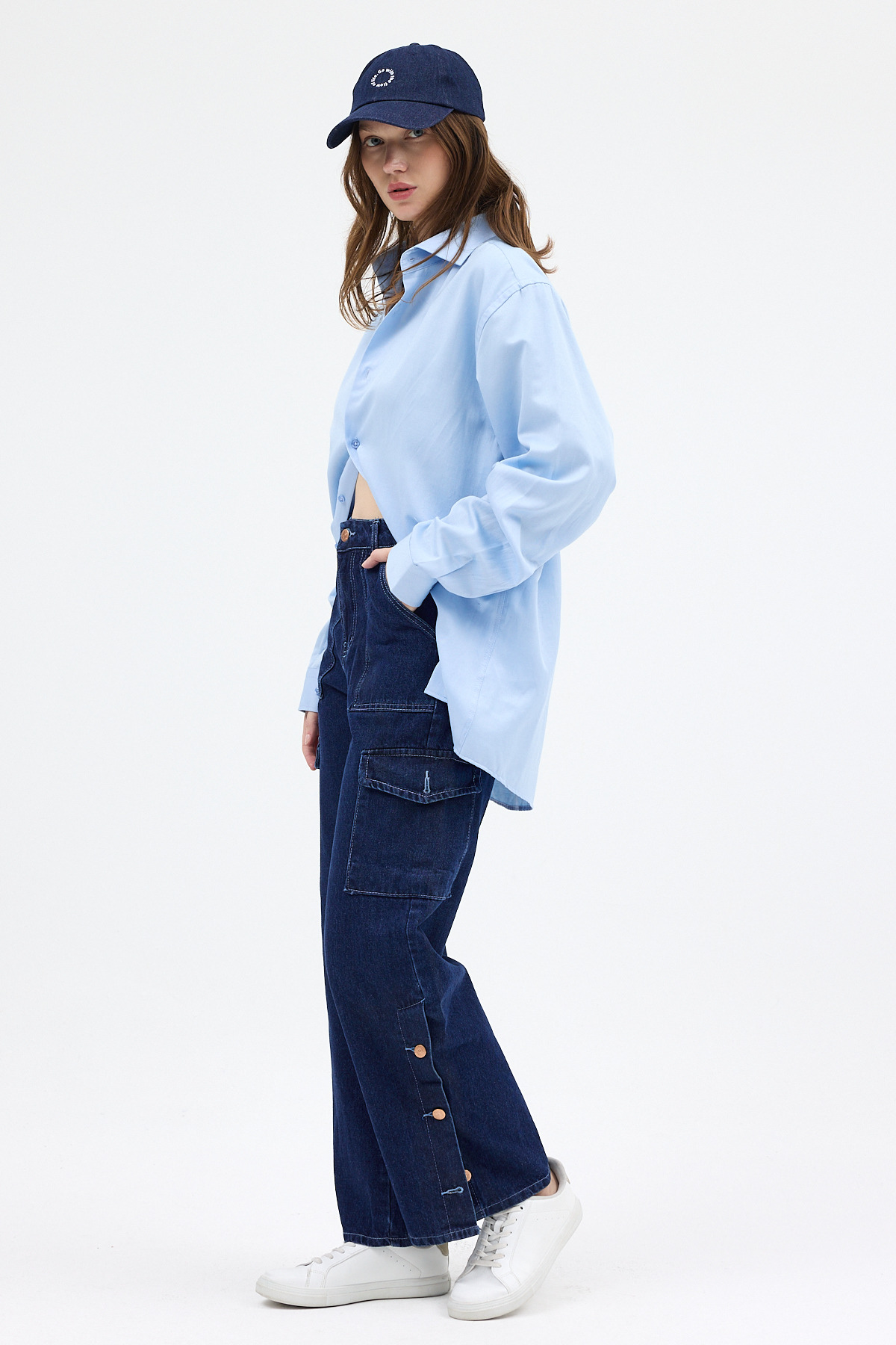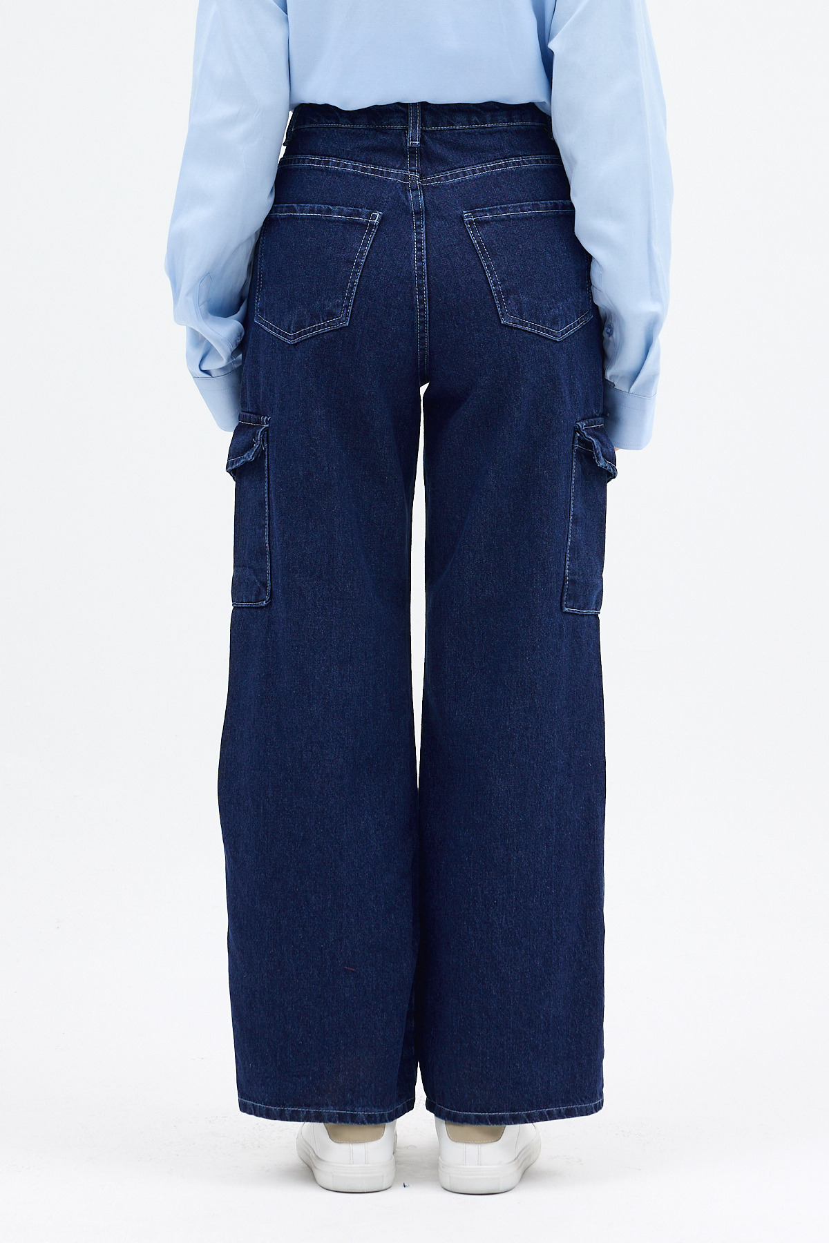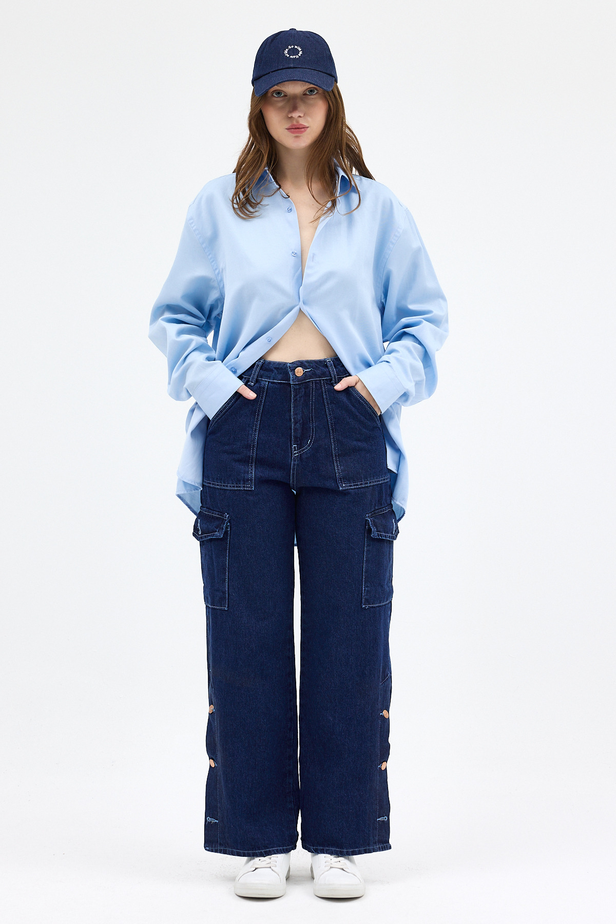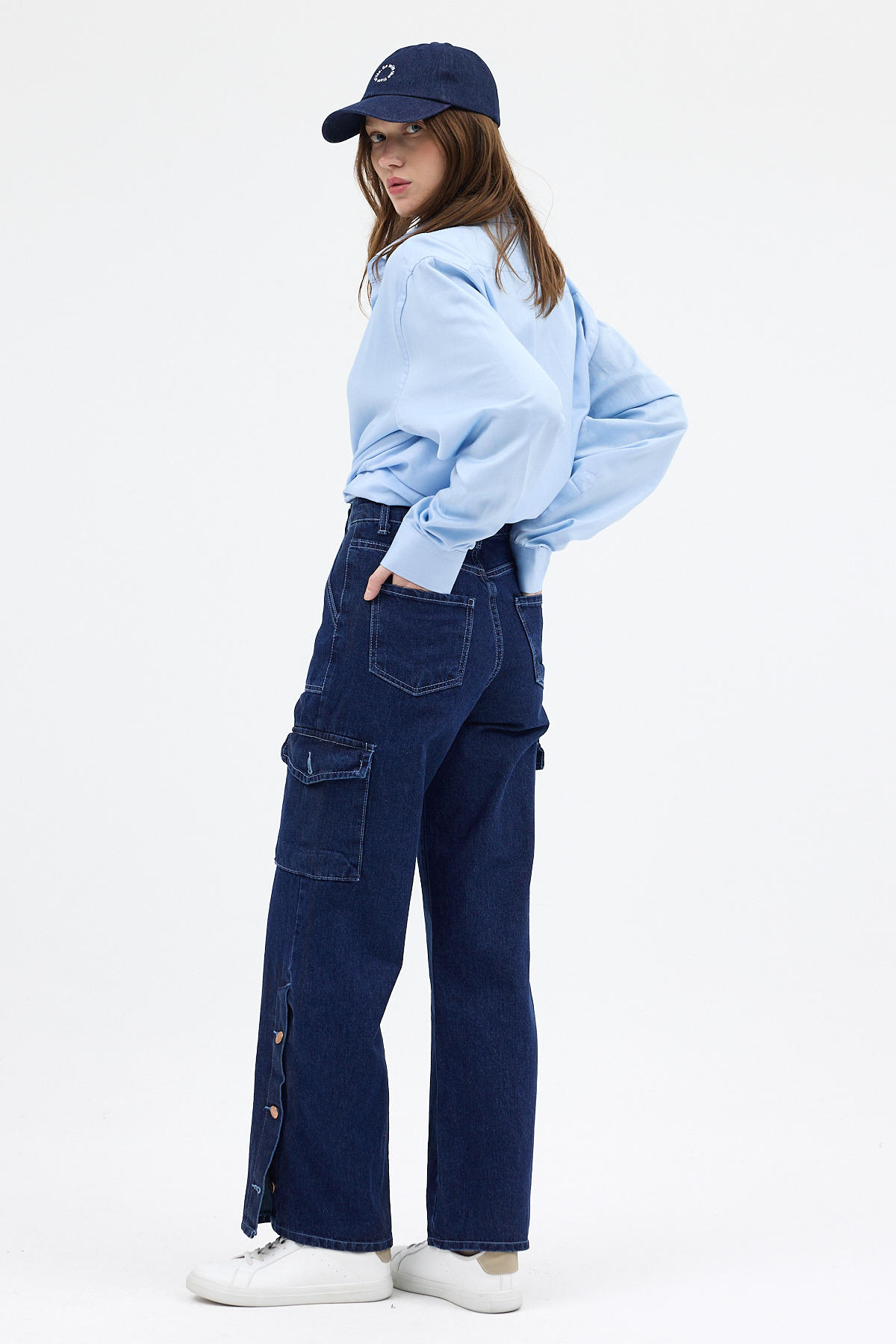 Koyu Mavi Kadın Paça Düğmeli Yüksek Bel Jean Kargo Pantolon 1055