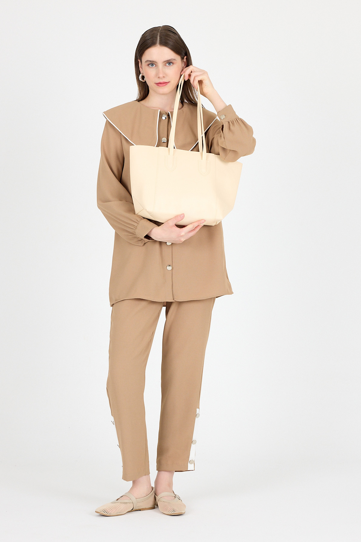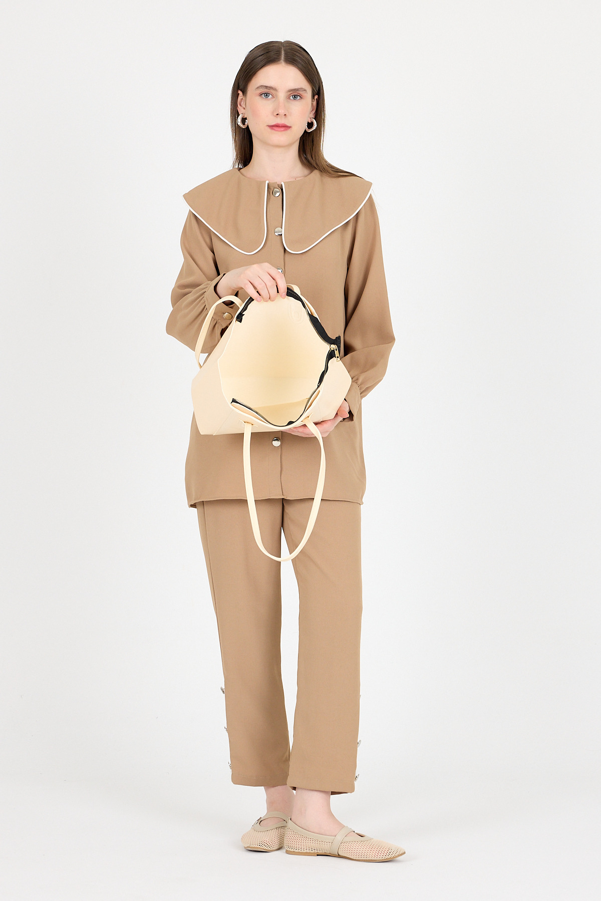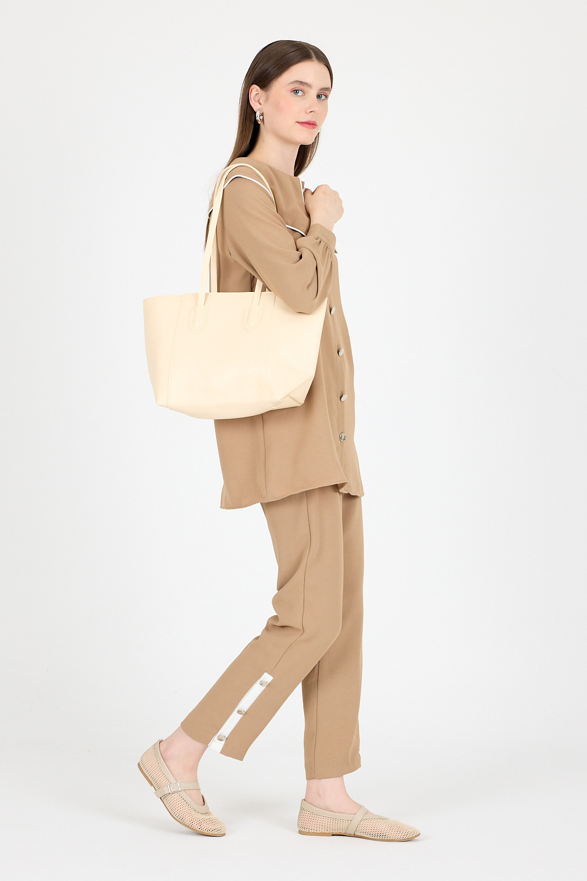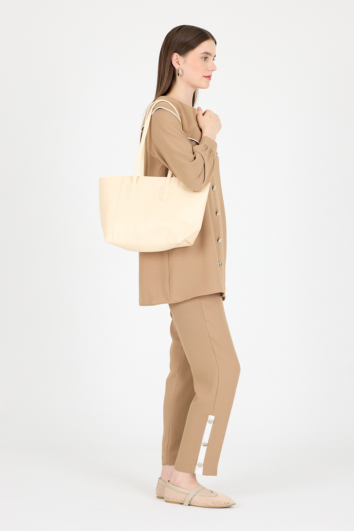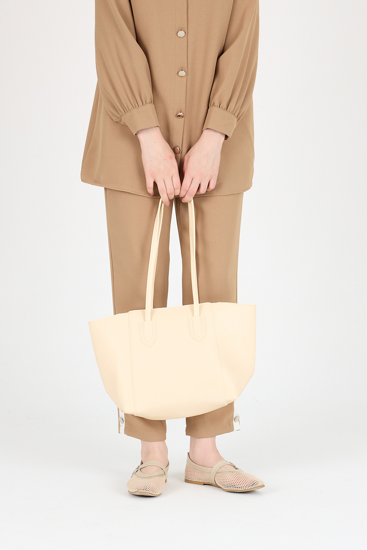 Krem Dikiş Detaylı Omuz Çantası 9212