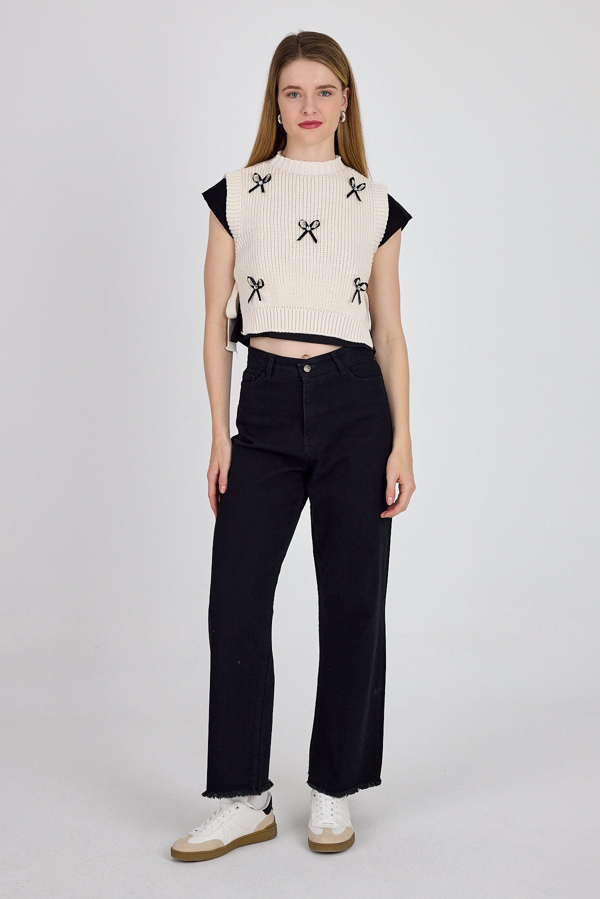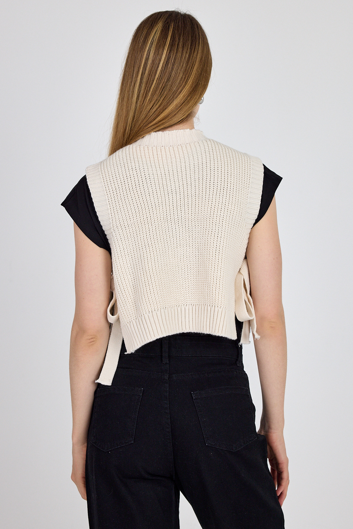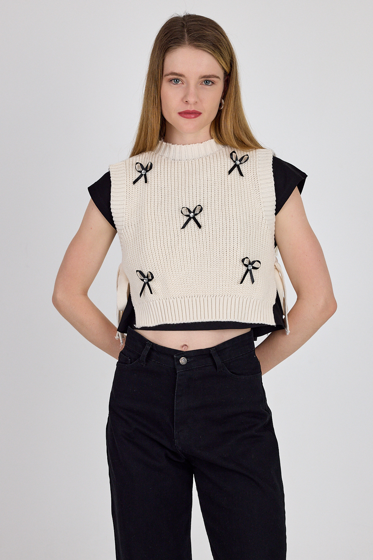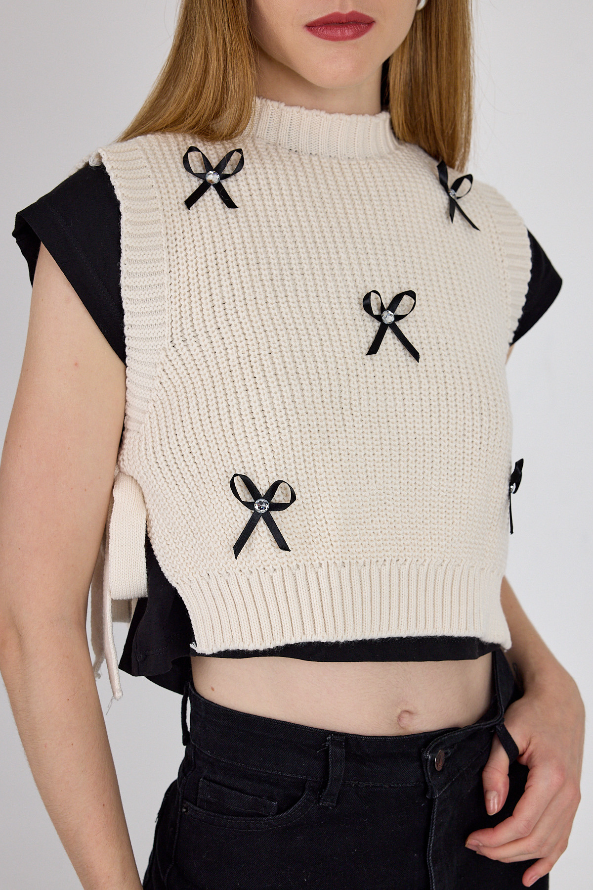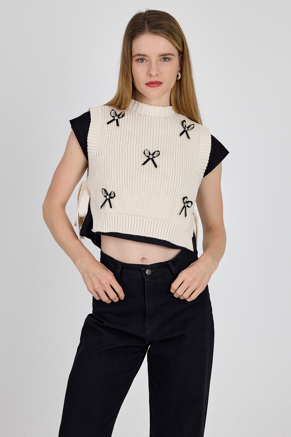 Krem Kurdela Detaylı Yandan Bağlamalı Triko Süveter 2101