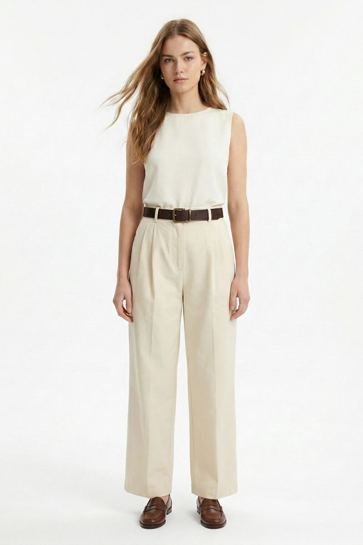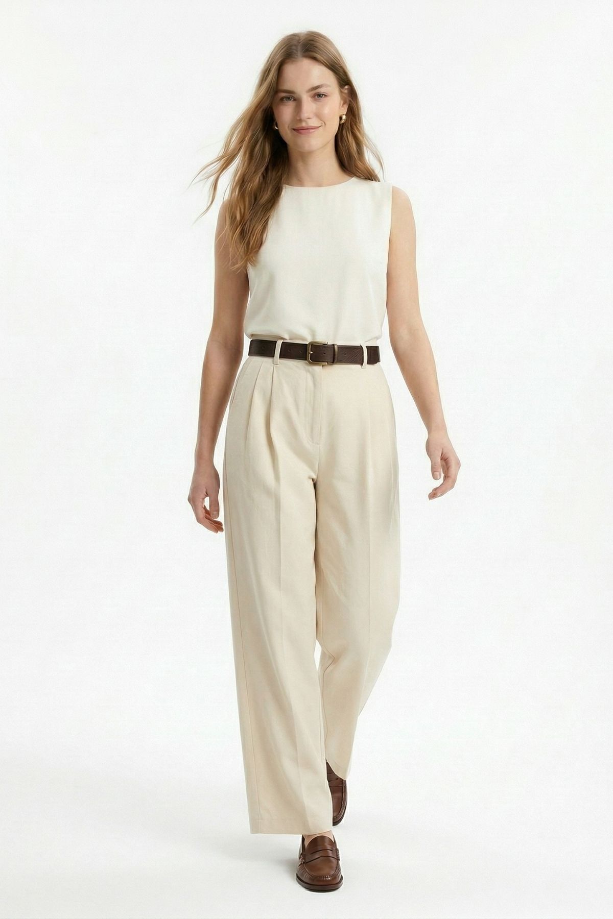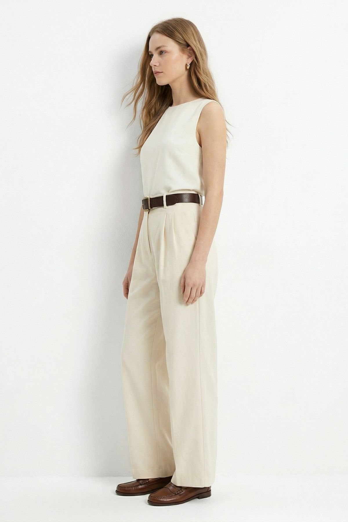 Krem Yüksek Bel Kemerli Pileli Pantolon 3918