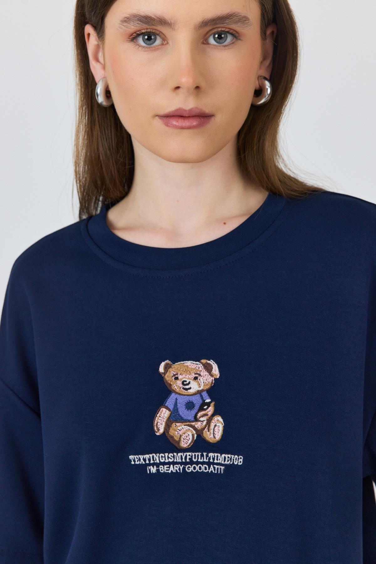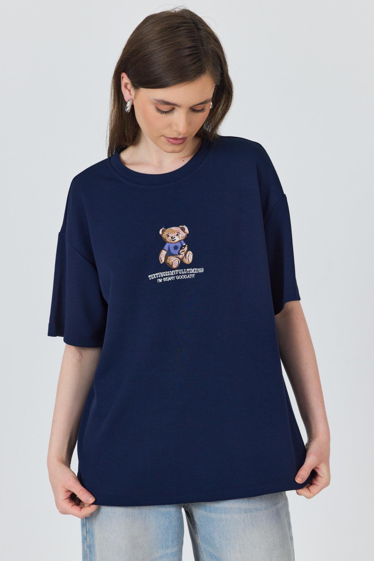 Laci Ayıcık Baskılı Bisiklet Yaka Oversize Tişört 5530