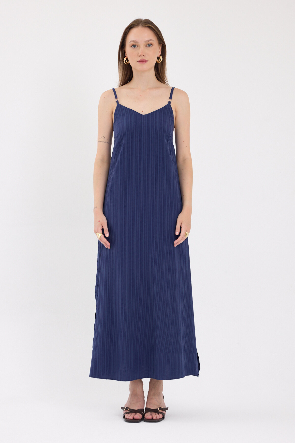 Laci İnce Askılı V Yaka Uzun Elbise 8026A