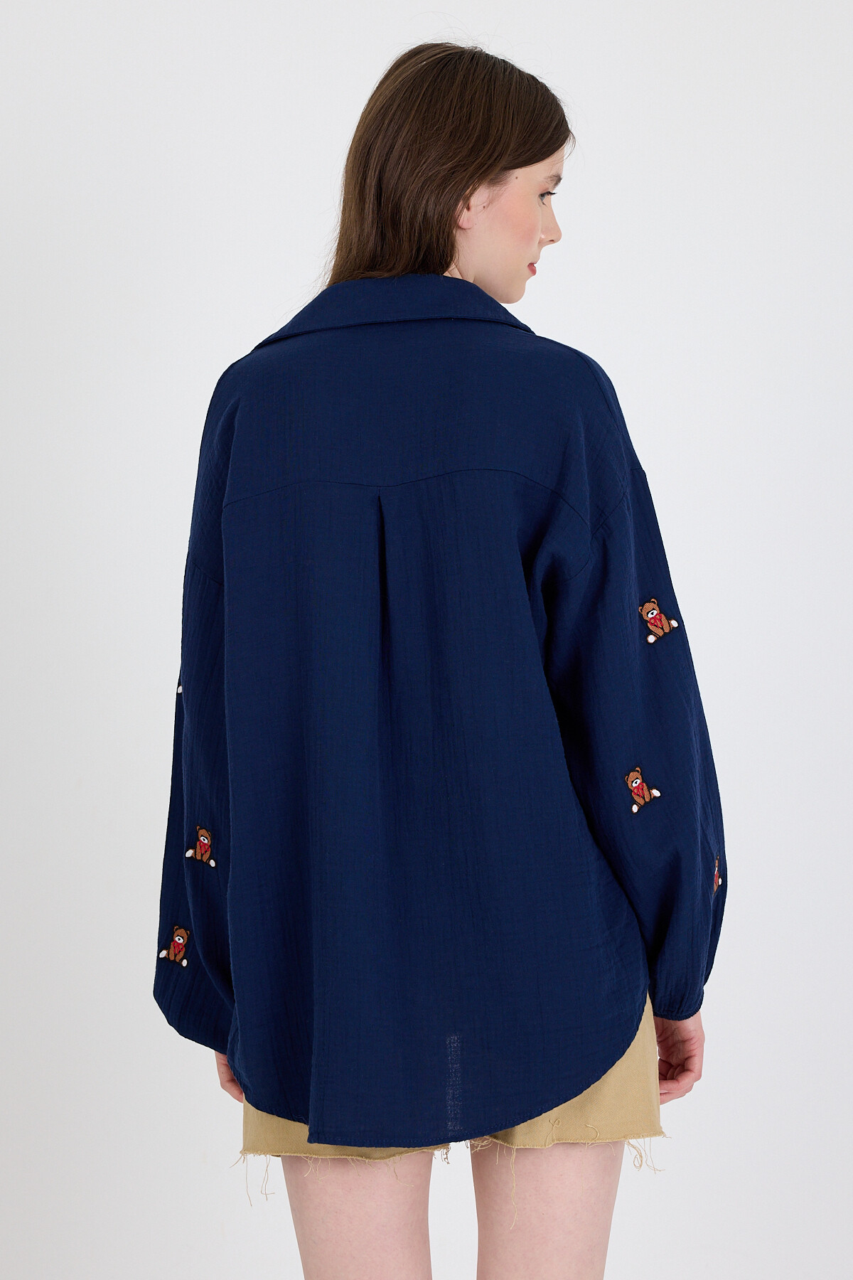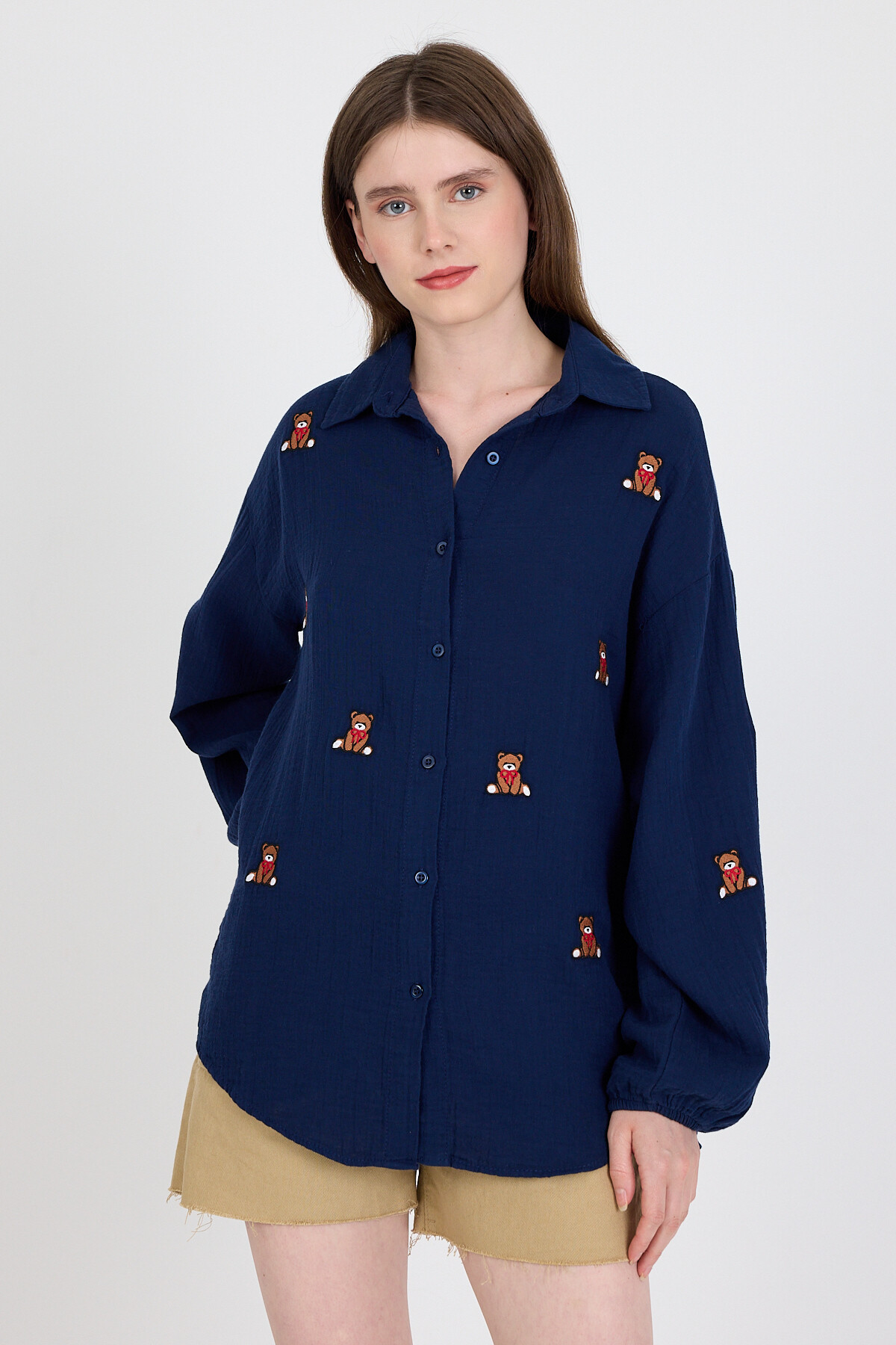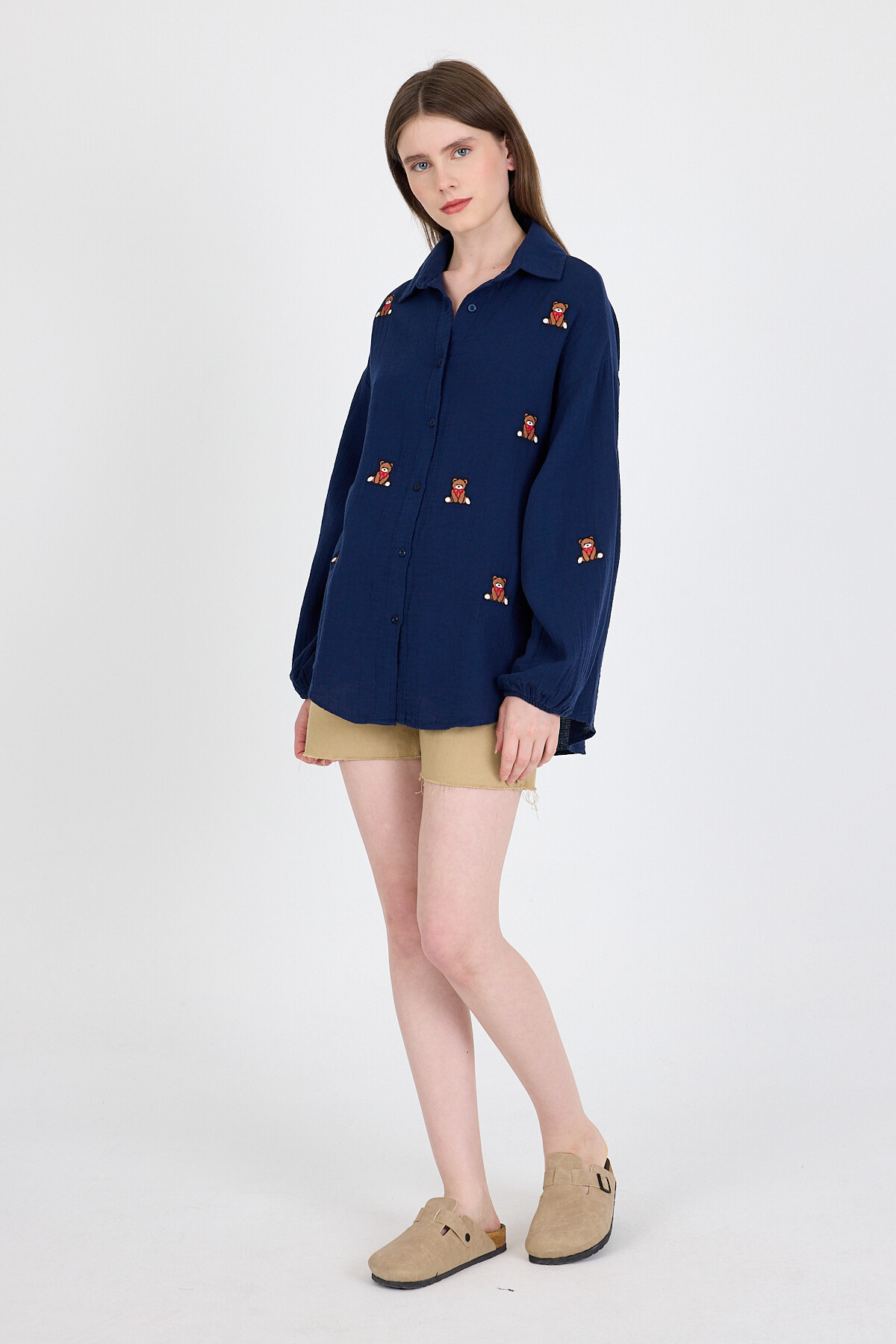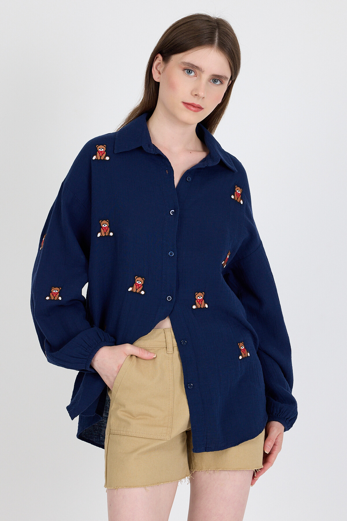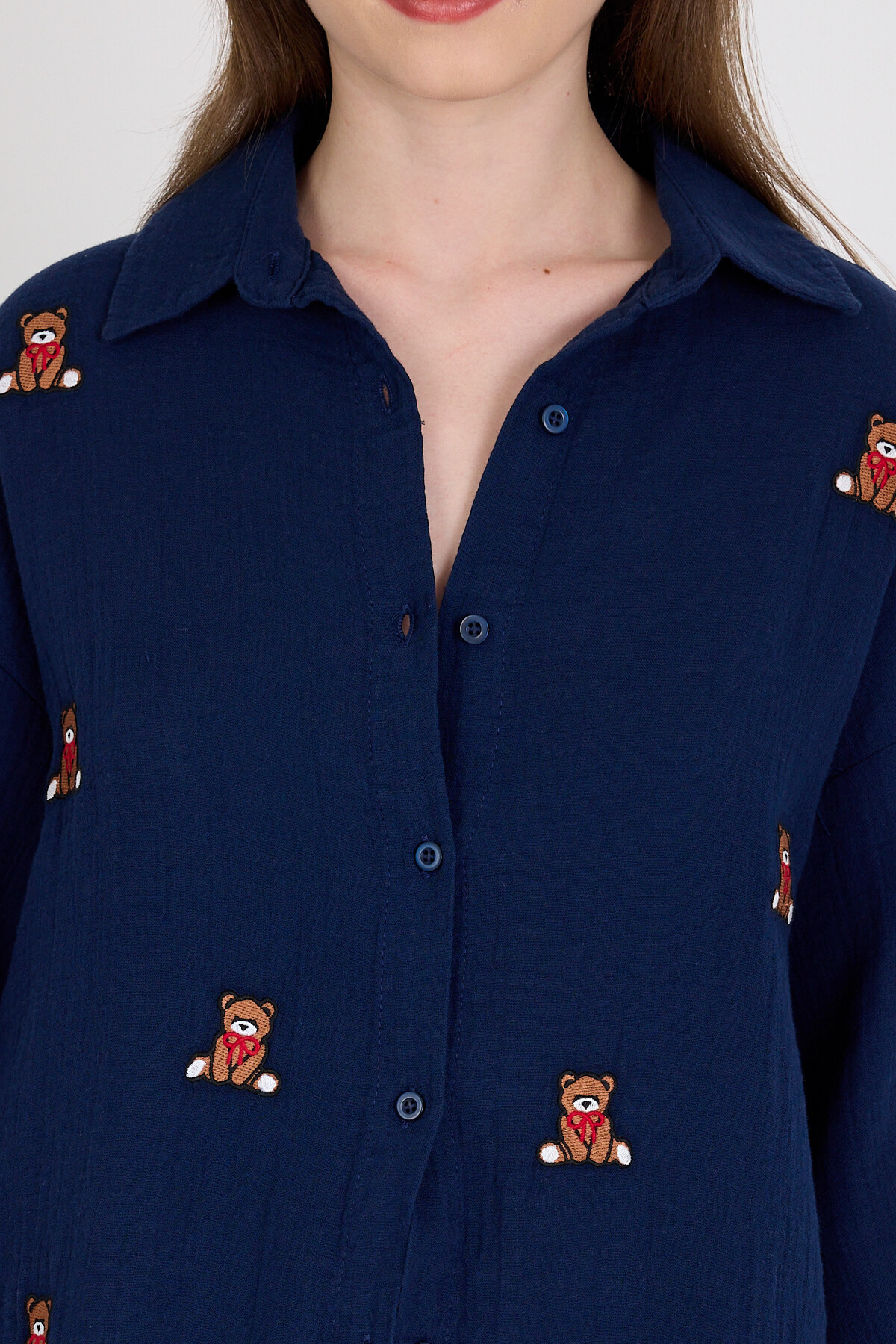 Laci Keten Görünümlü %100 Pamuk Ayıcık Nakışlı Gömlek 4798A