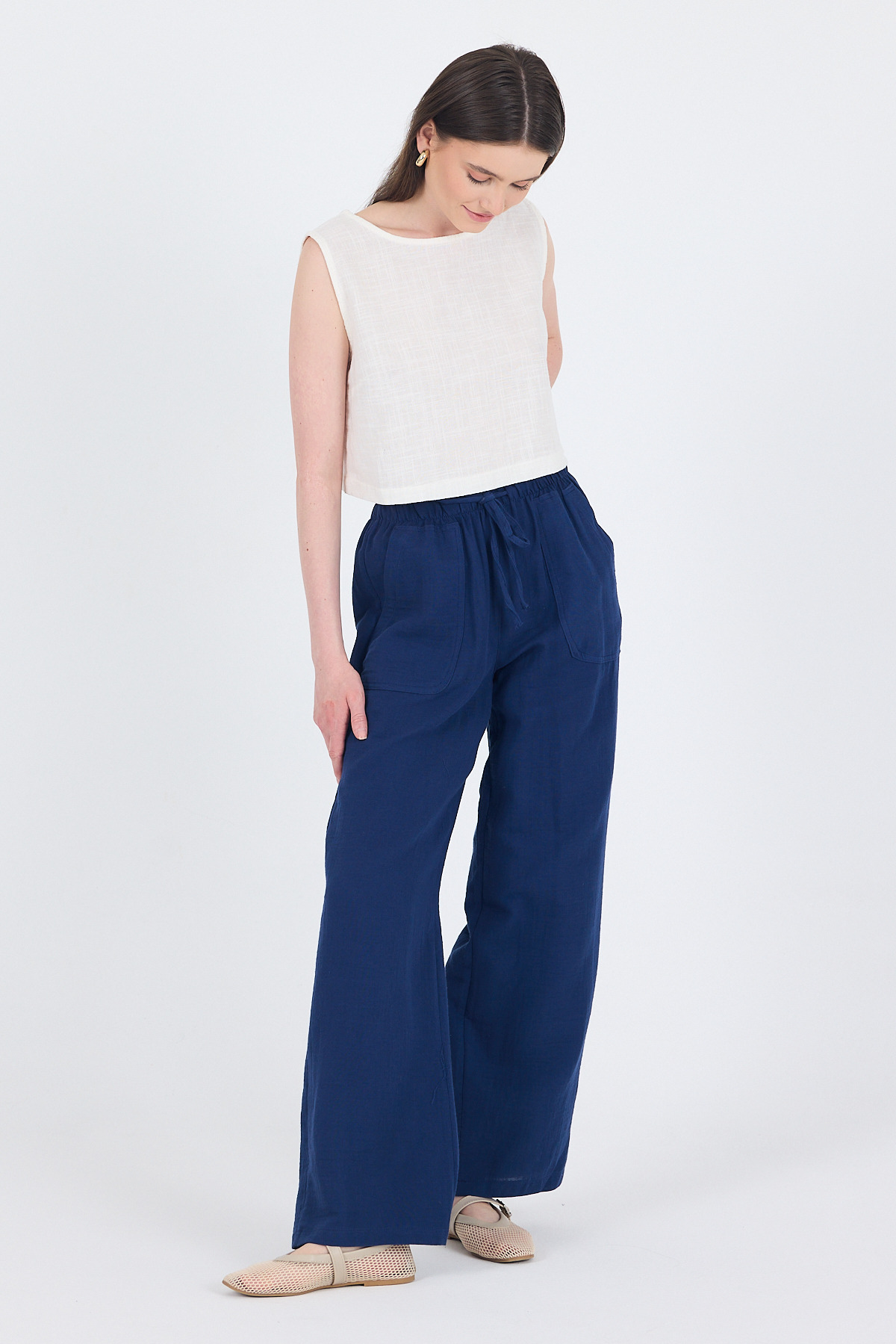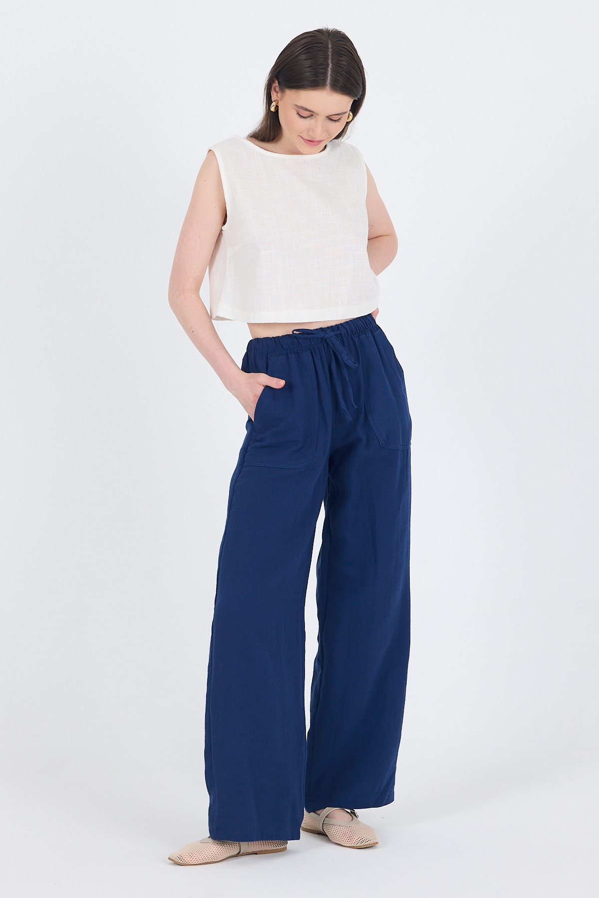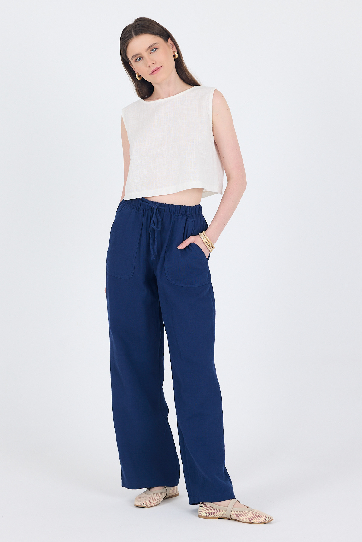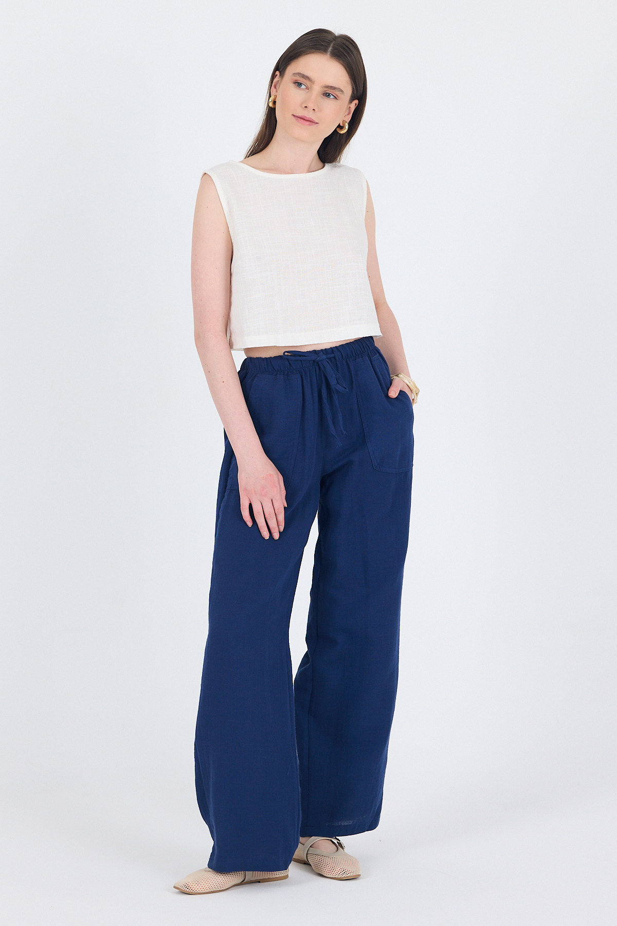 Laci Keten Görünümlü %100 Pamuk Cepli Bol Paça Pantolon 8054A