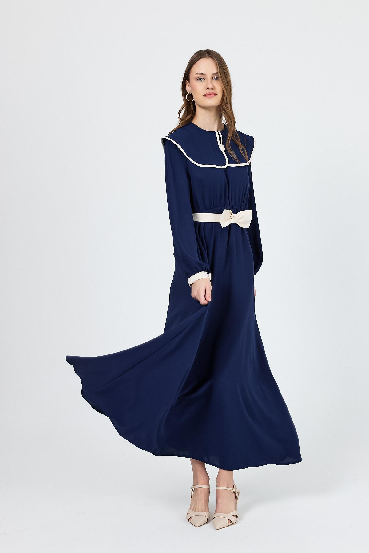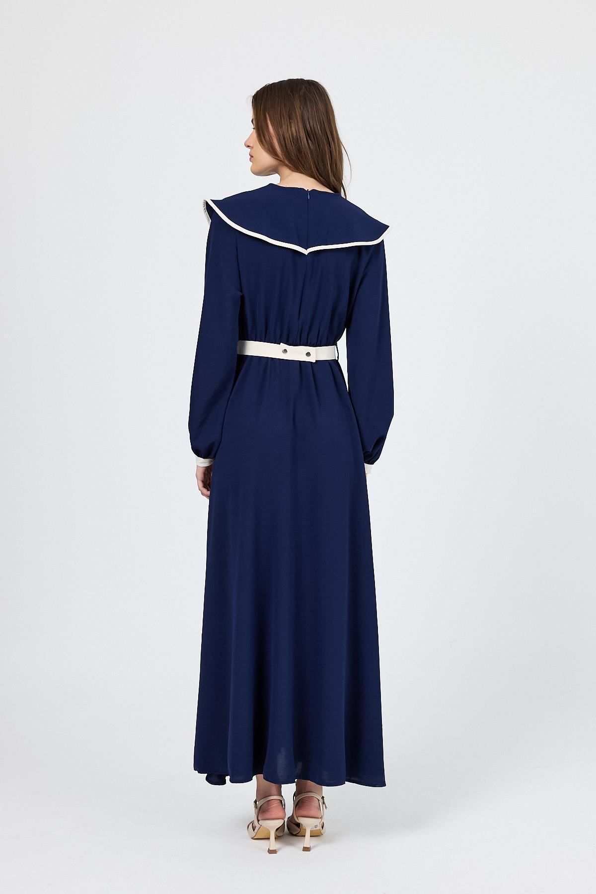 Lacivert Biye Detaylı Bebe Yaka Elbise 4413A