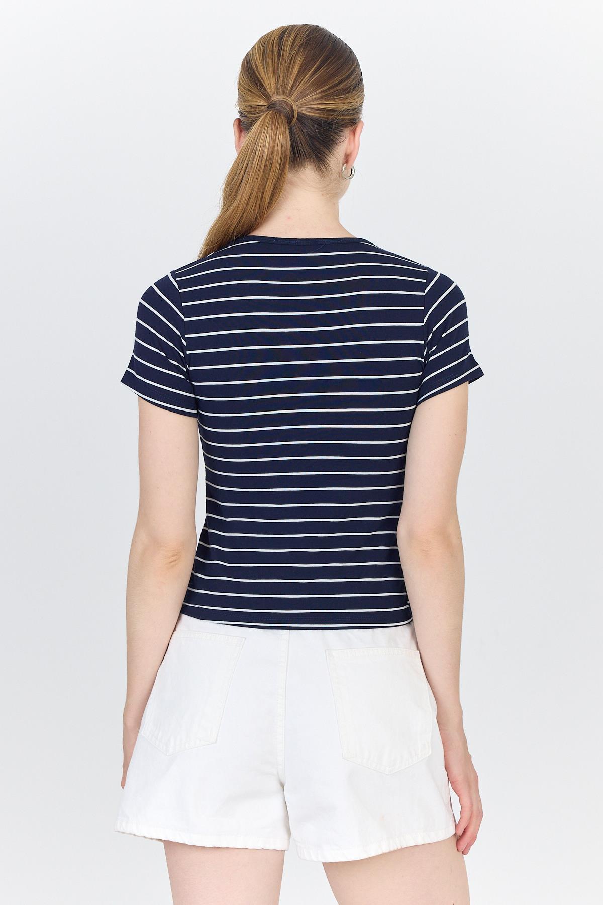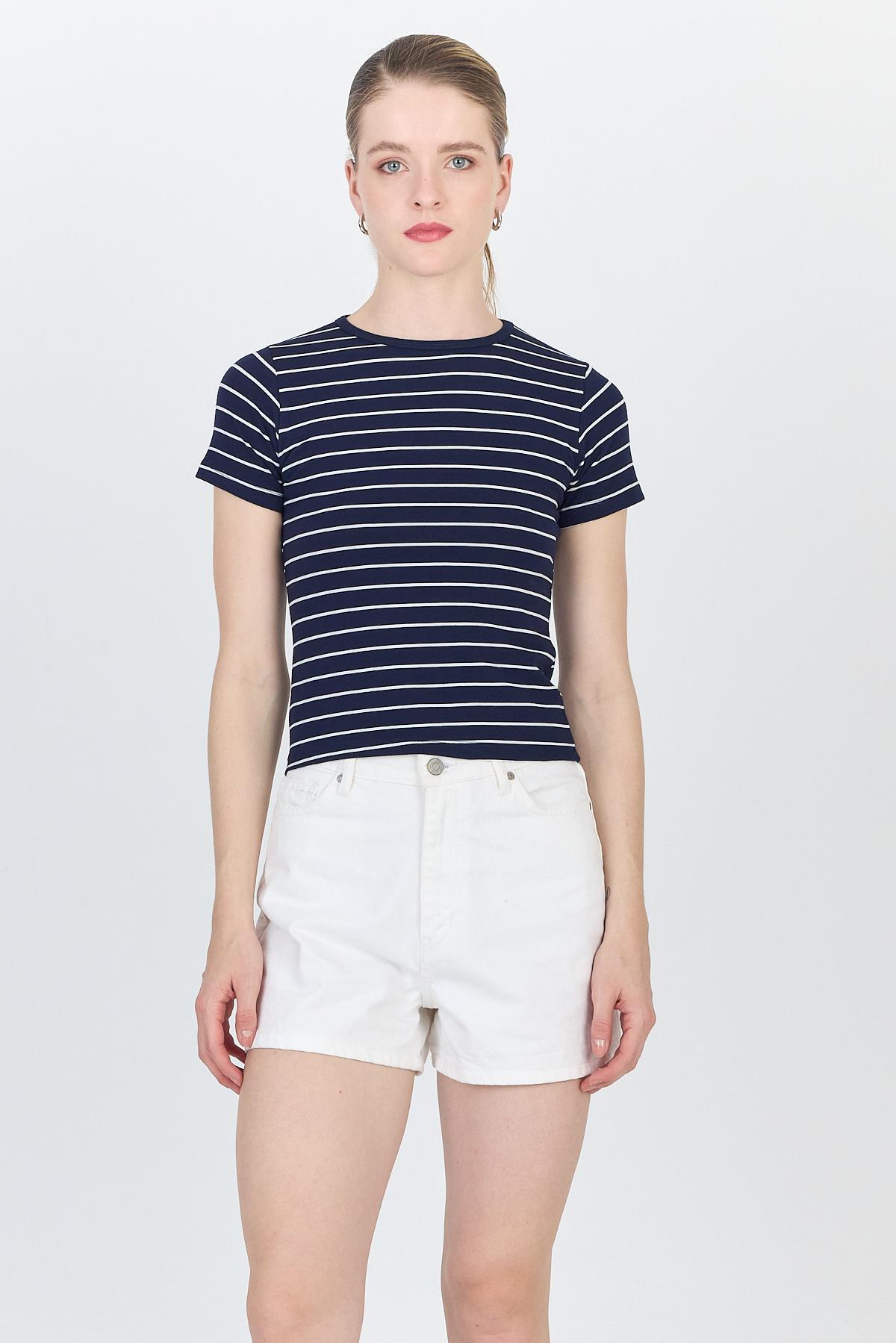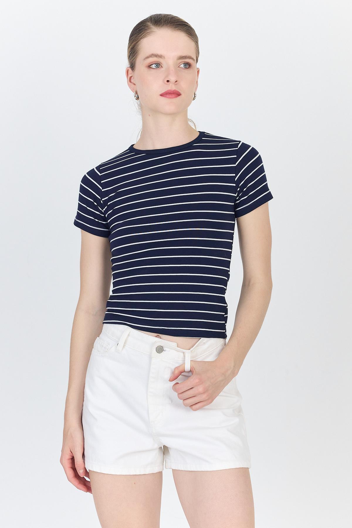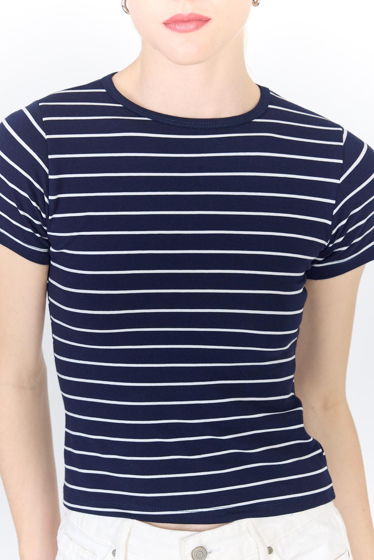 Lacivert Çizgili Pamuklu Crop Tişört 4014