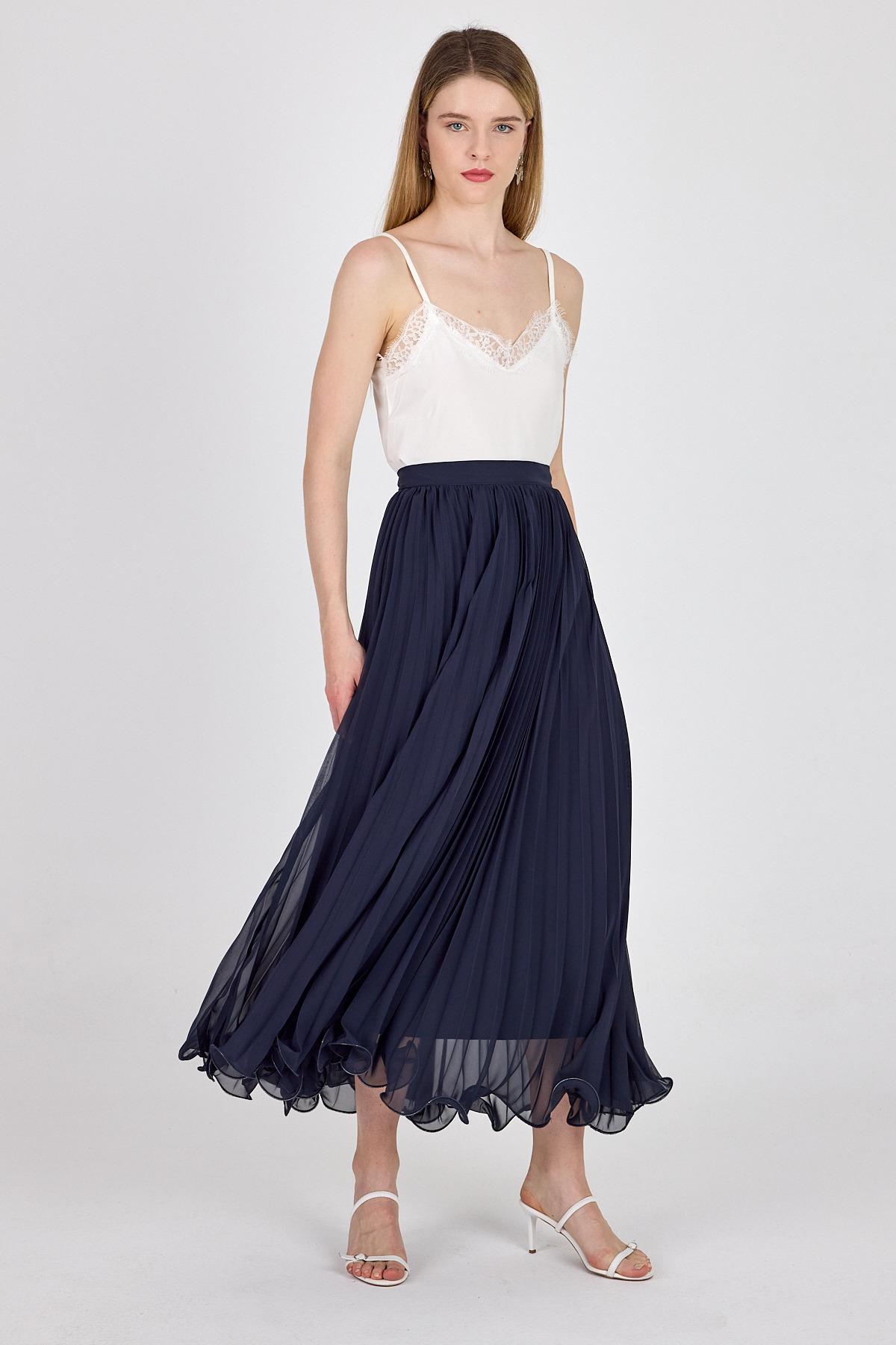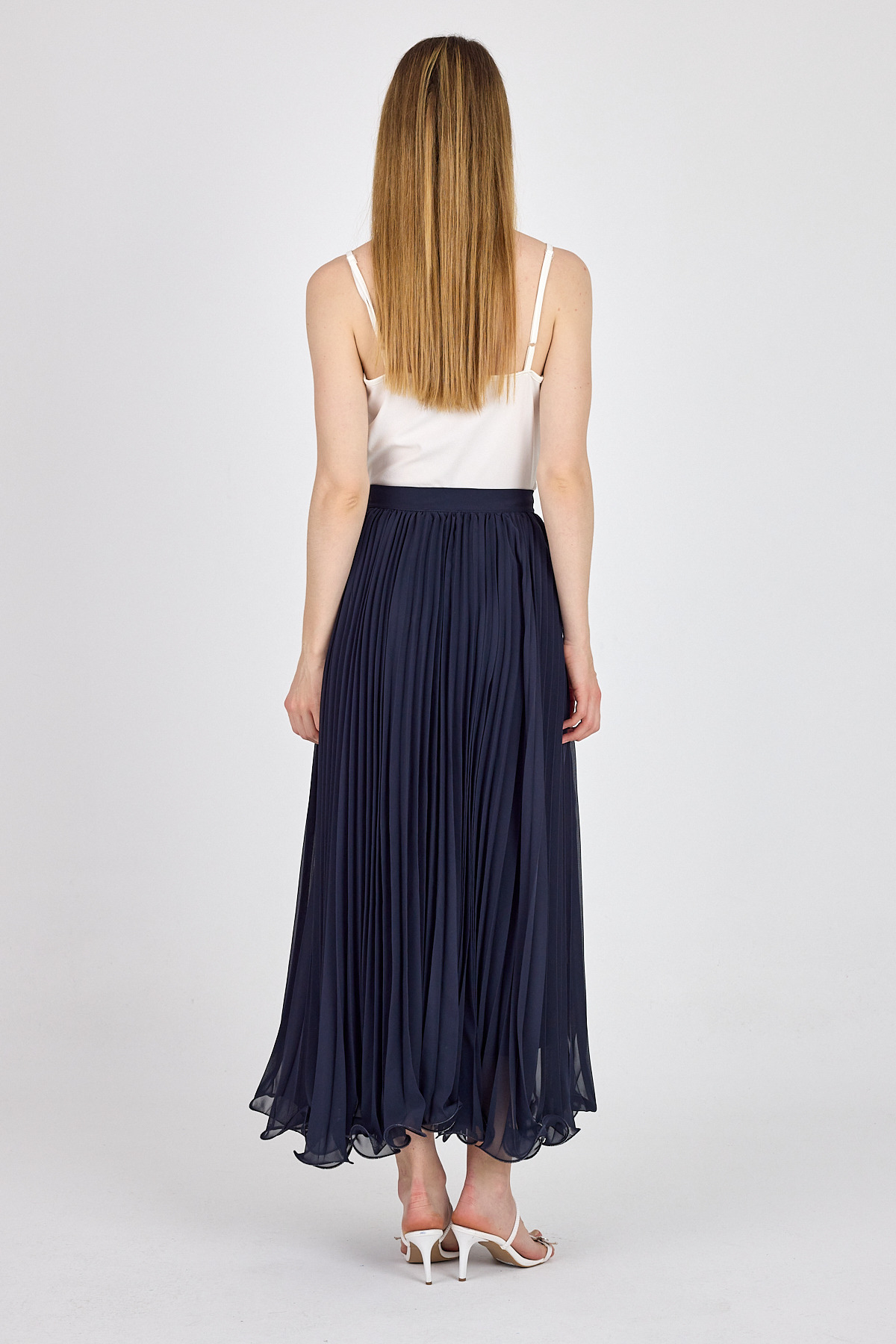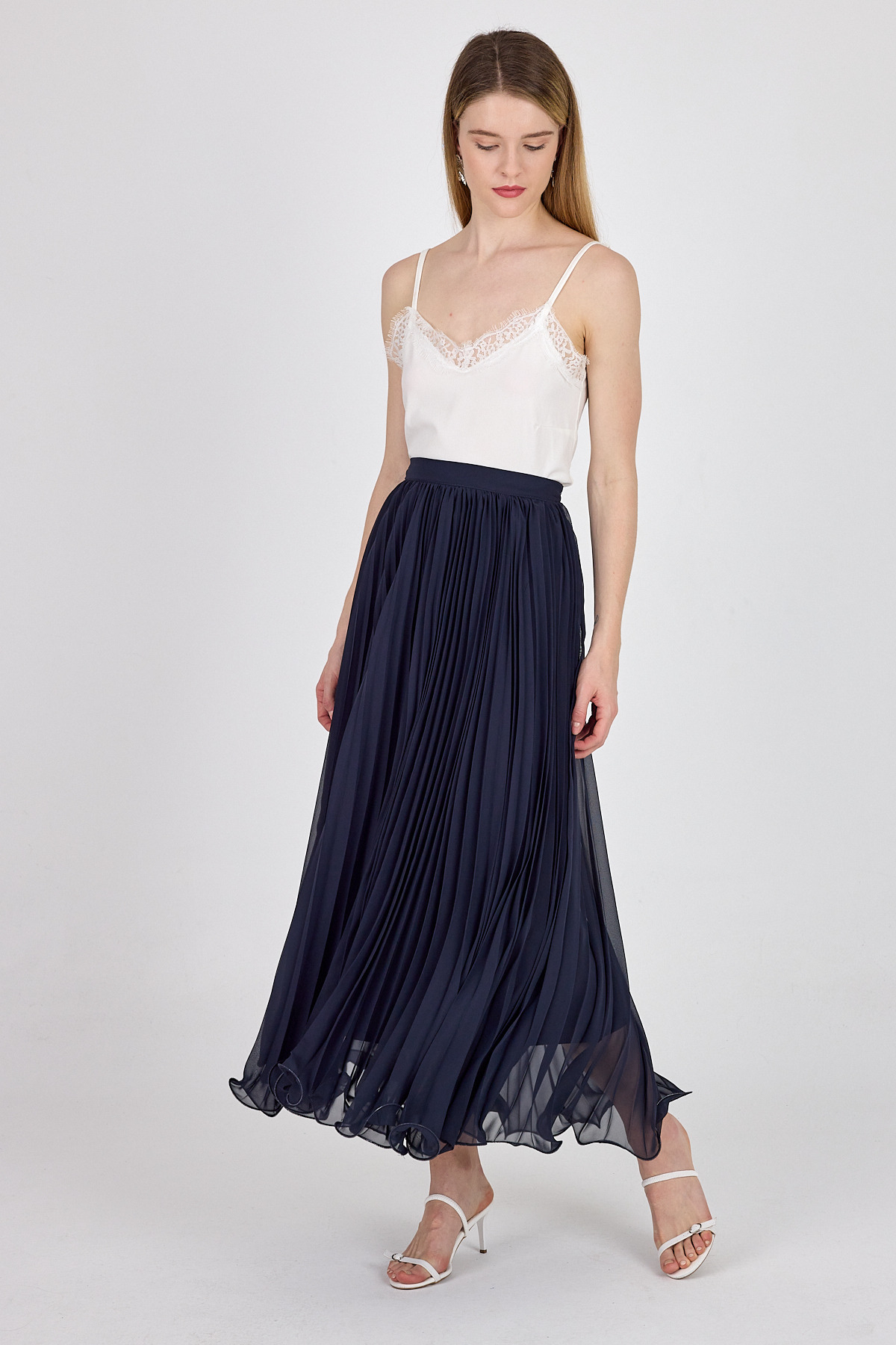 Lacivert Şifon Piliseli Yüksek Bel Maxi Etek 1003