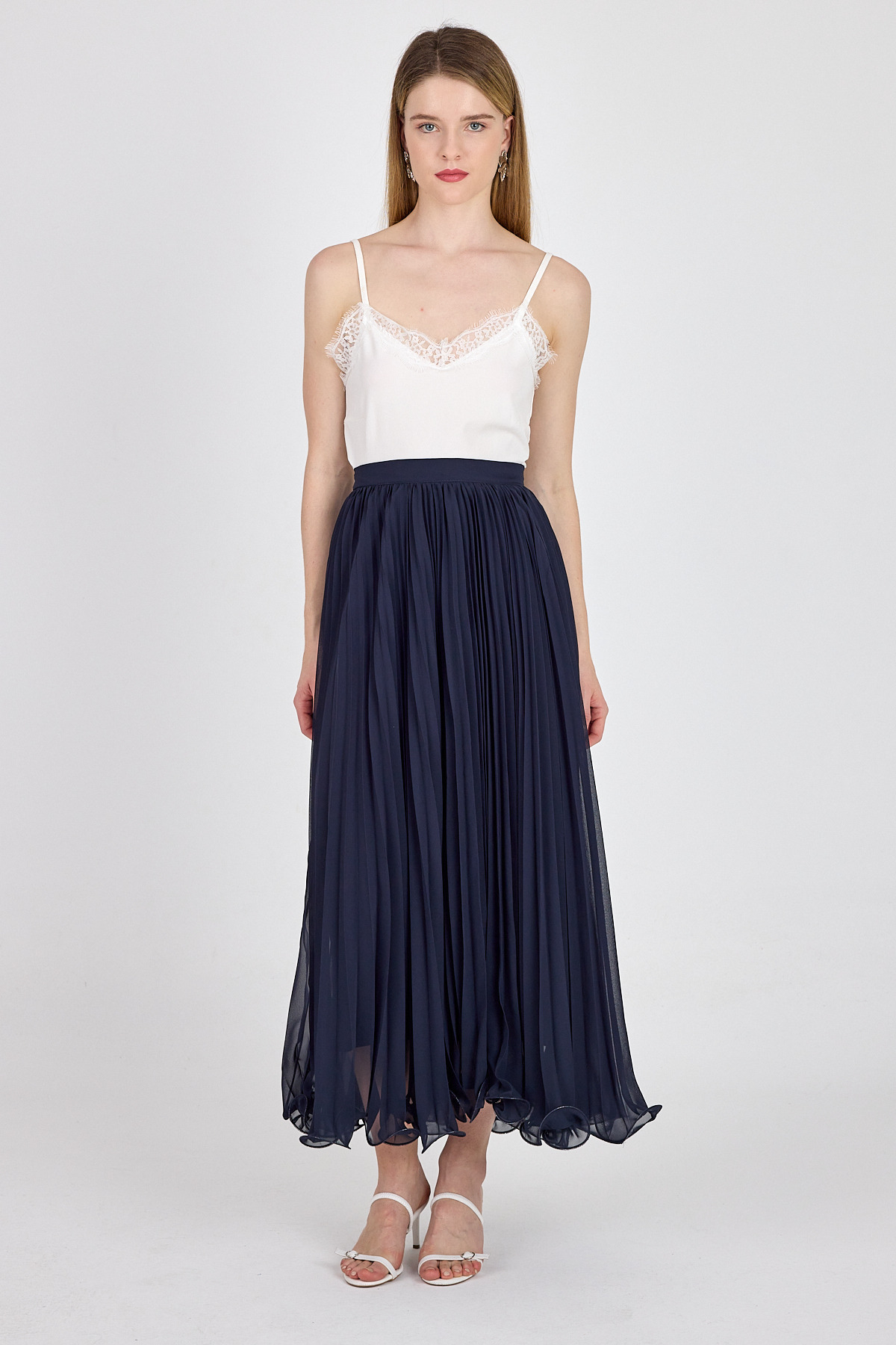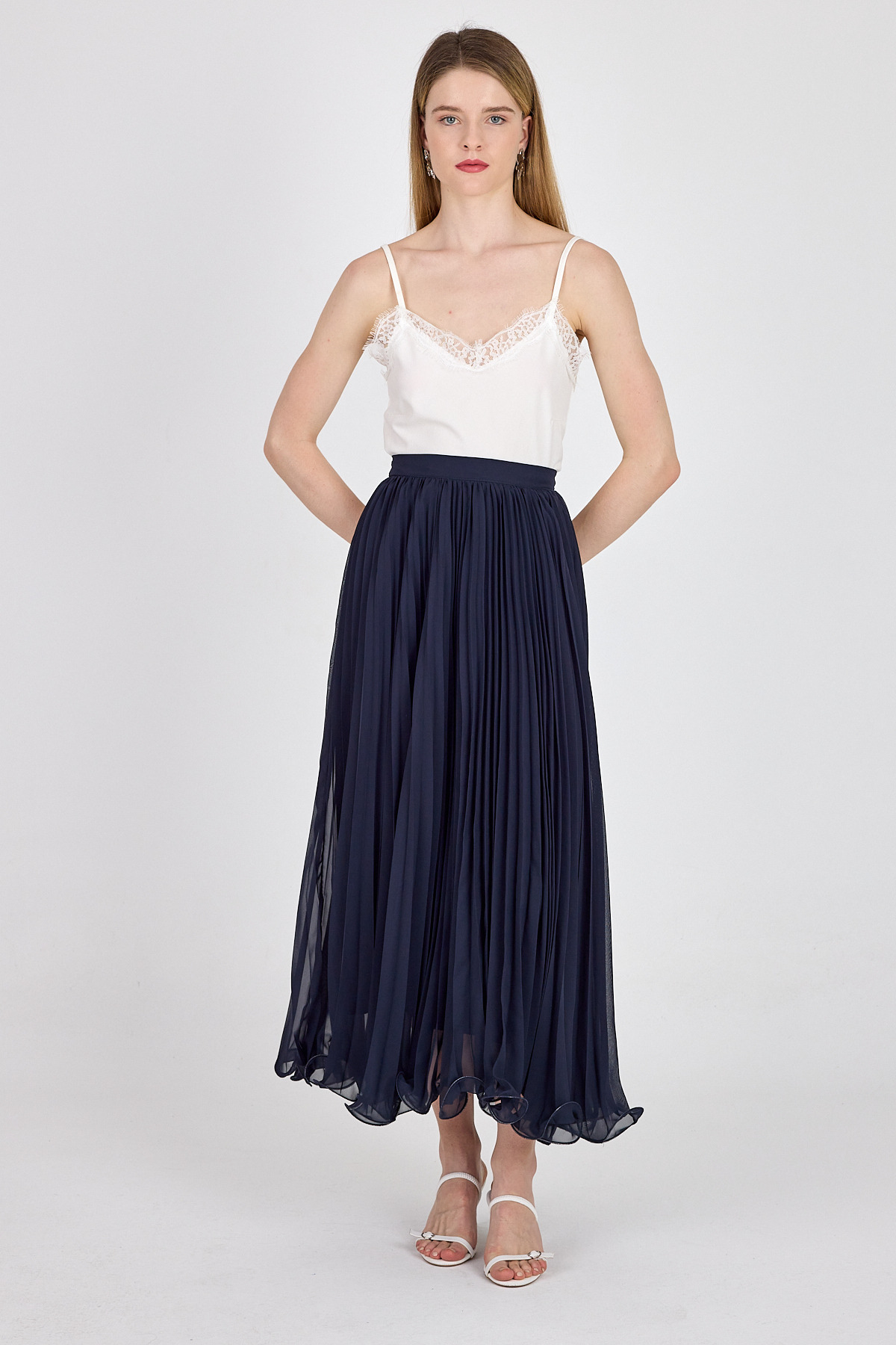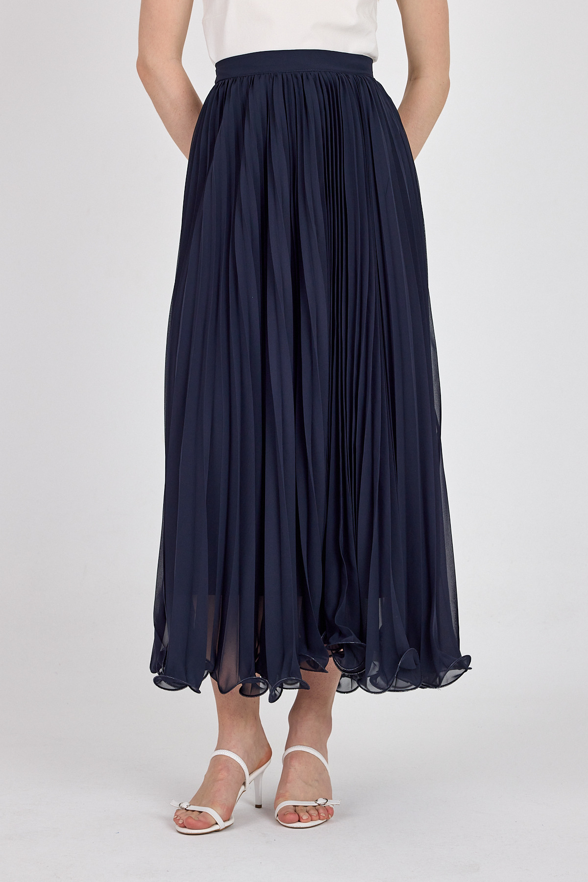 Lacivert Şifon Piliseli Yüksek Bel Maxi Etek 1003